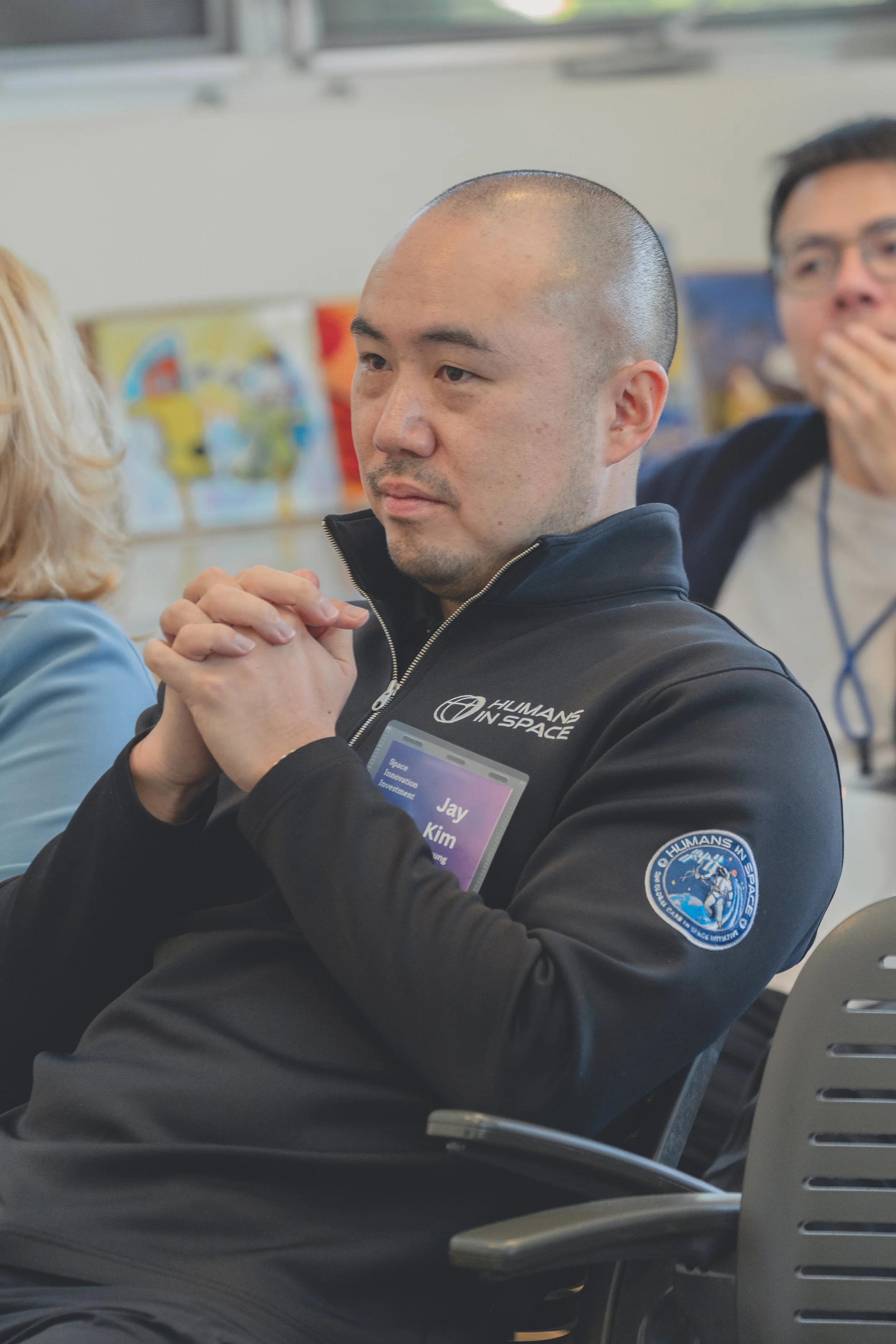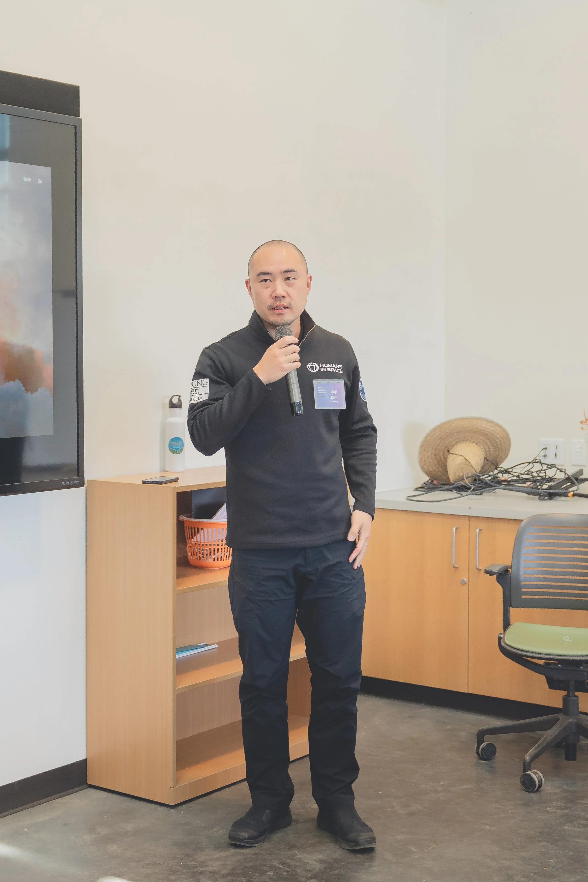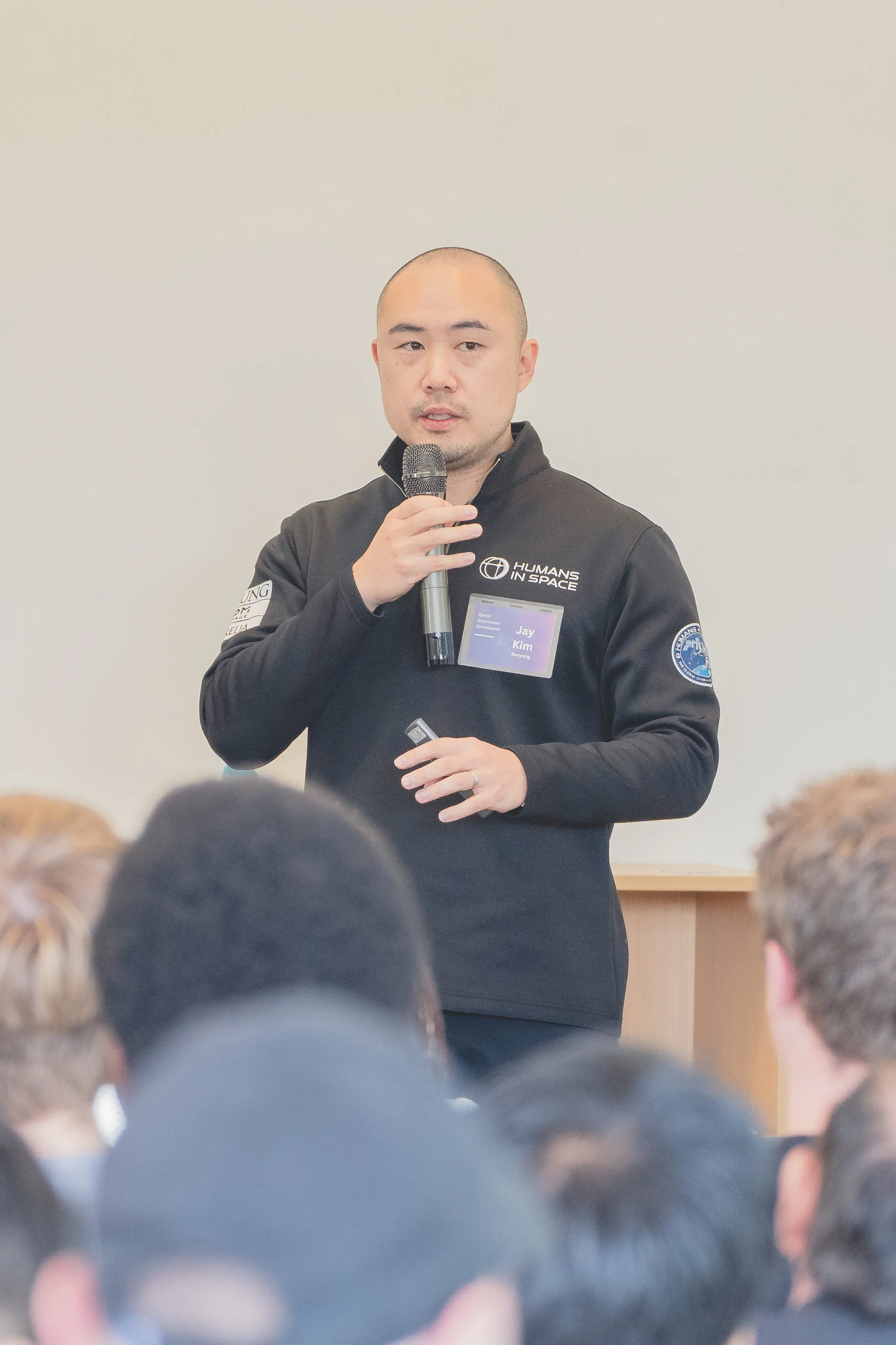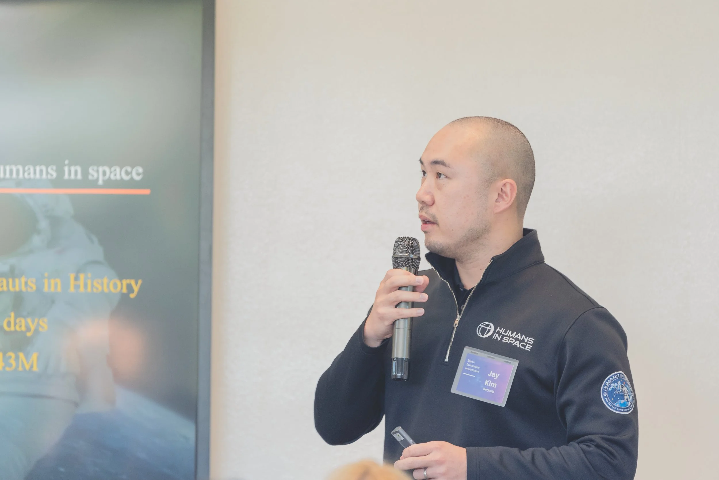 A person holding a microphone, wearing a "Humans in Space" jacket with a patch on the sleeve and a name tag reading Jay Kim.