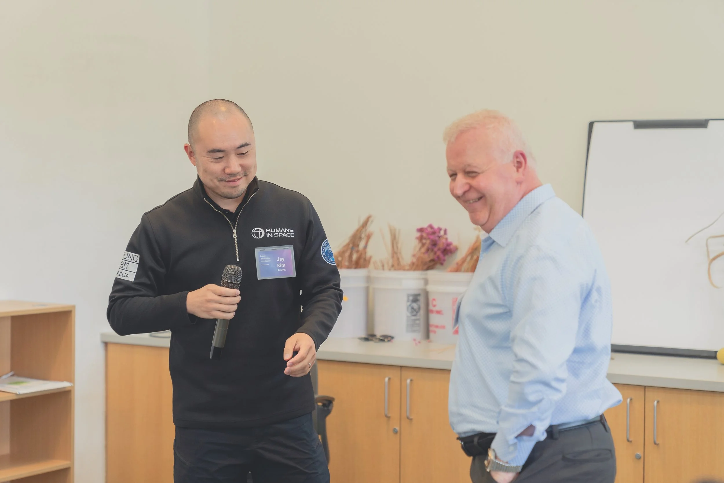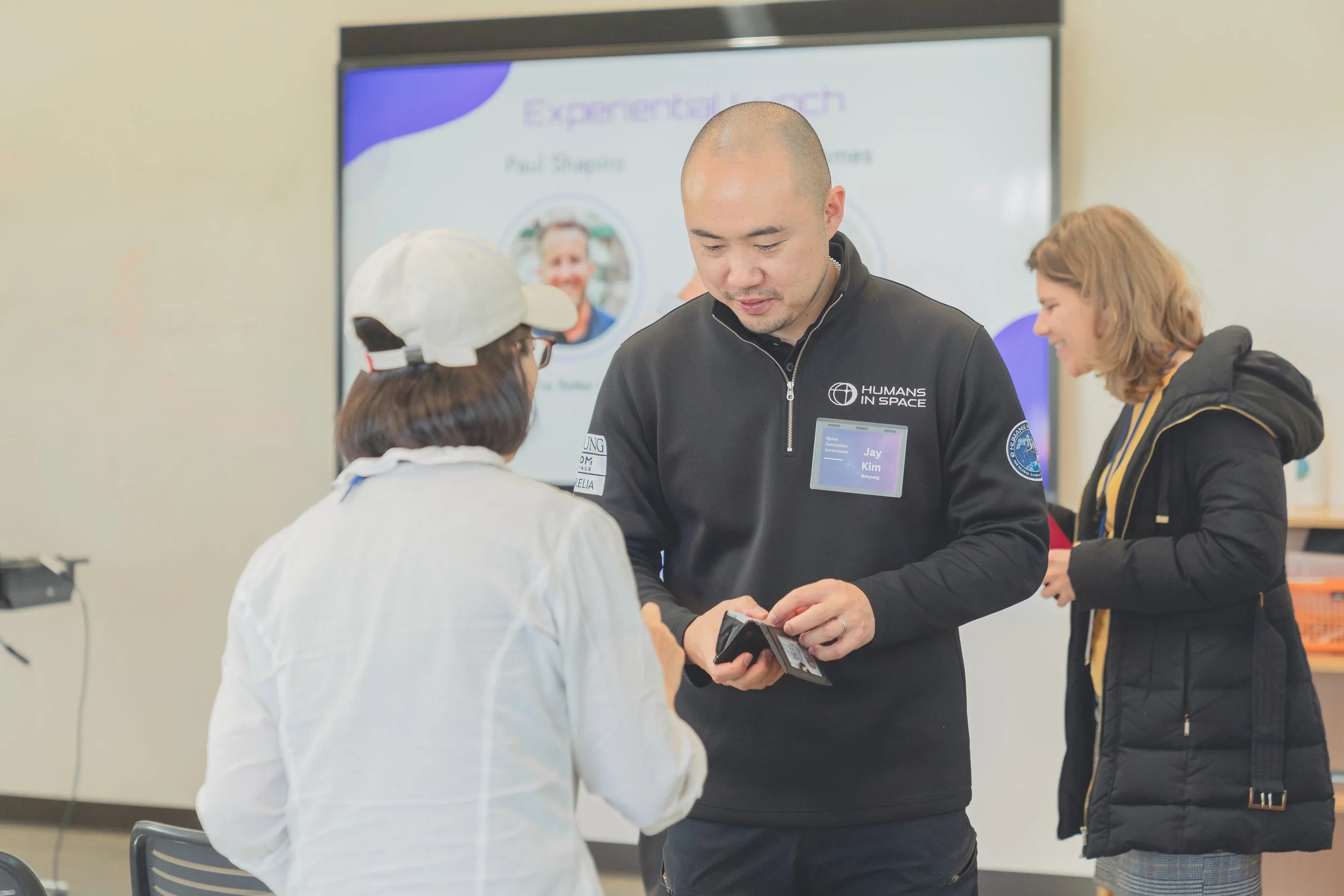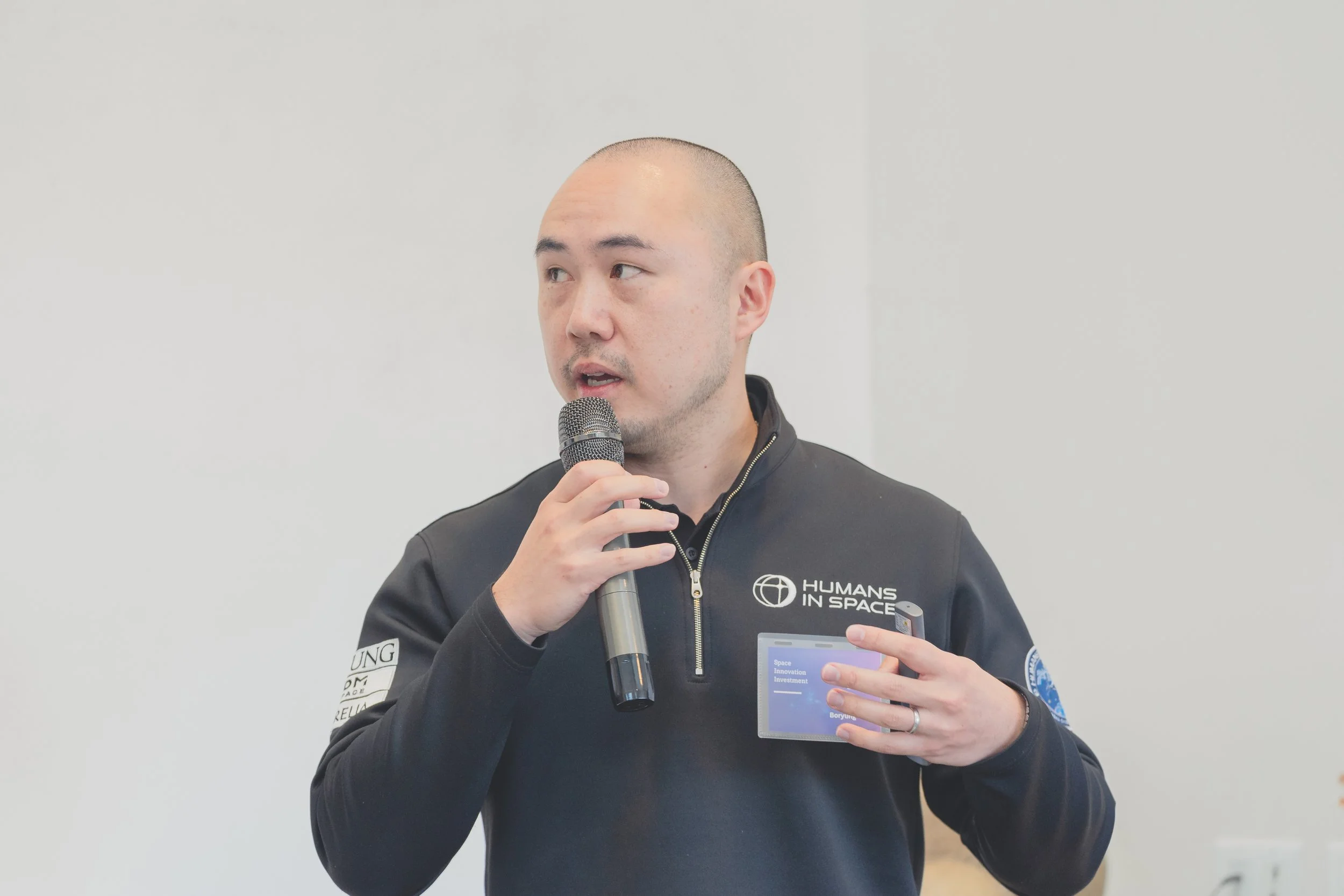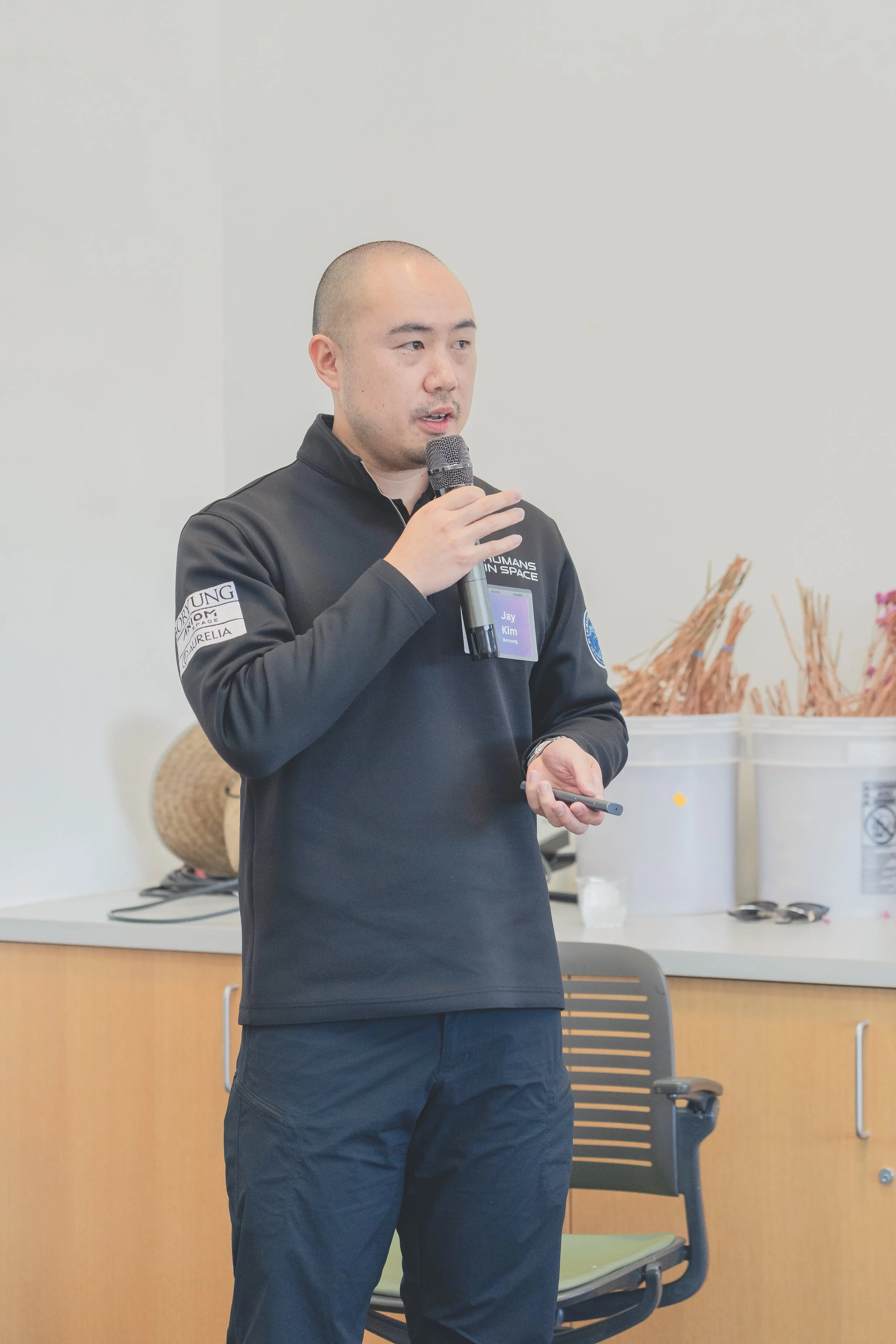 A person holding a microphone, wearing a "Humans in Space" jacket with a patch on the sleeve and a name tag reading Jay Kim.