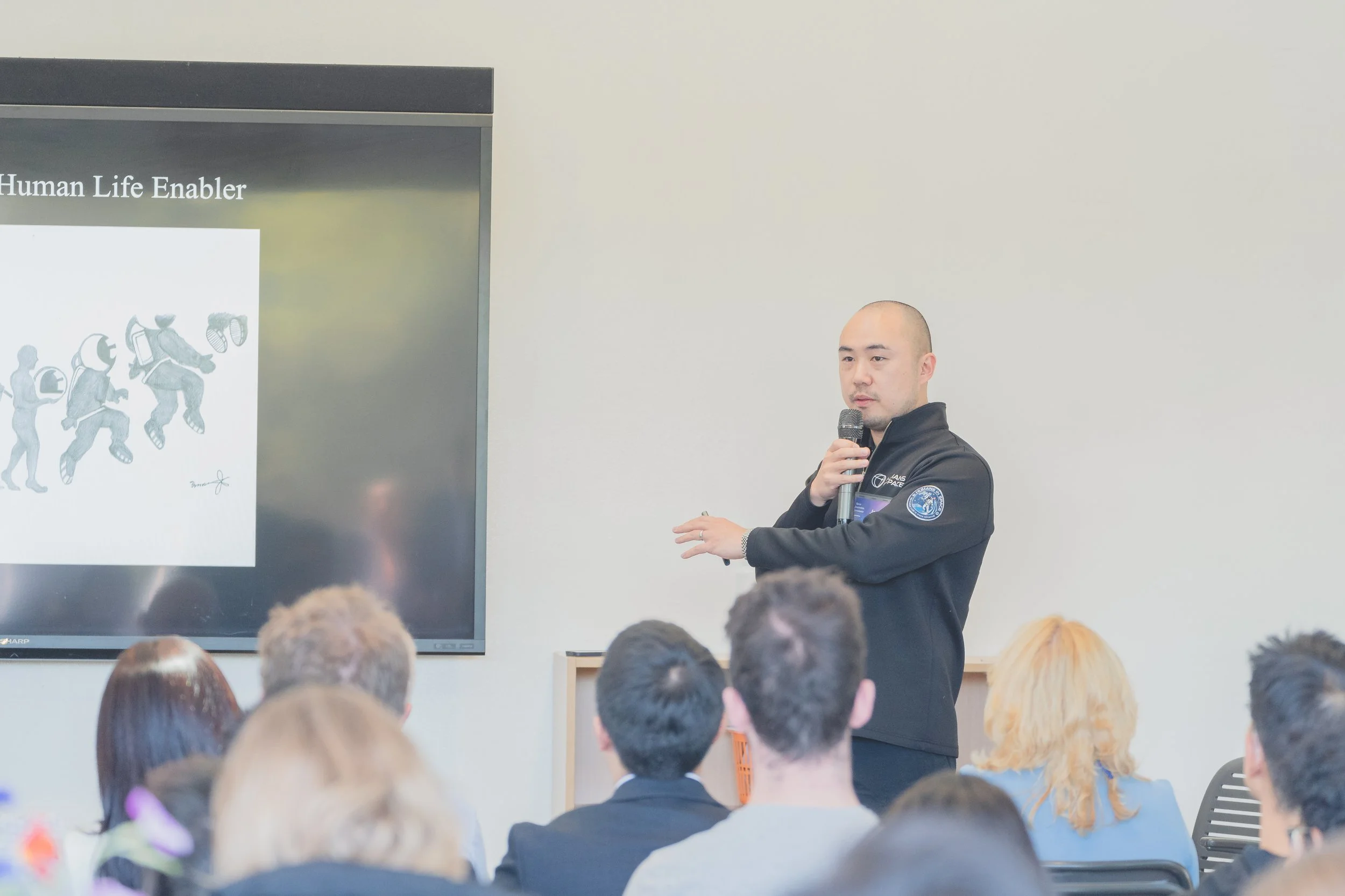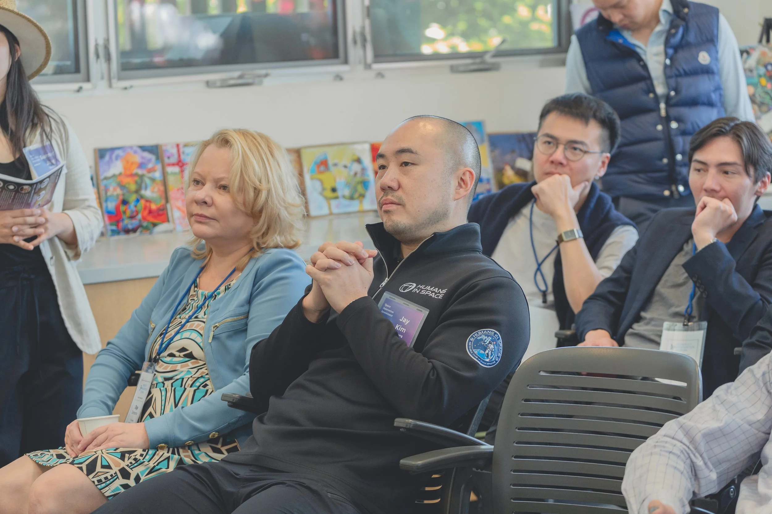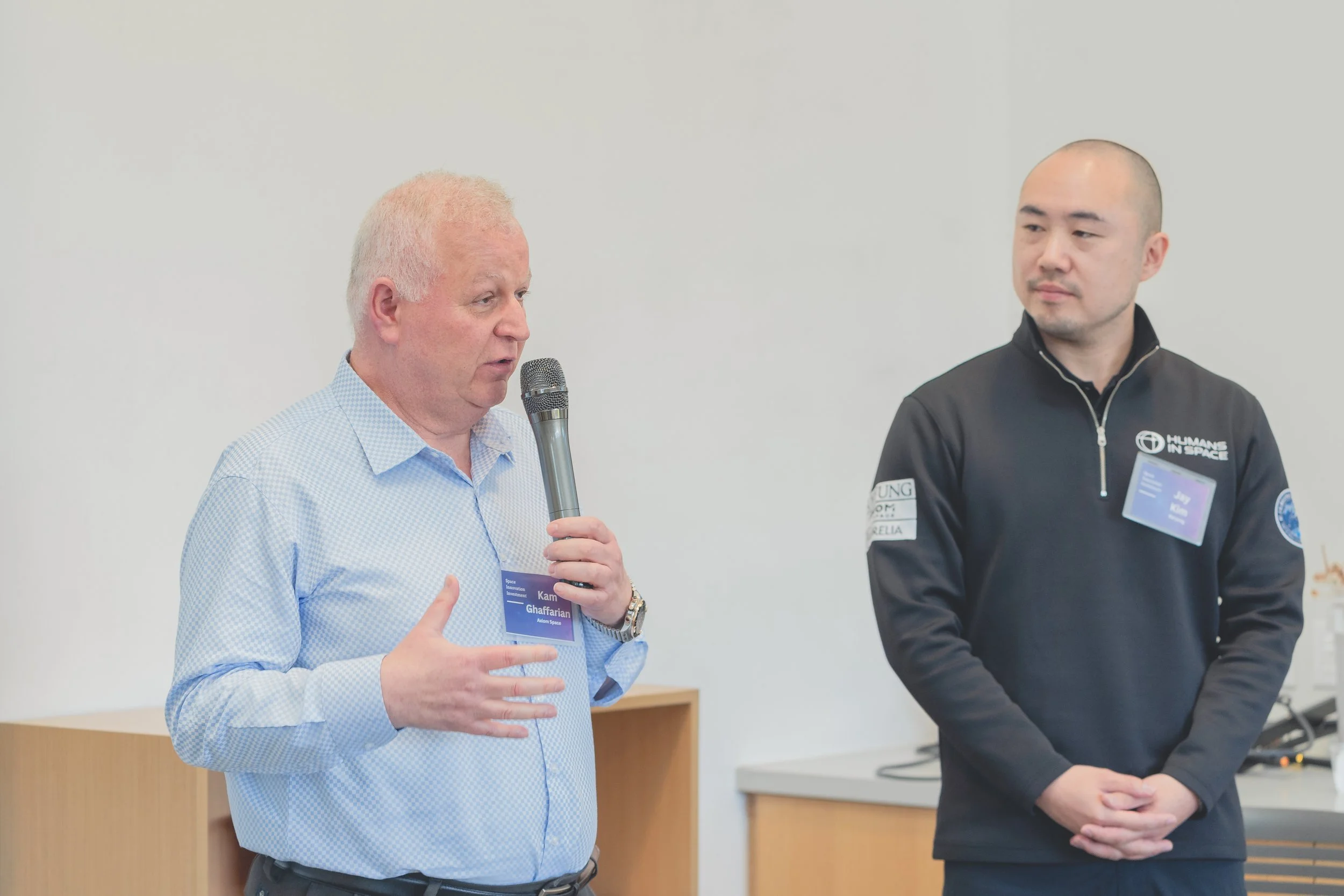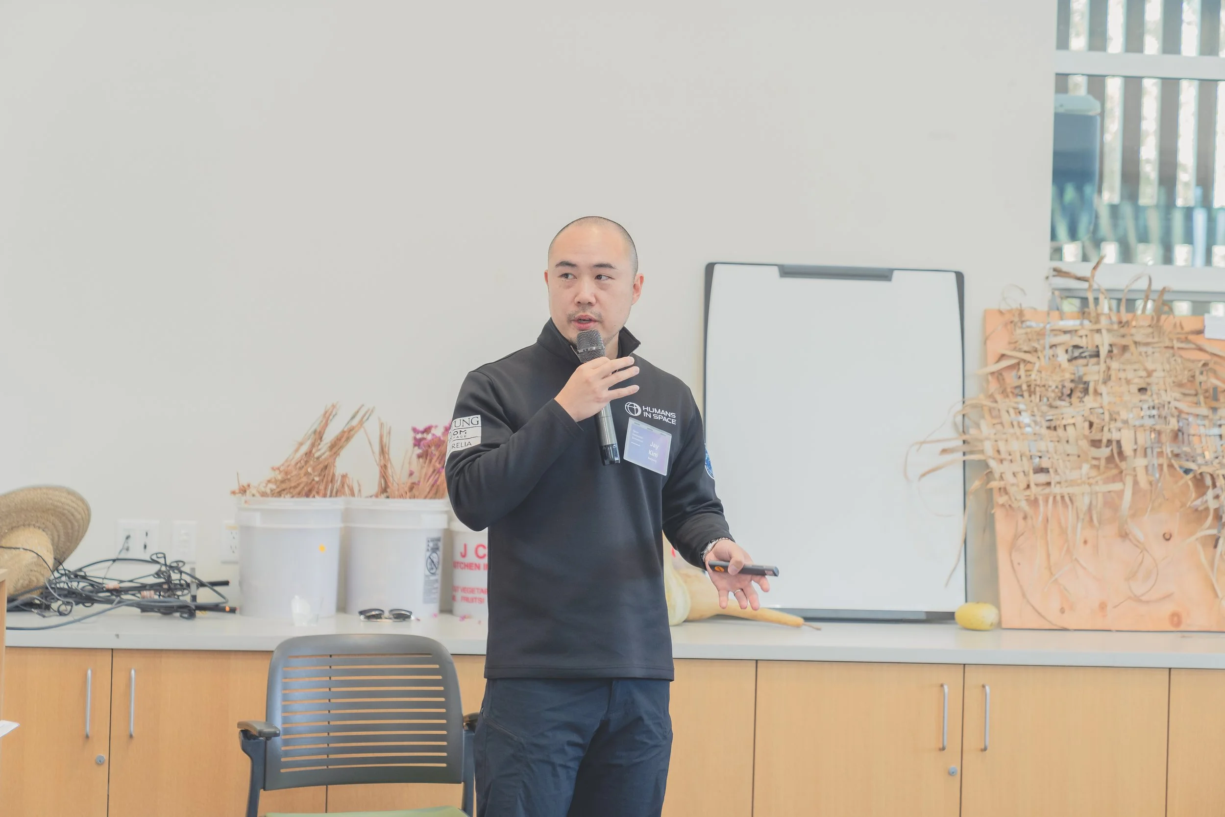 A person holding a microphone, wearing a "Humans in Space" jacket with a patch on the sleeve and a name tag reading Jay Kim.