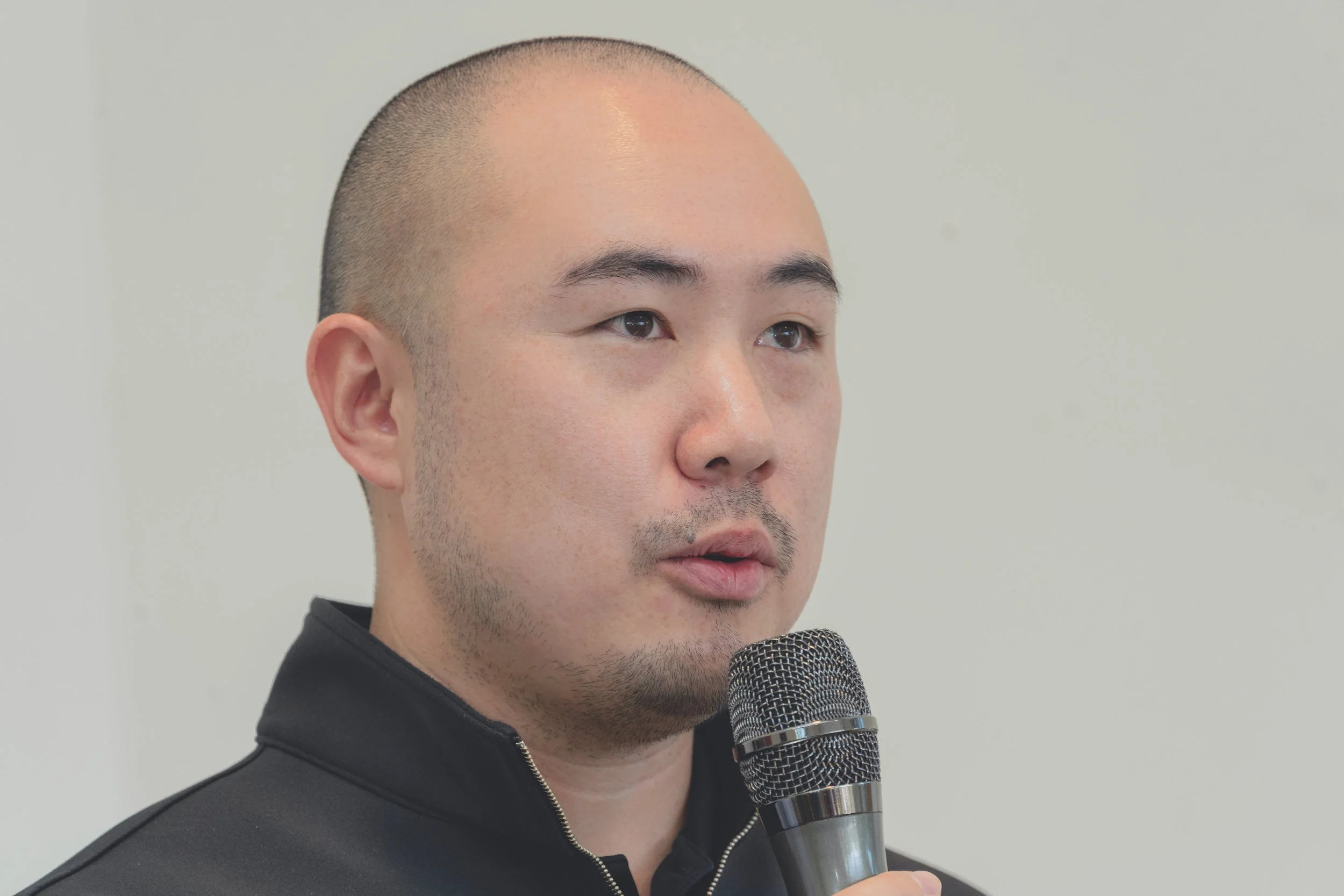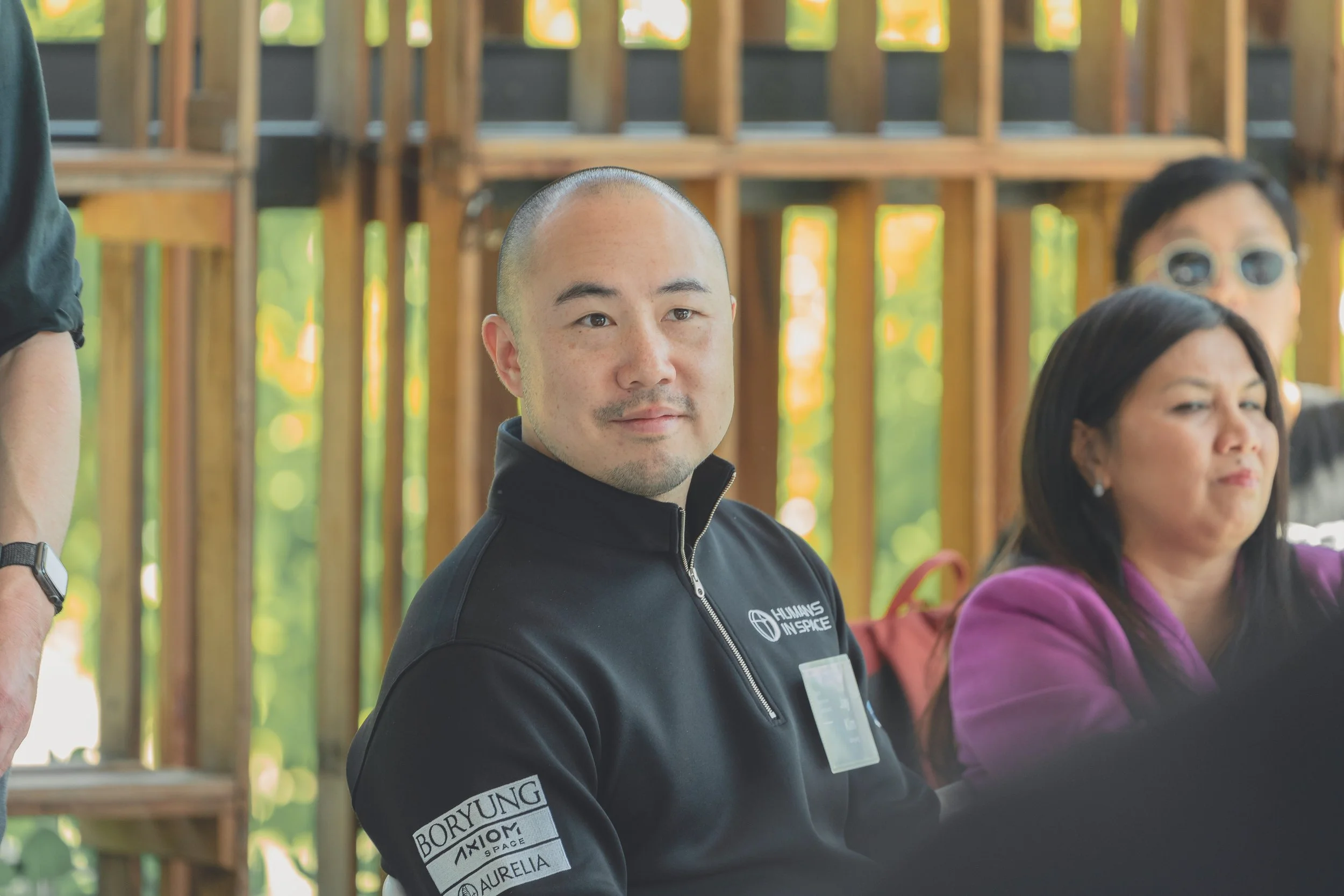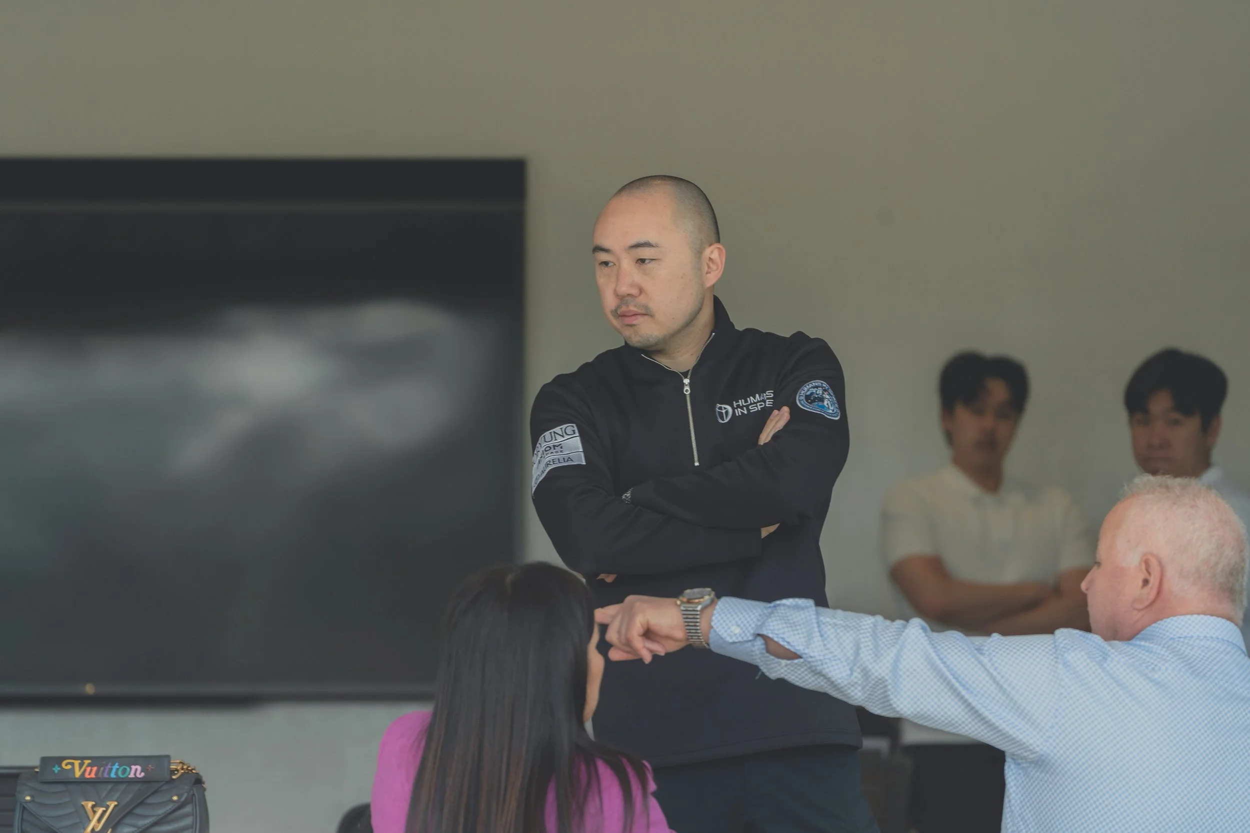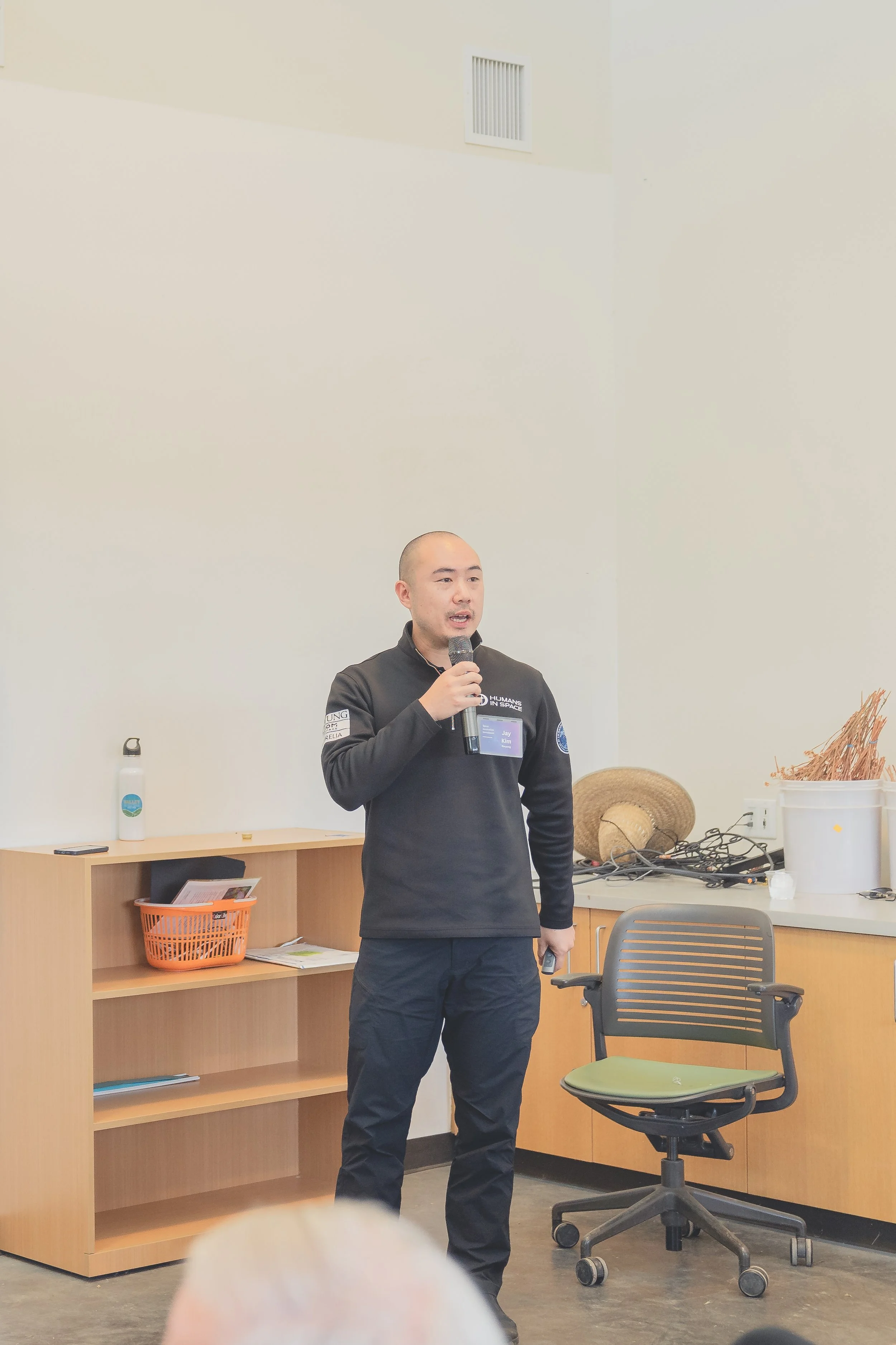 A person holding a microphone, wearing a "Humans in Space" jacket with a patch on the sleeve and a name tag reading Jay Kim.