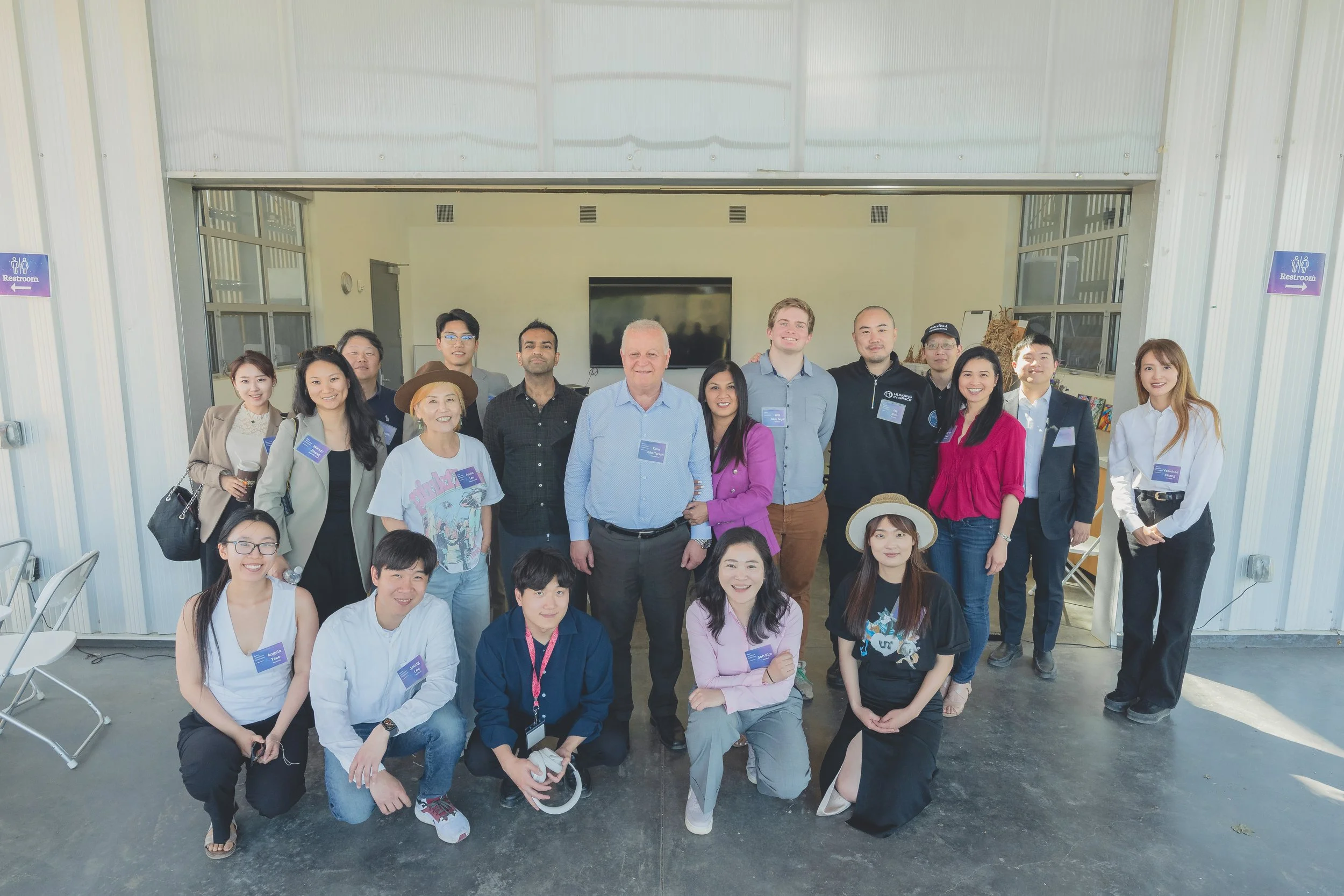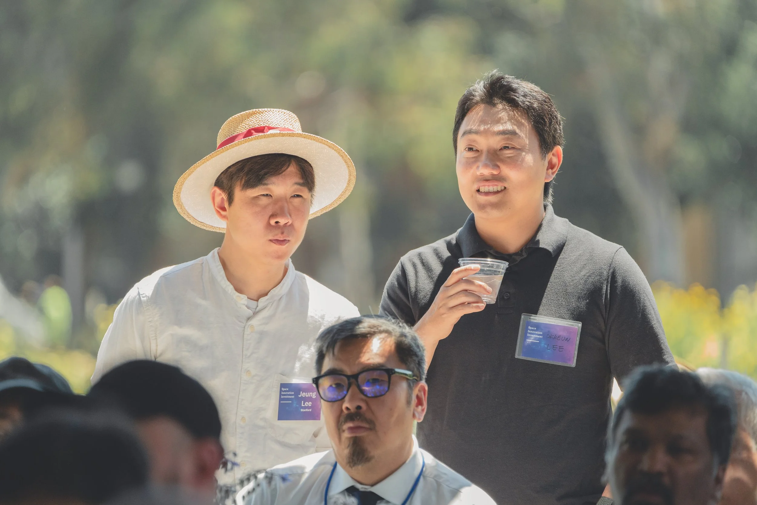 Three men posing for a photo in front of a screen displaying 'Space Innovation & Investment' hosted by the Stanford Center for Innovation and Design Research. One man is wearing a hat and making a peace sign.