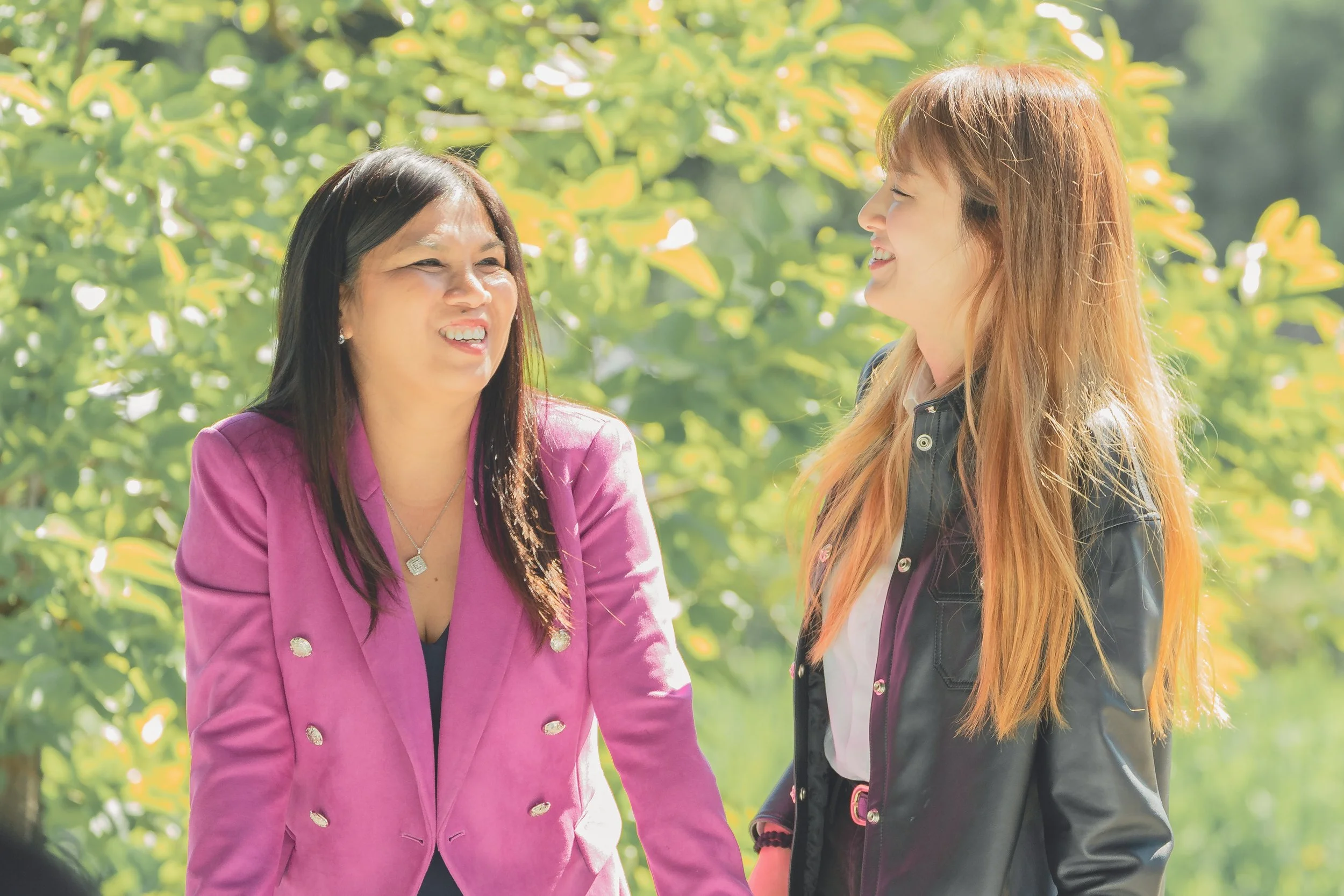 Two women laughing and standing outdoors with greenery in the background. One is wearing a pink blazer and the other a black jacket. They appear to be enjoying each other's company in a sunny setting.
