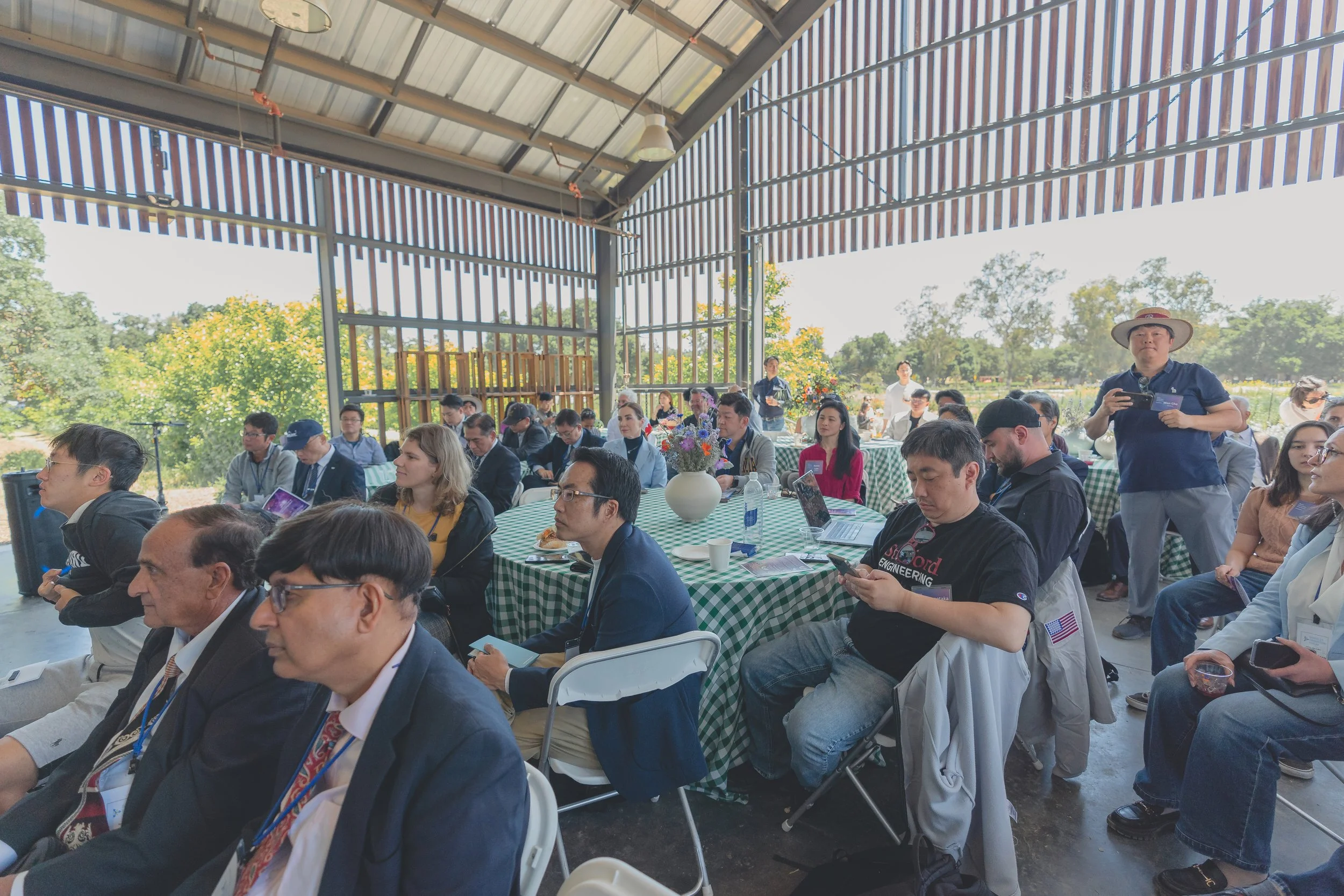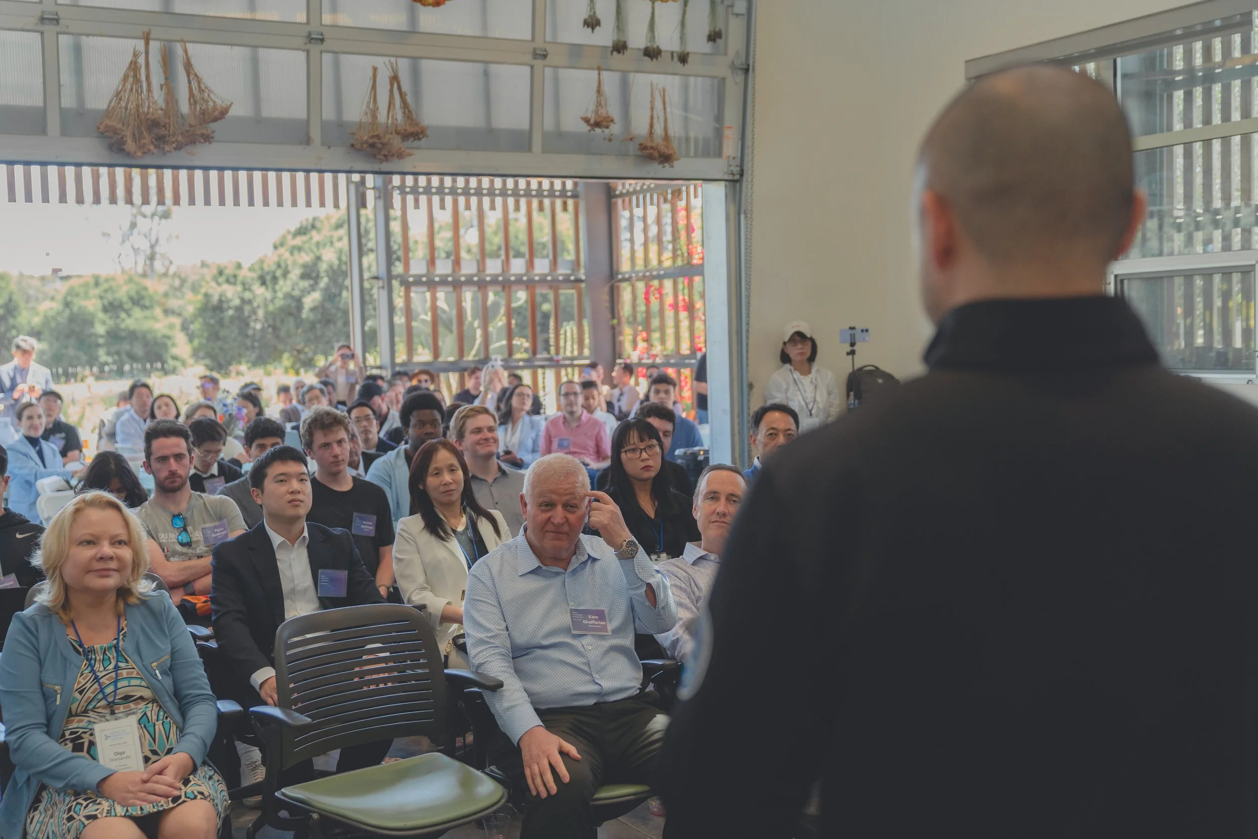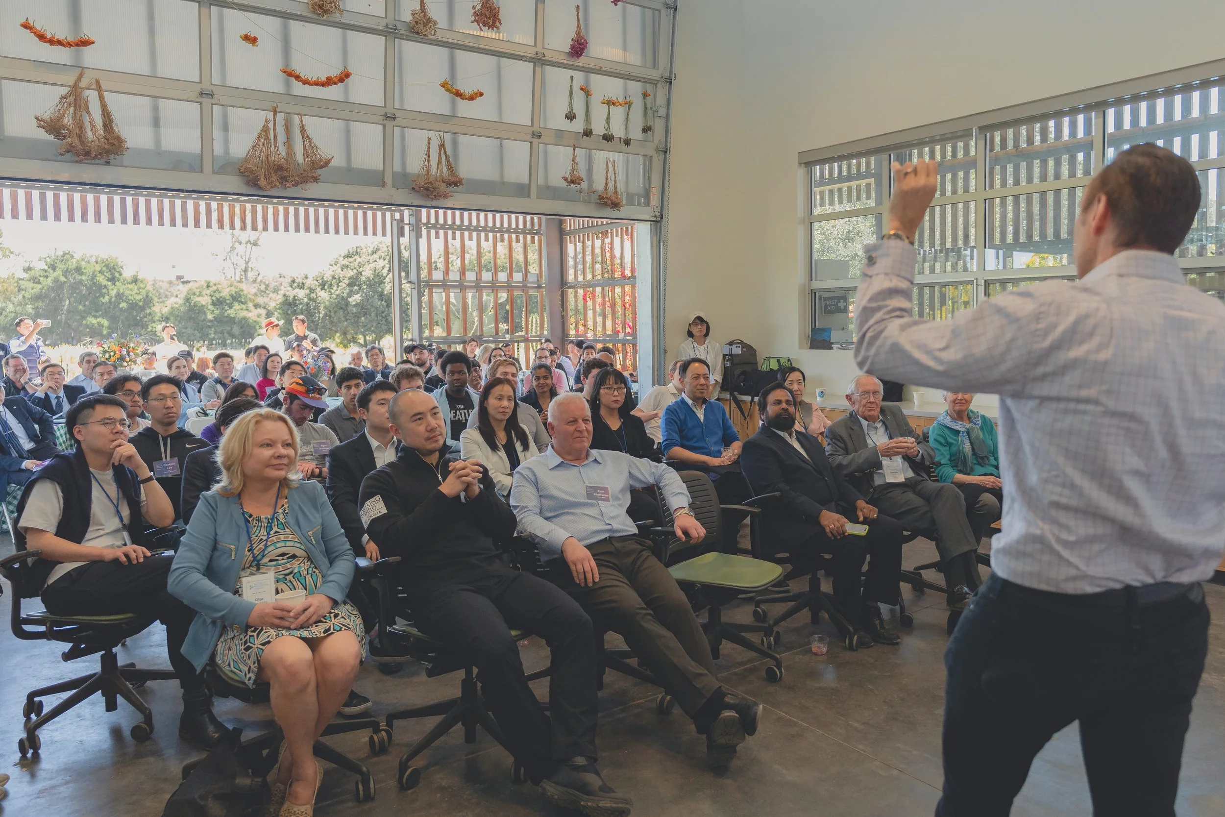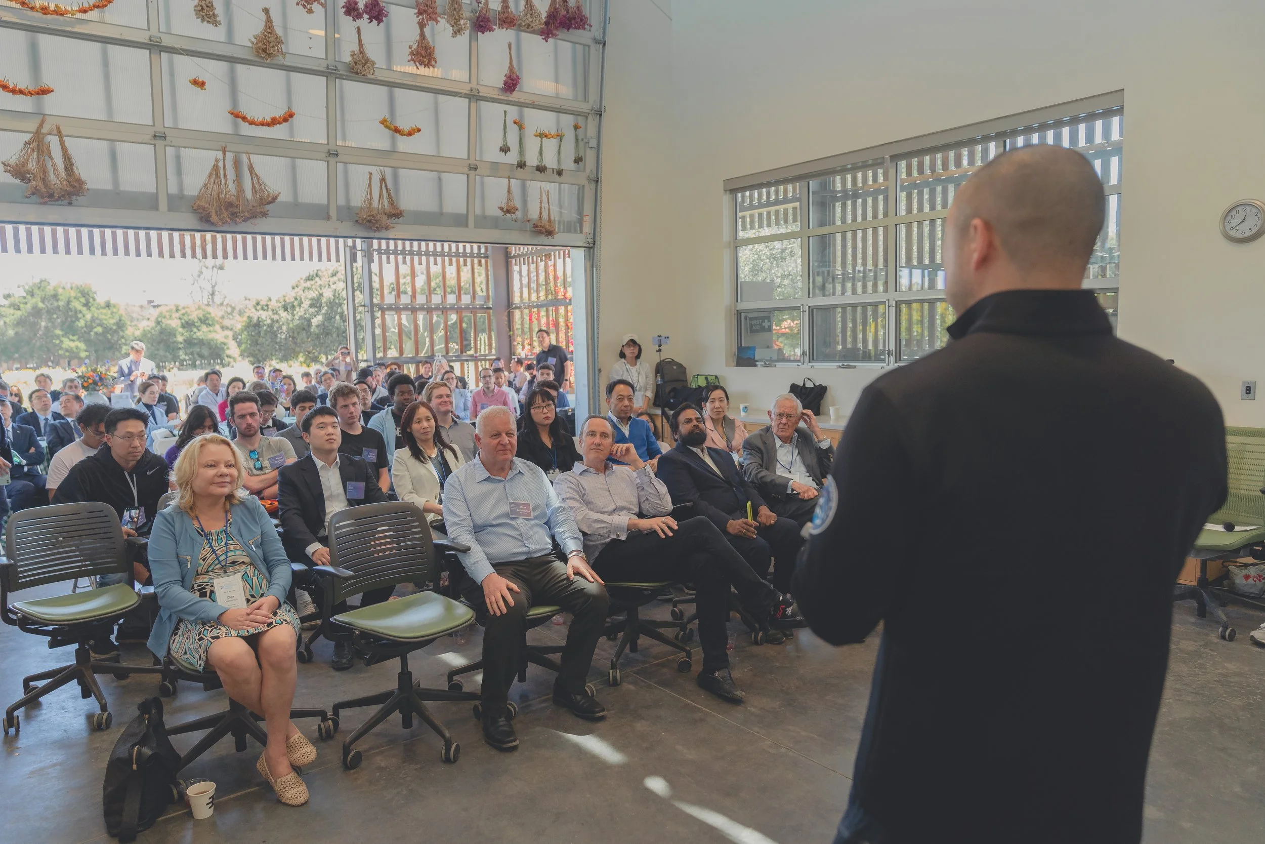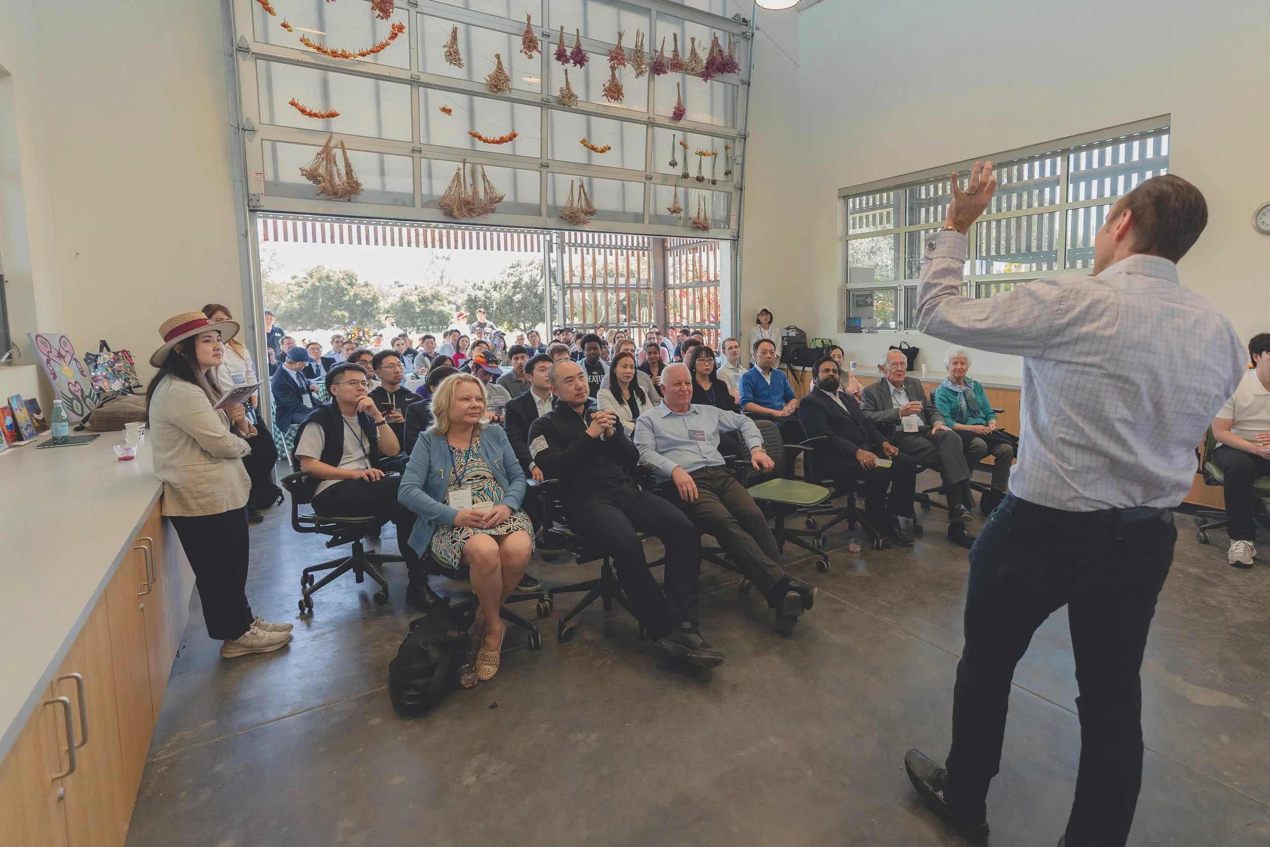 A presenter speaks to an audience in a modern indoor venue with large windows and natural decor. Attendees are seated and some stand in the background.