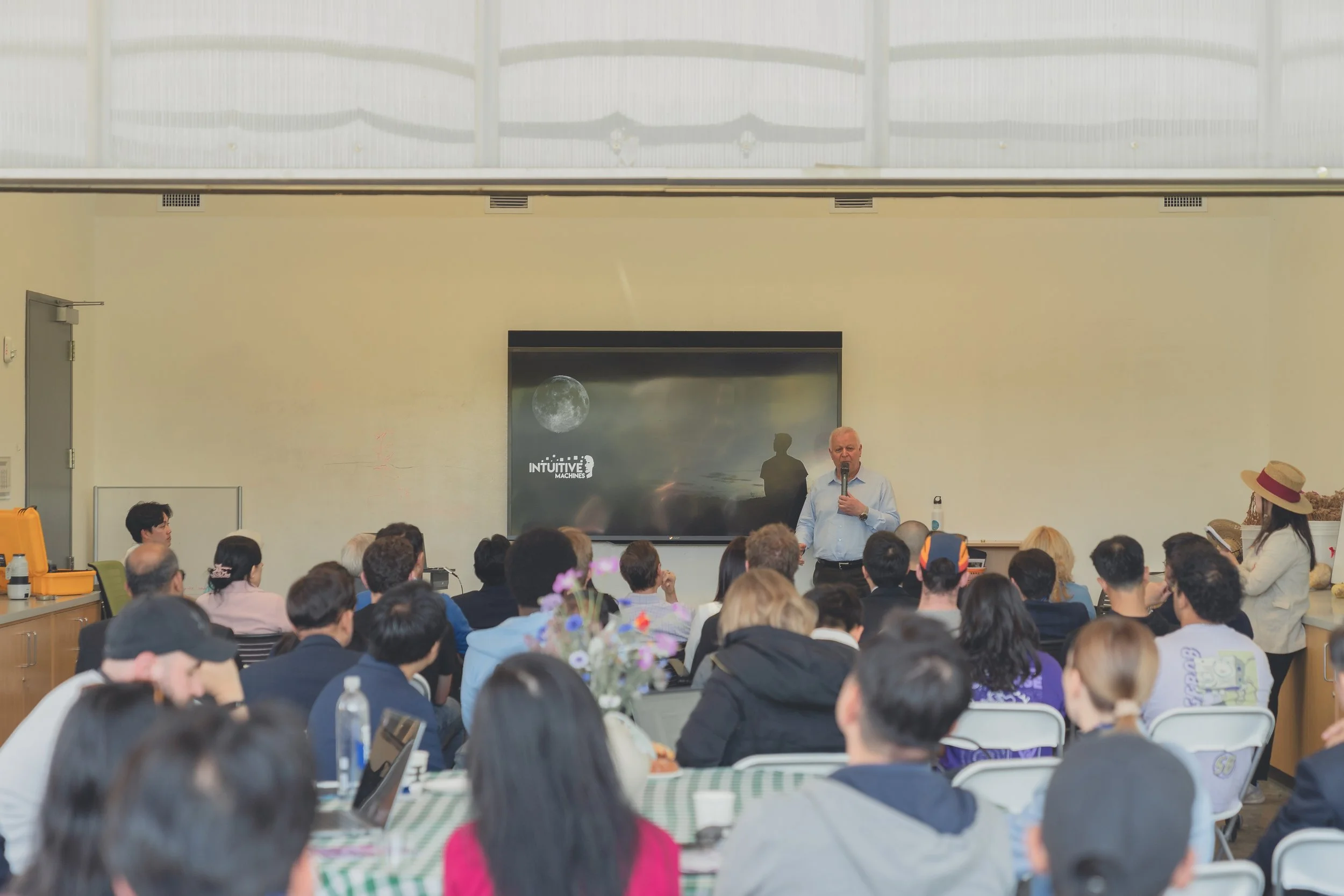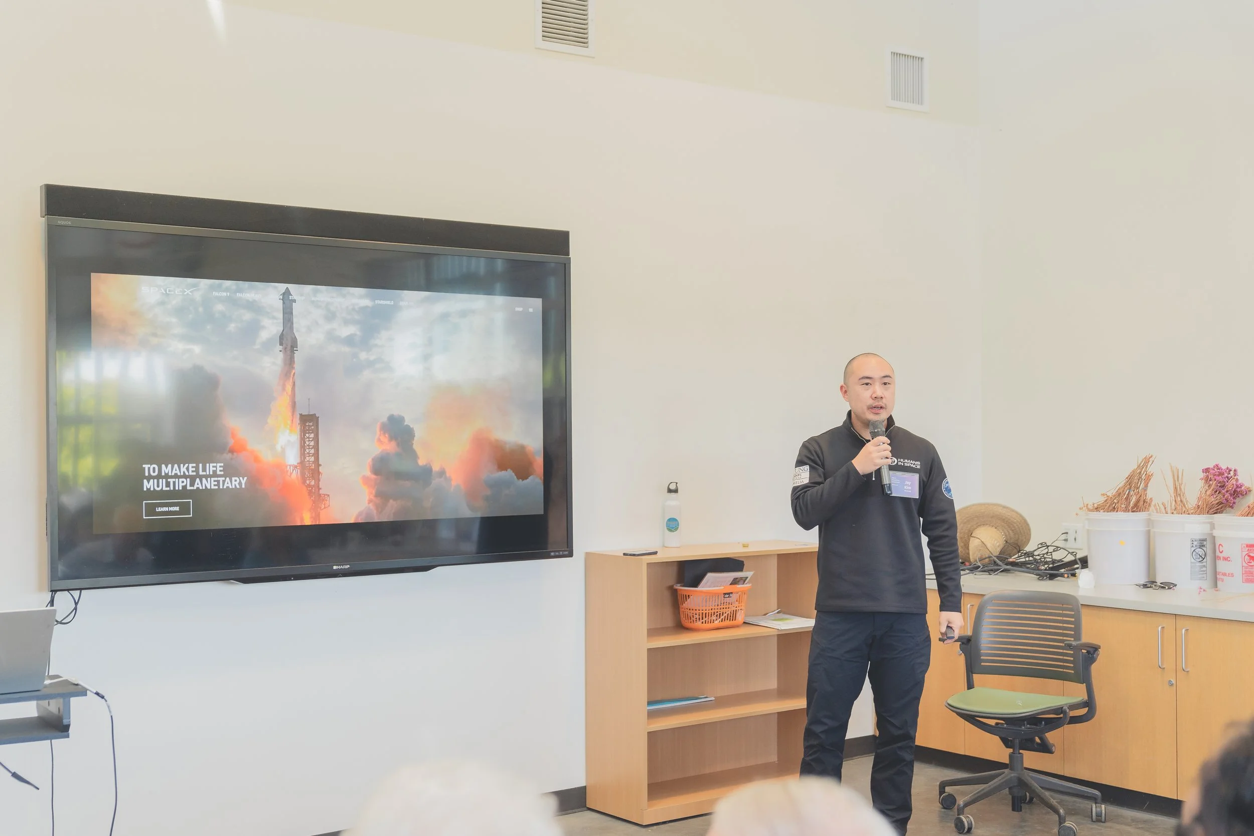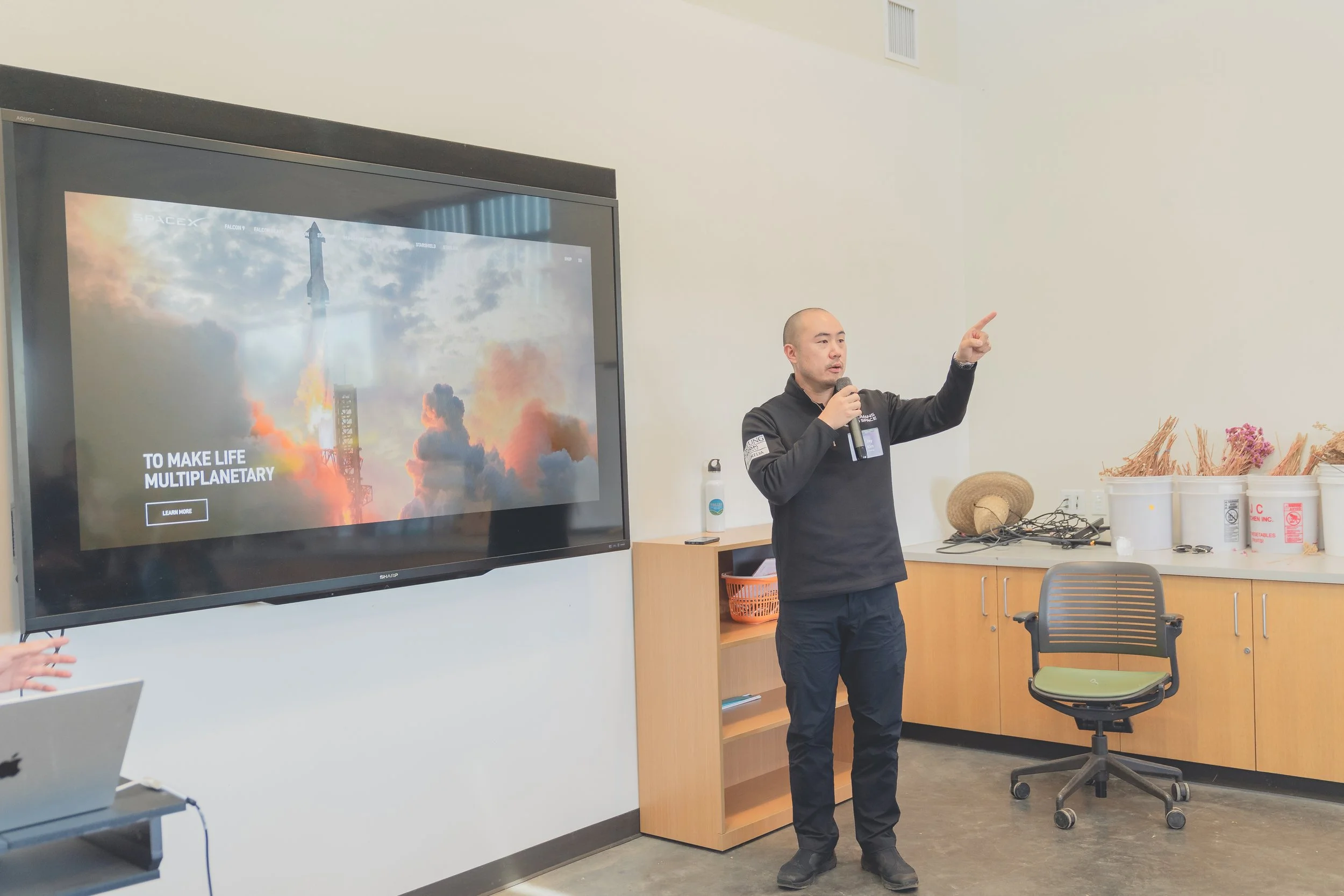 Person giving a presentation in a room with a large display screen showing a rocket launch and the phrase "To Make Life Multiplanetary."
