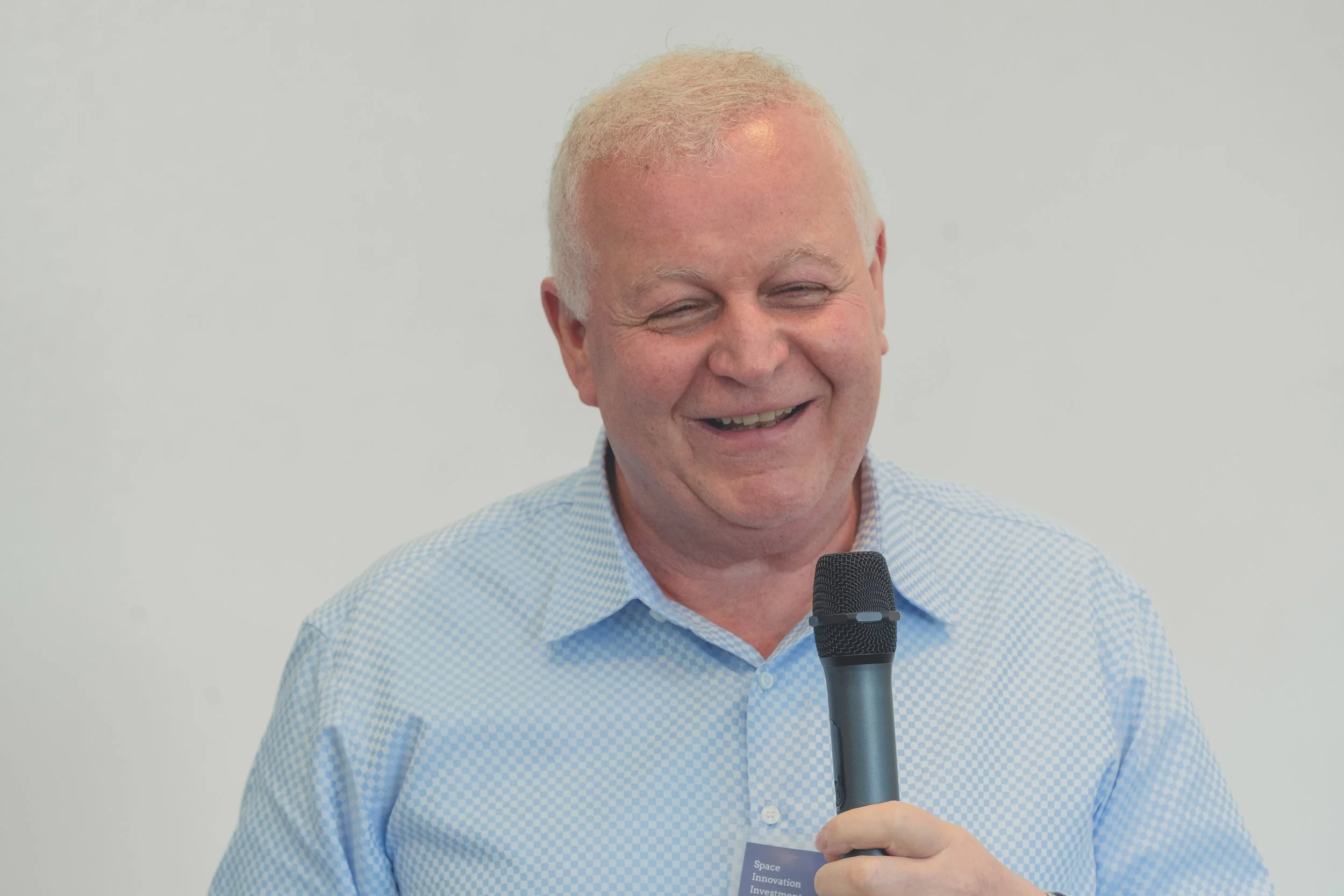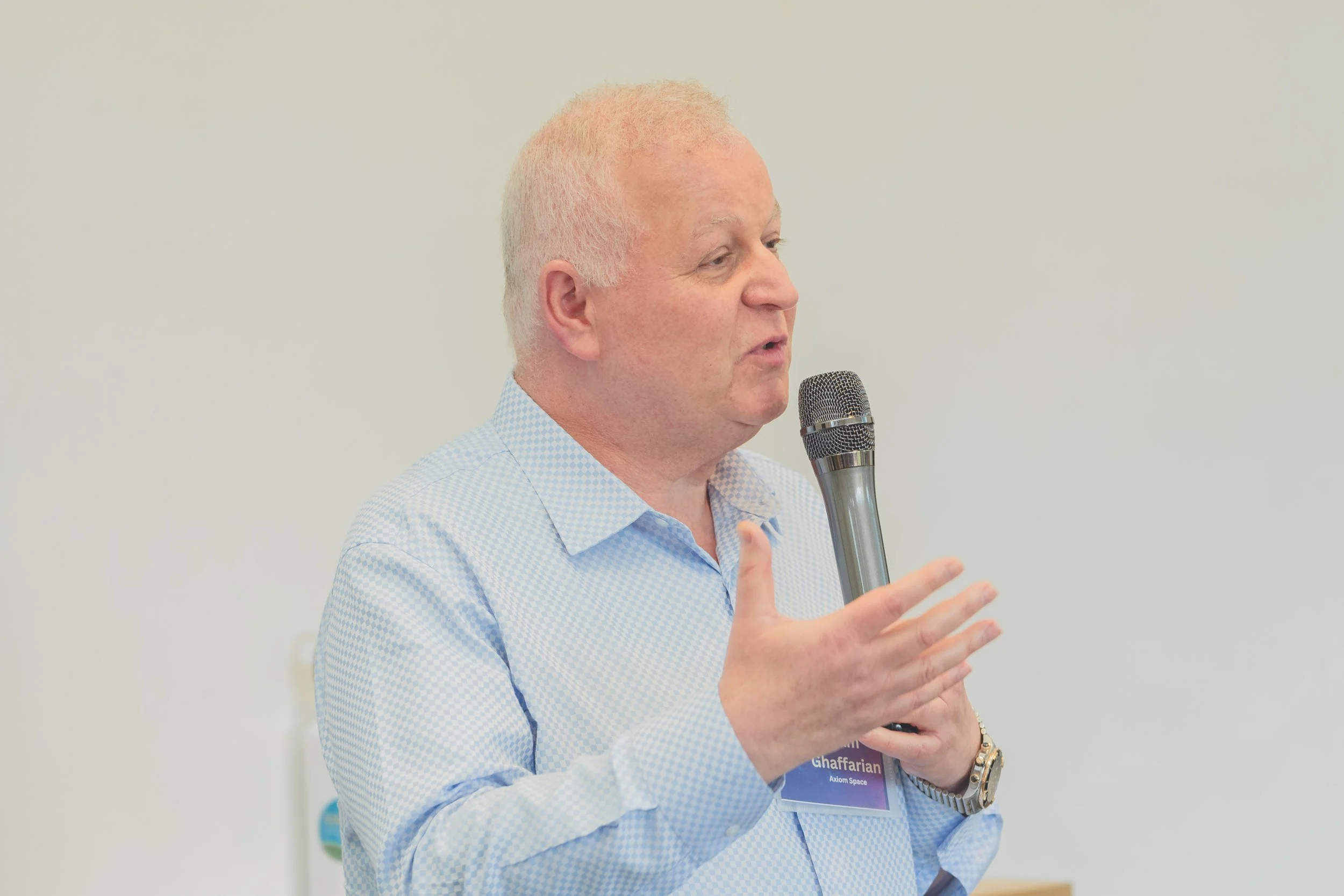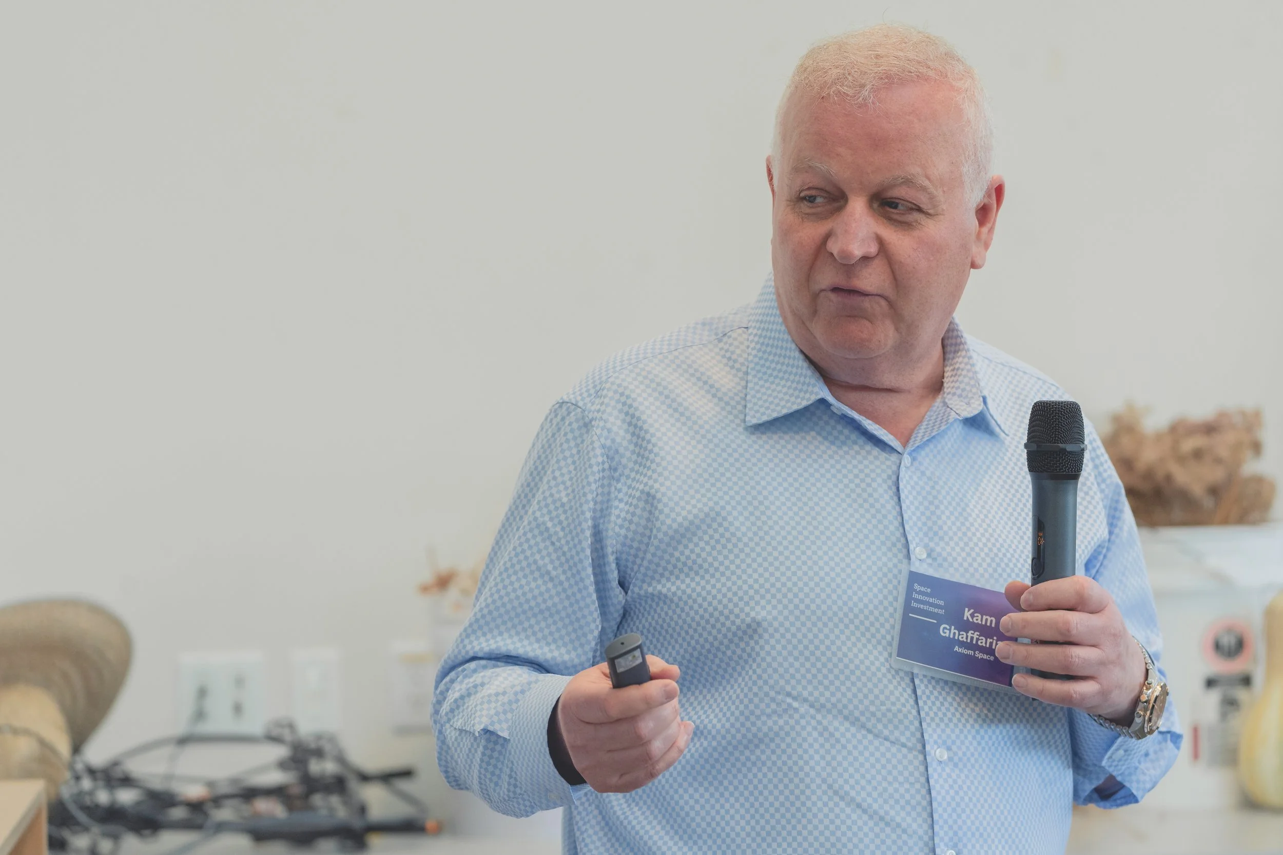 A man holding a microphone giving a presentation, wearing a dark jacket with "Humans in Space" logo and a name badge. He is standing next to a chair and a table in a room.