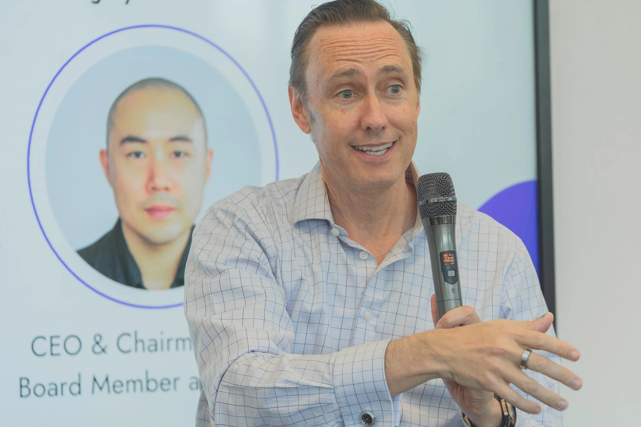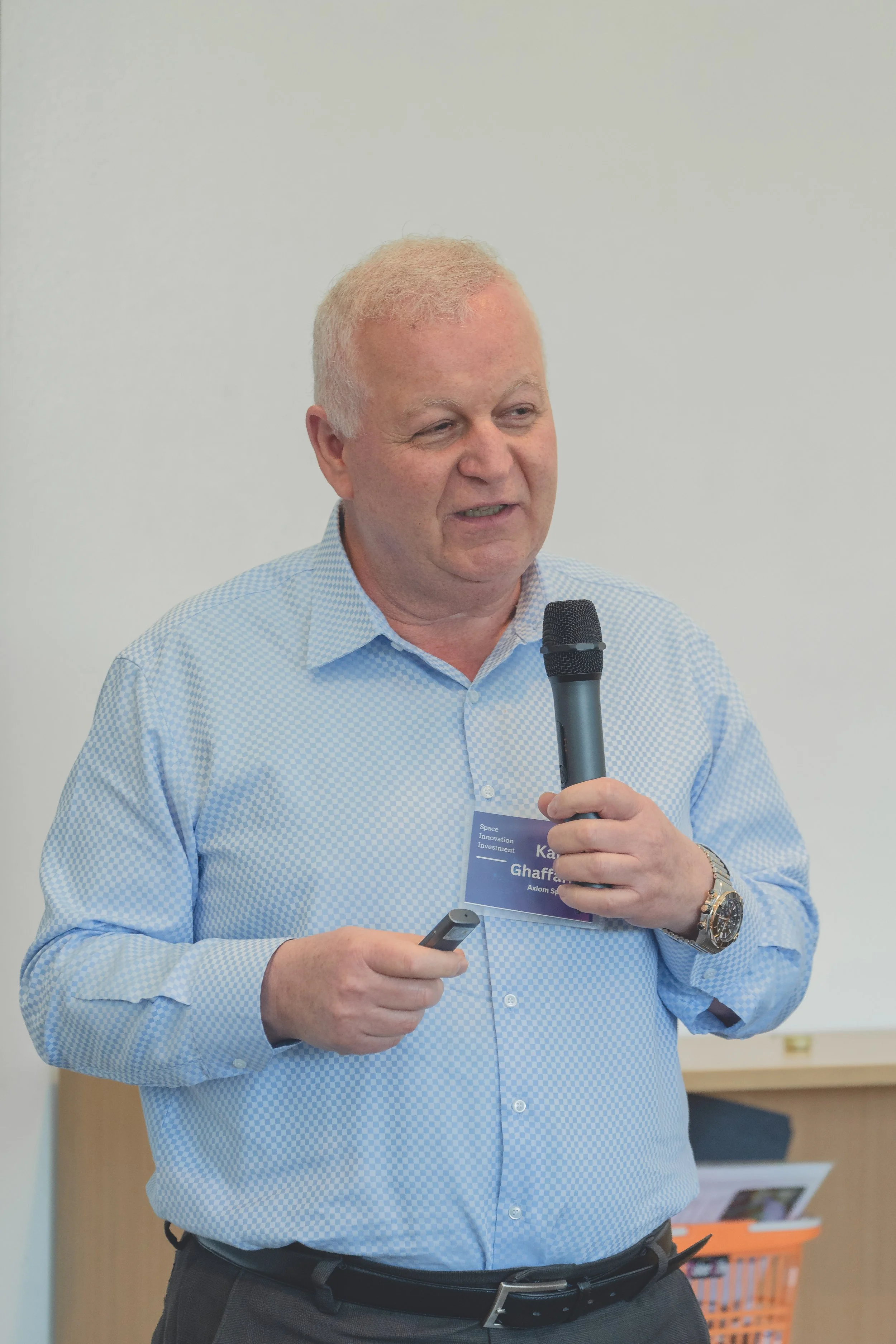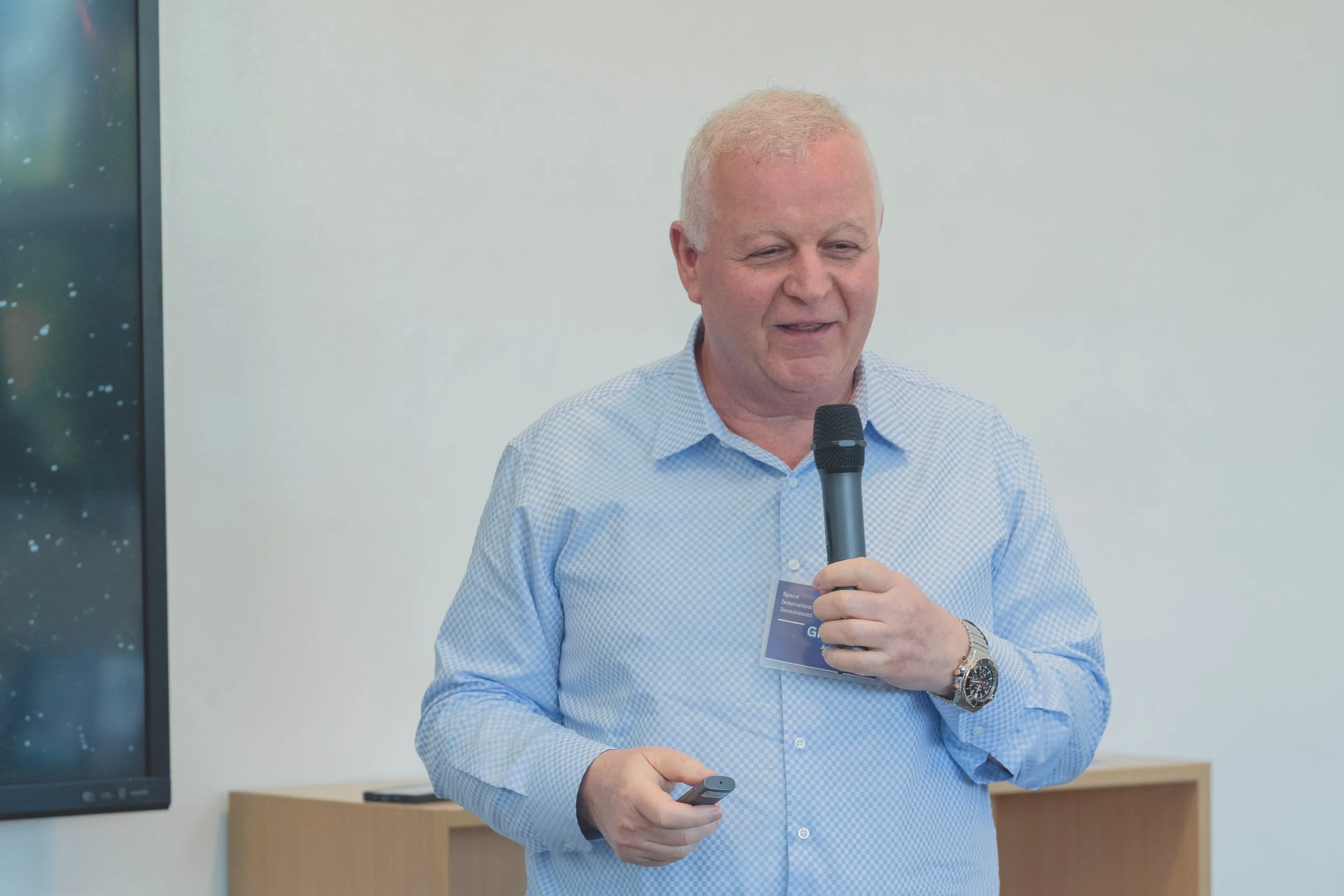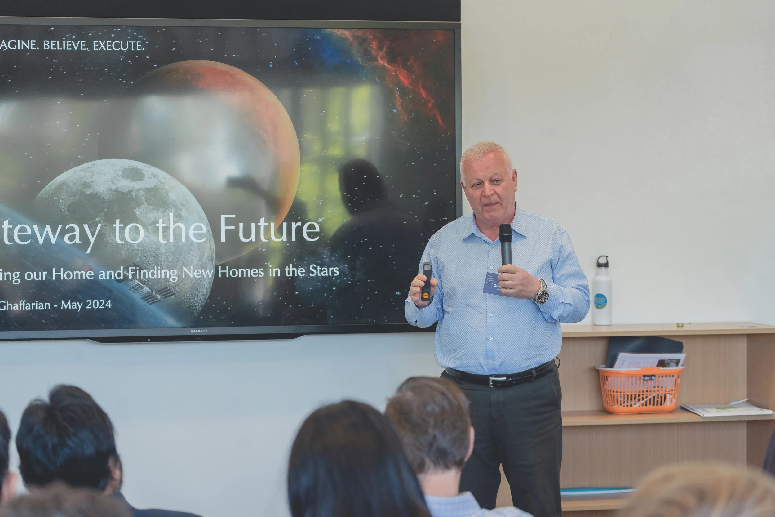A man holding a microphone giving a presentation, wearing a dark jacket with "Humans in Space" logo and a name badge. He is standing next to a chair and a table in a room.
