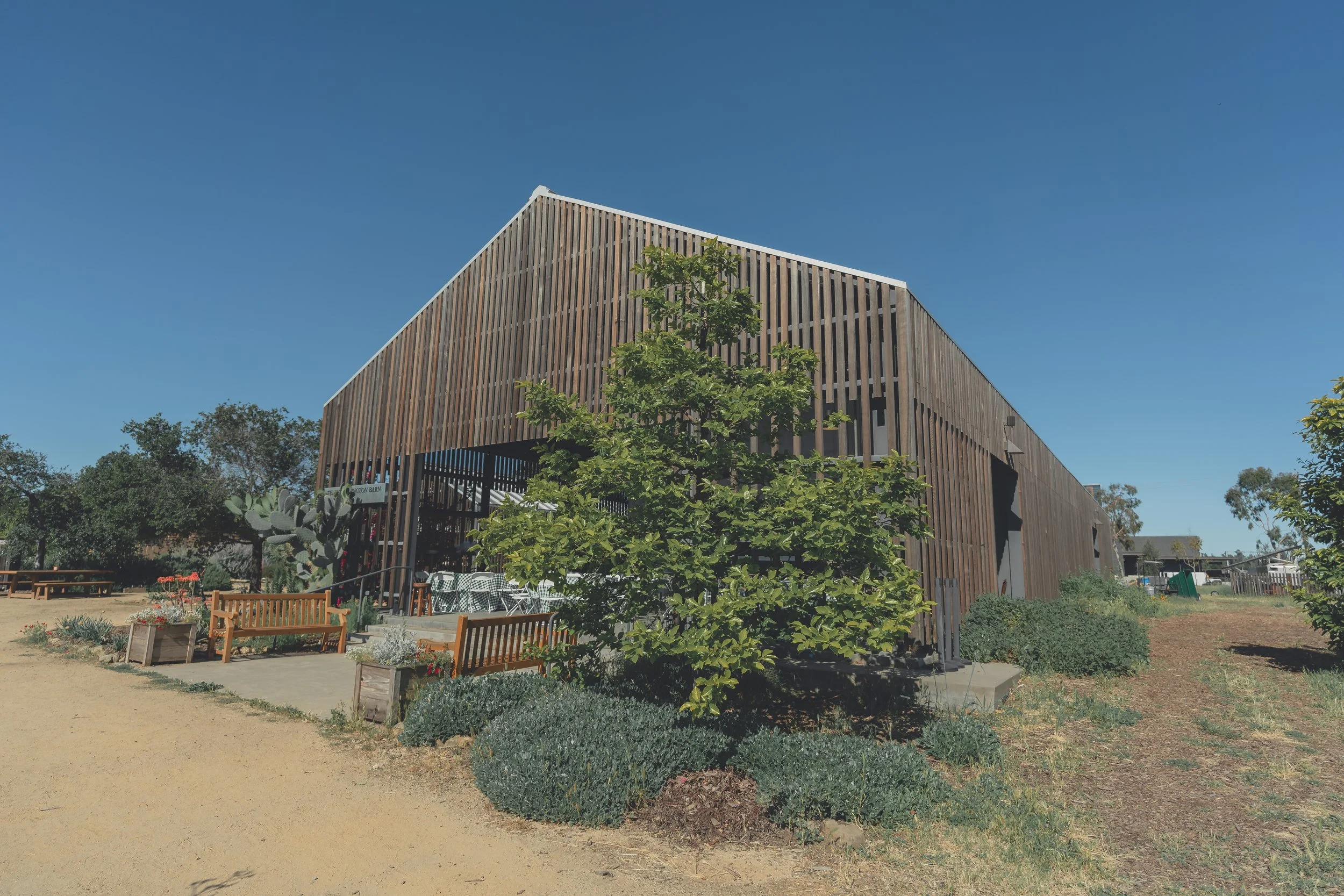Modern building with wooden slats, red flowering vine, and desert plants, set in a garden with picnic benches and a dirt path.