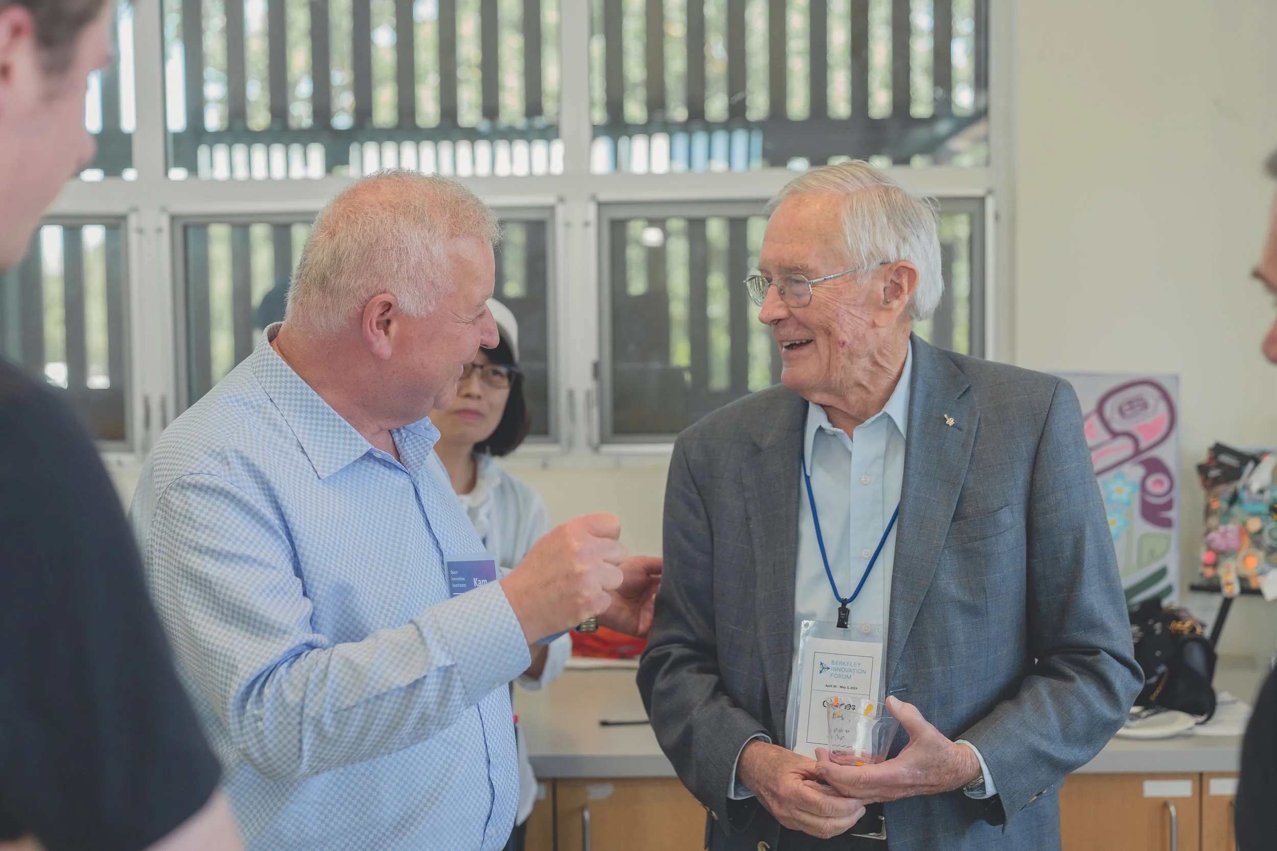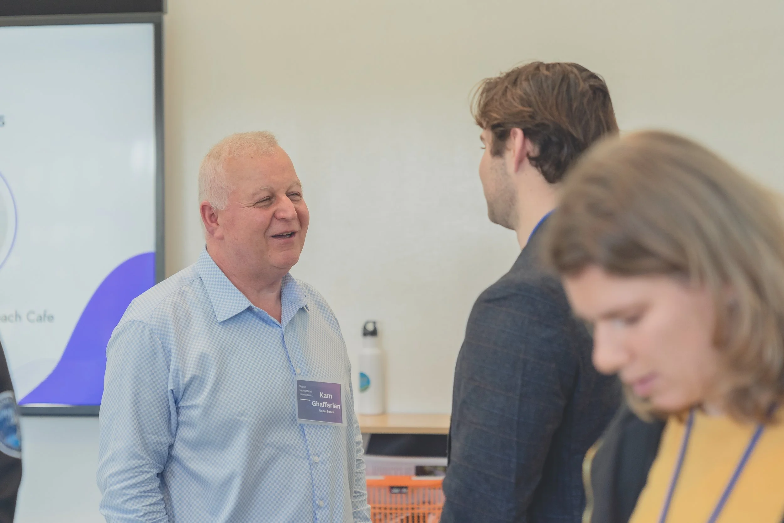 Group of people talking in a bright room, with two men at the center engaged in conversation, one holding a cup and wearing a lanyard.