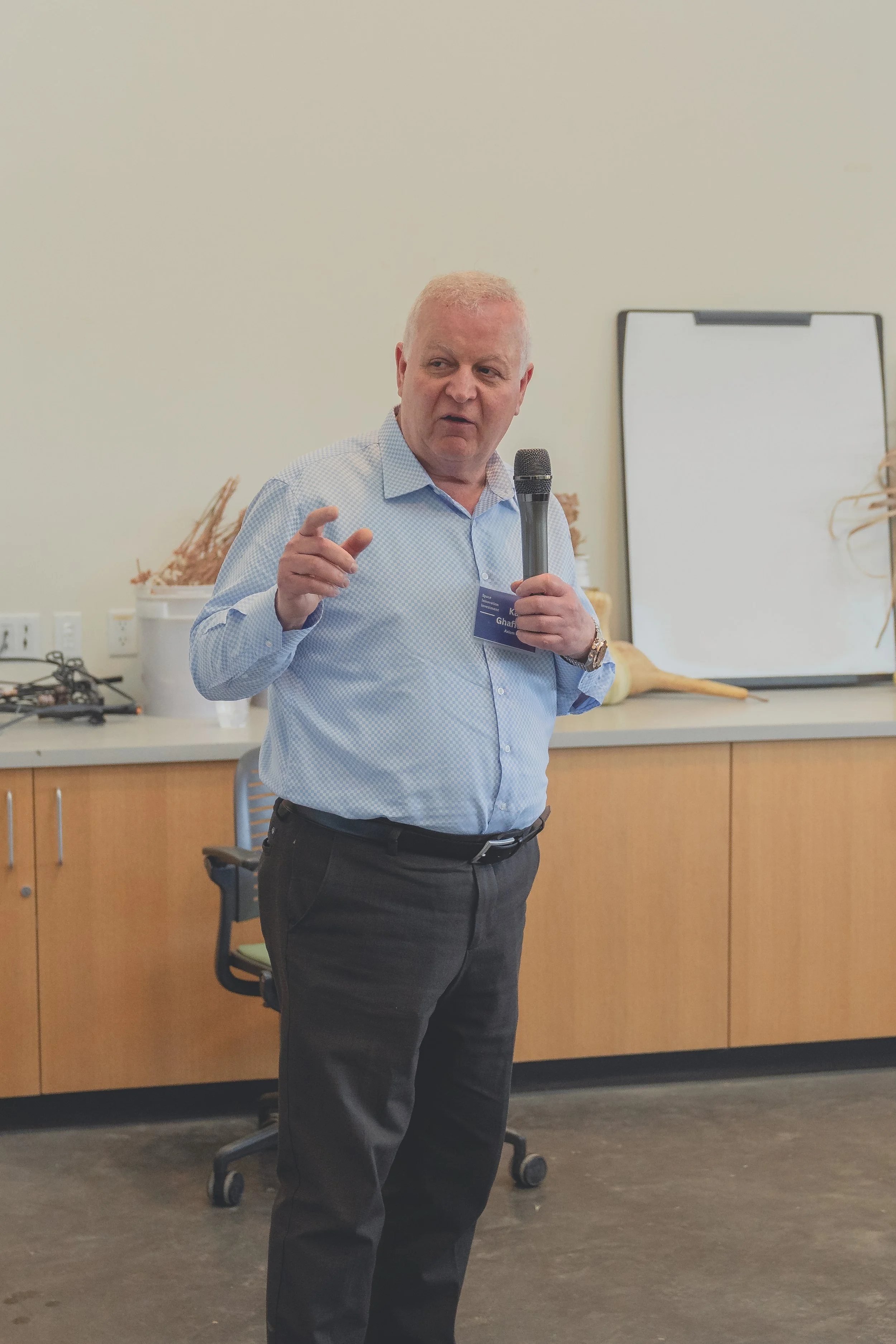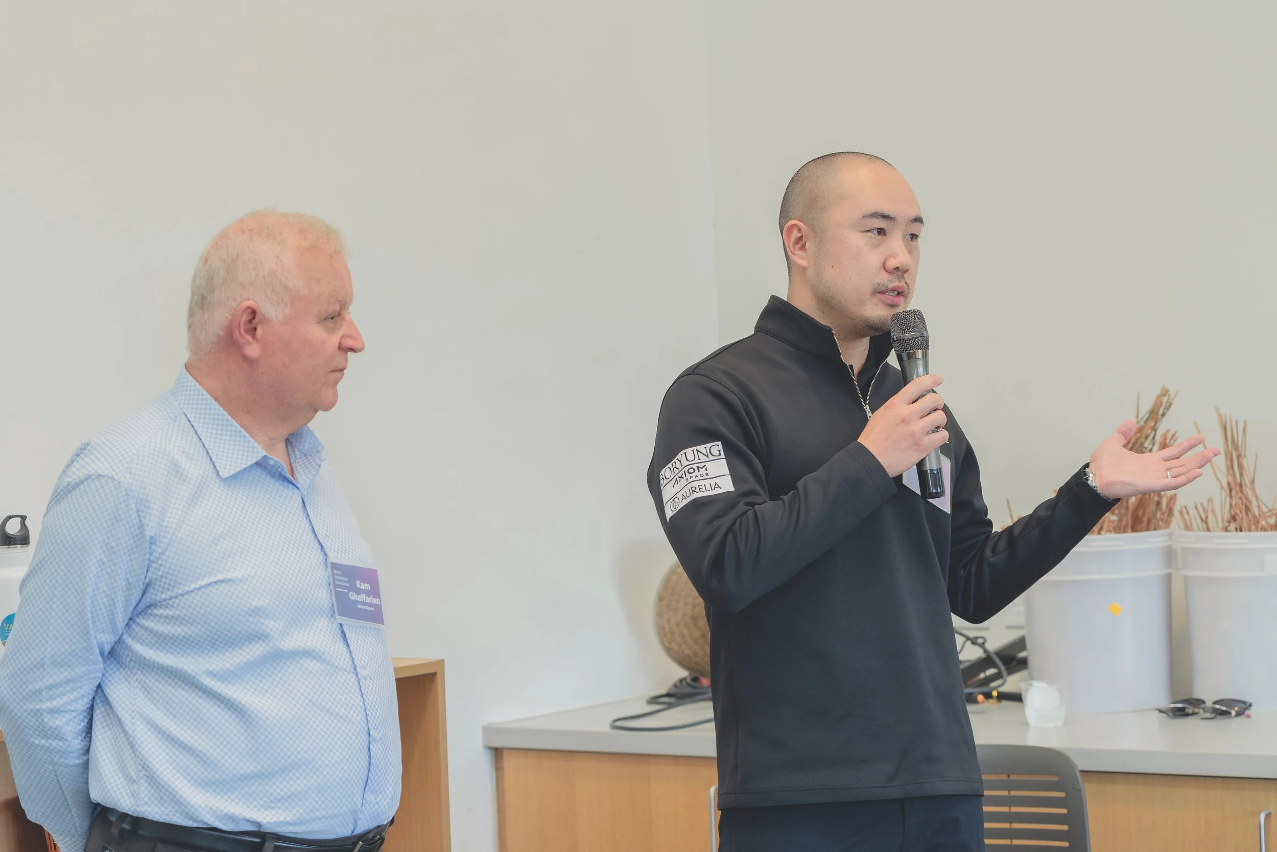 Two men in a room, one holding a microphone, both smiling, with a presentation board and storage bins in the background.