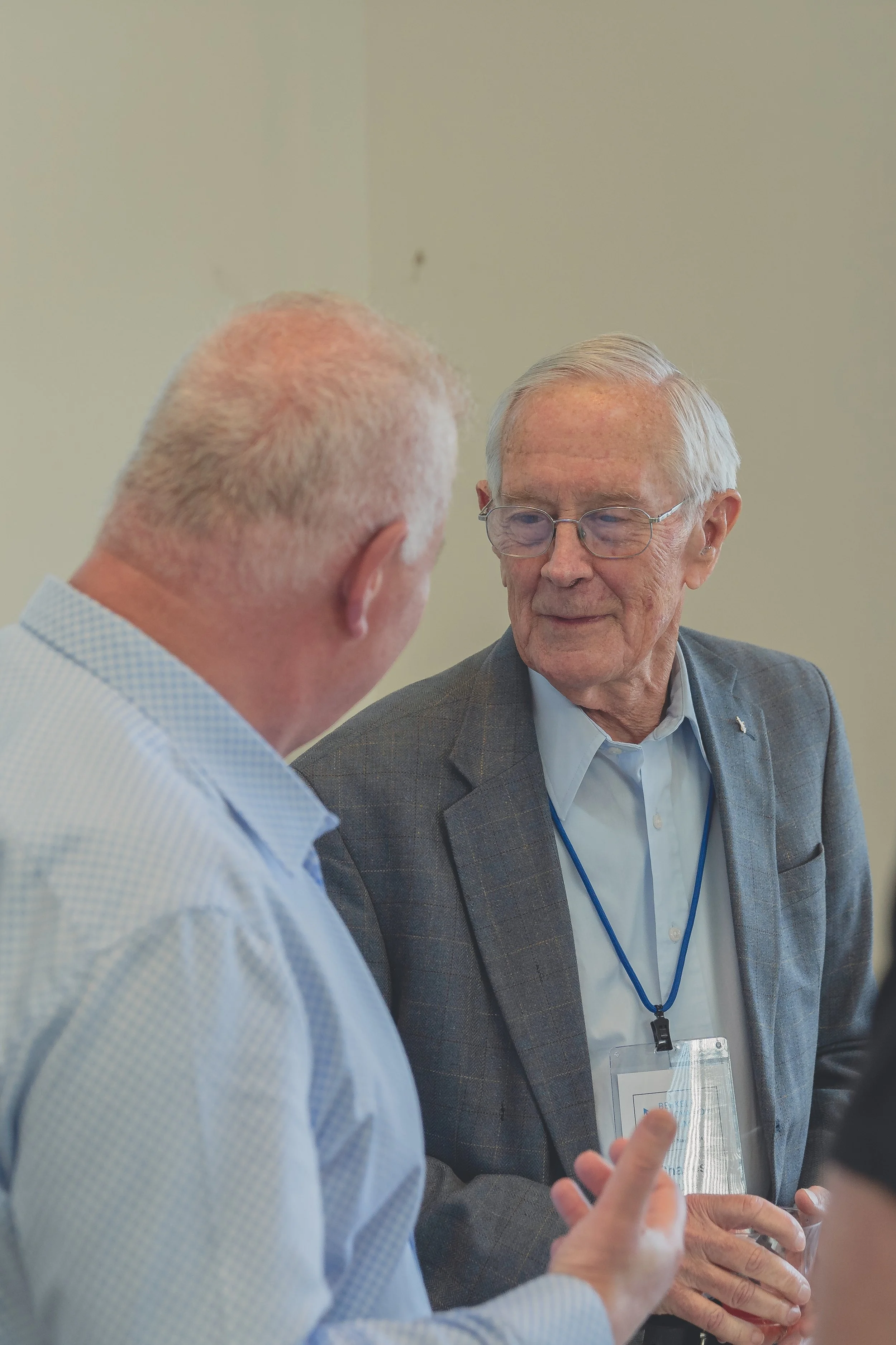 Two men having a conversation outdoors, one in a light blue shirt and another in a black jacket, both wearing name tags, with greenery in the background.