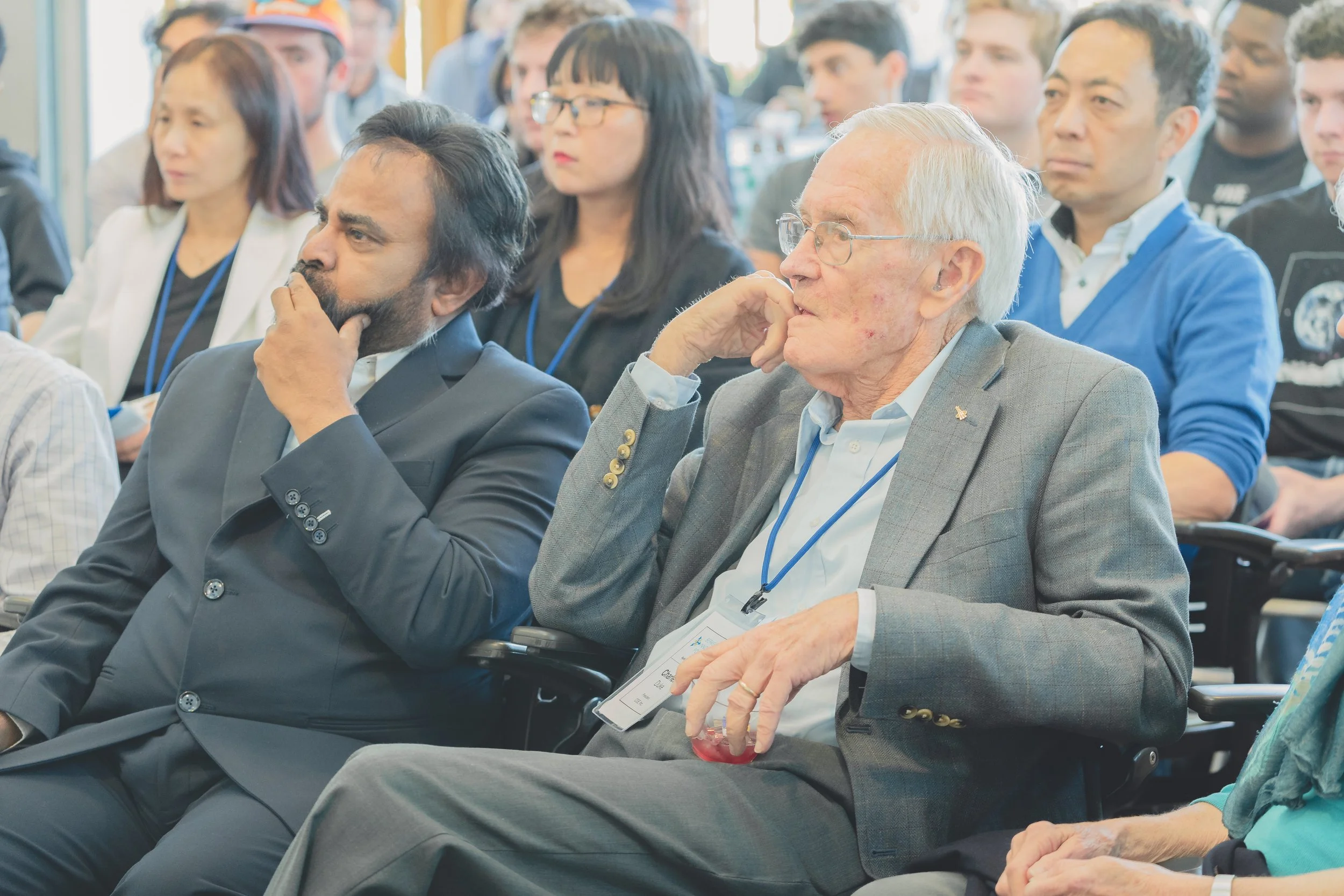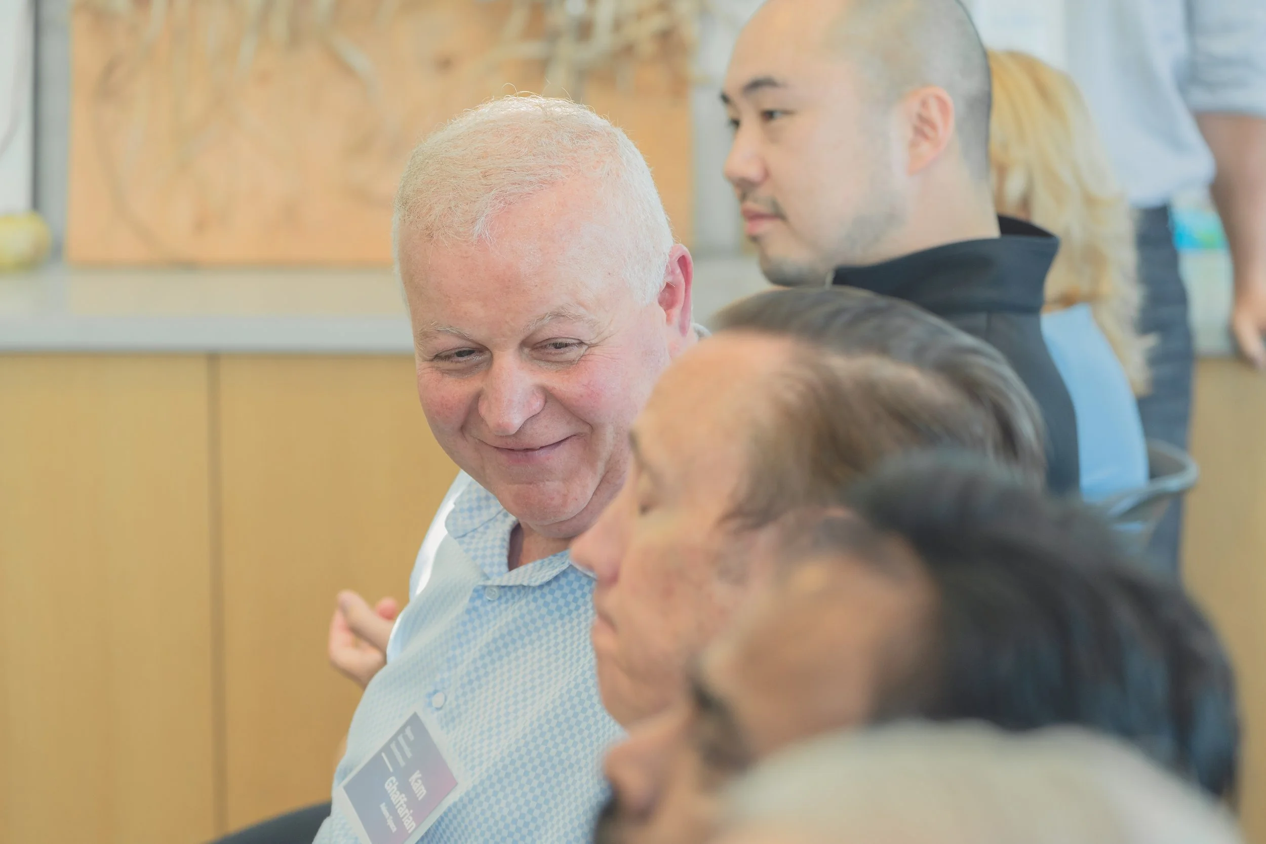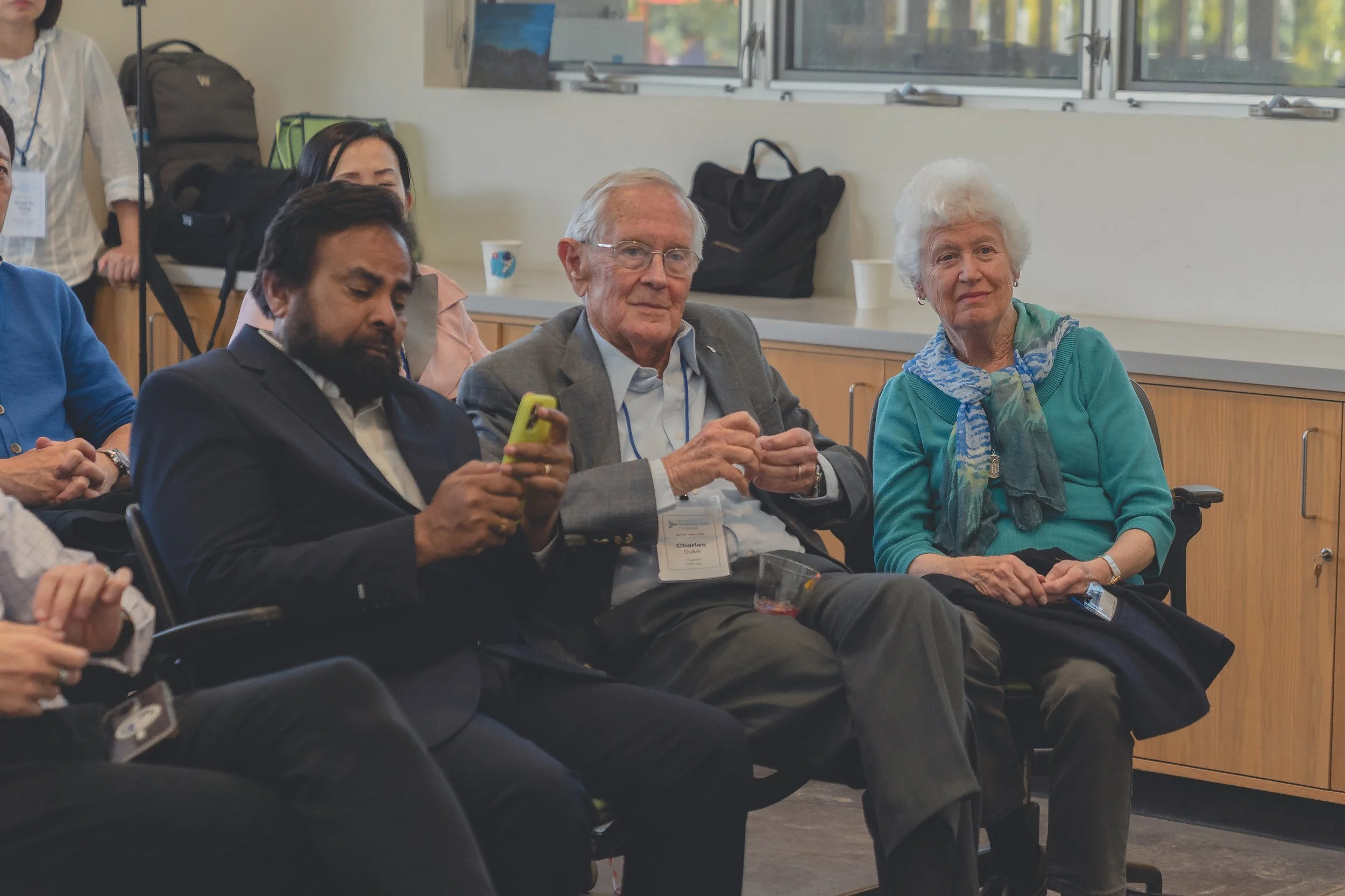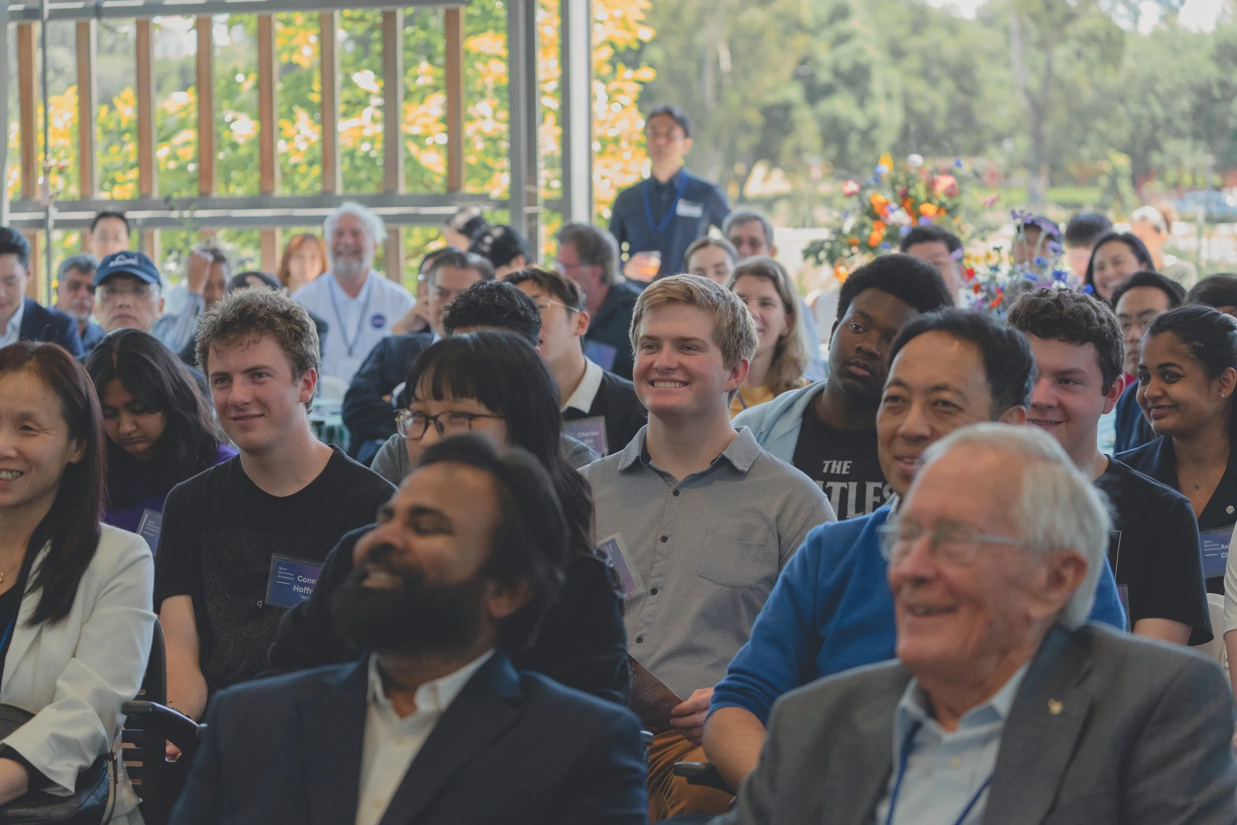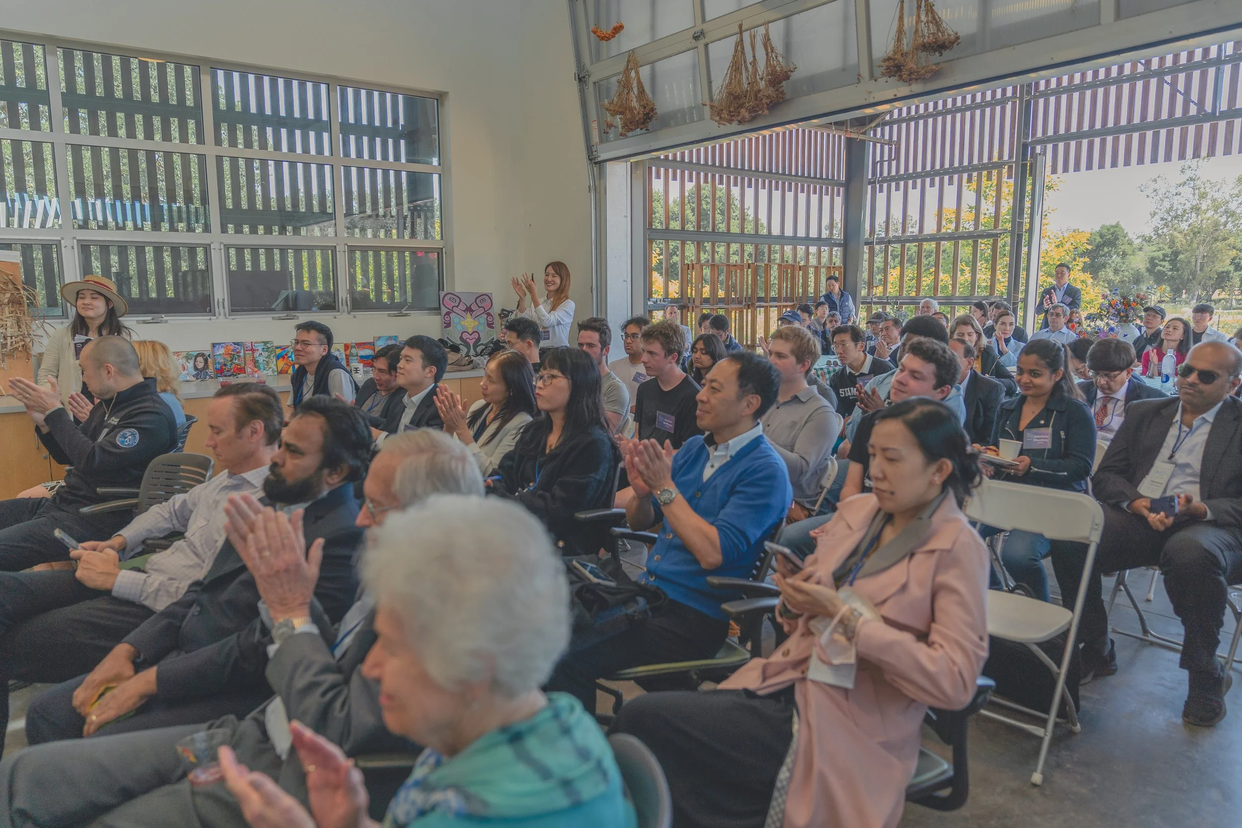 An audience seated in a room with large windows and decorations on display. People are clapping, indicating they are attending an event or presentation. The setting appears to be a casual, well-lit indoor space with diverse attendees observing and en