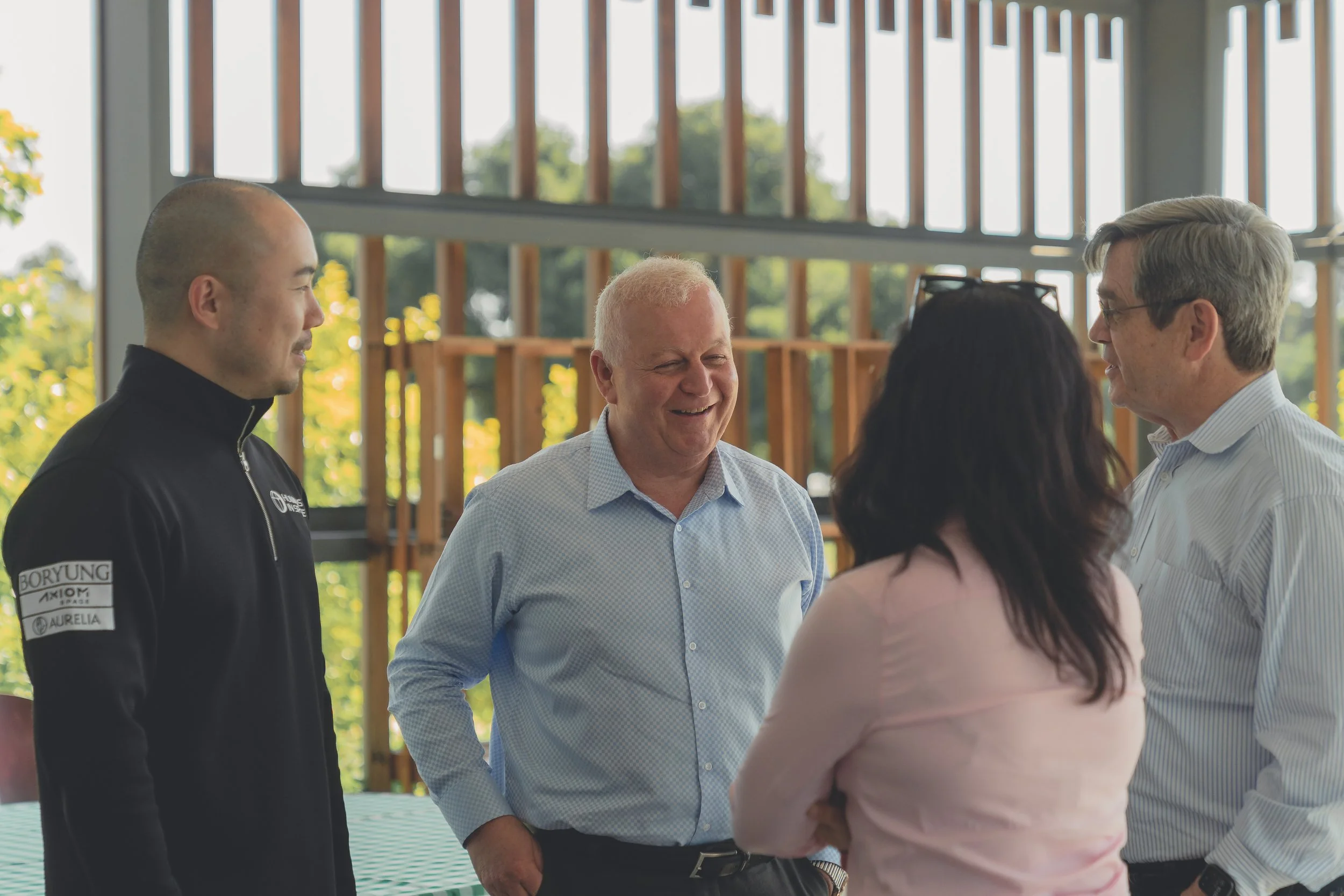 Four people having a conversation at an outdoor event, with green and white checkered tablecloths in the background.