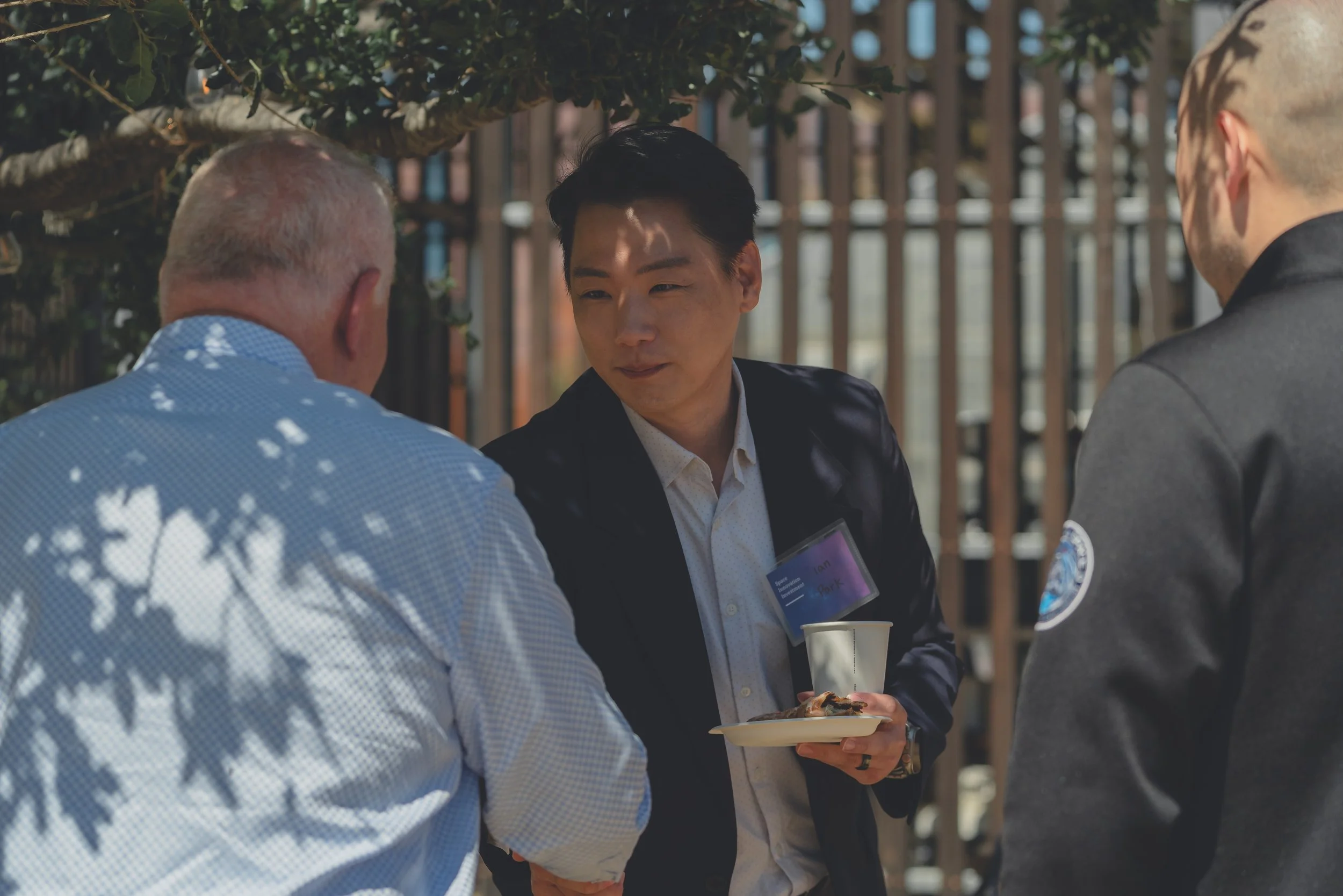 Group of men talking outdoors in a relaxed gathering, wearing casual clothes and name tags, with trees in the background.