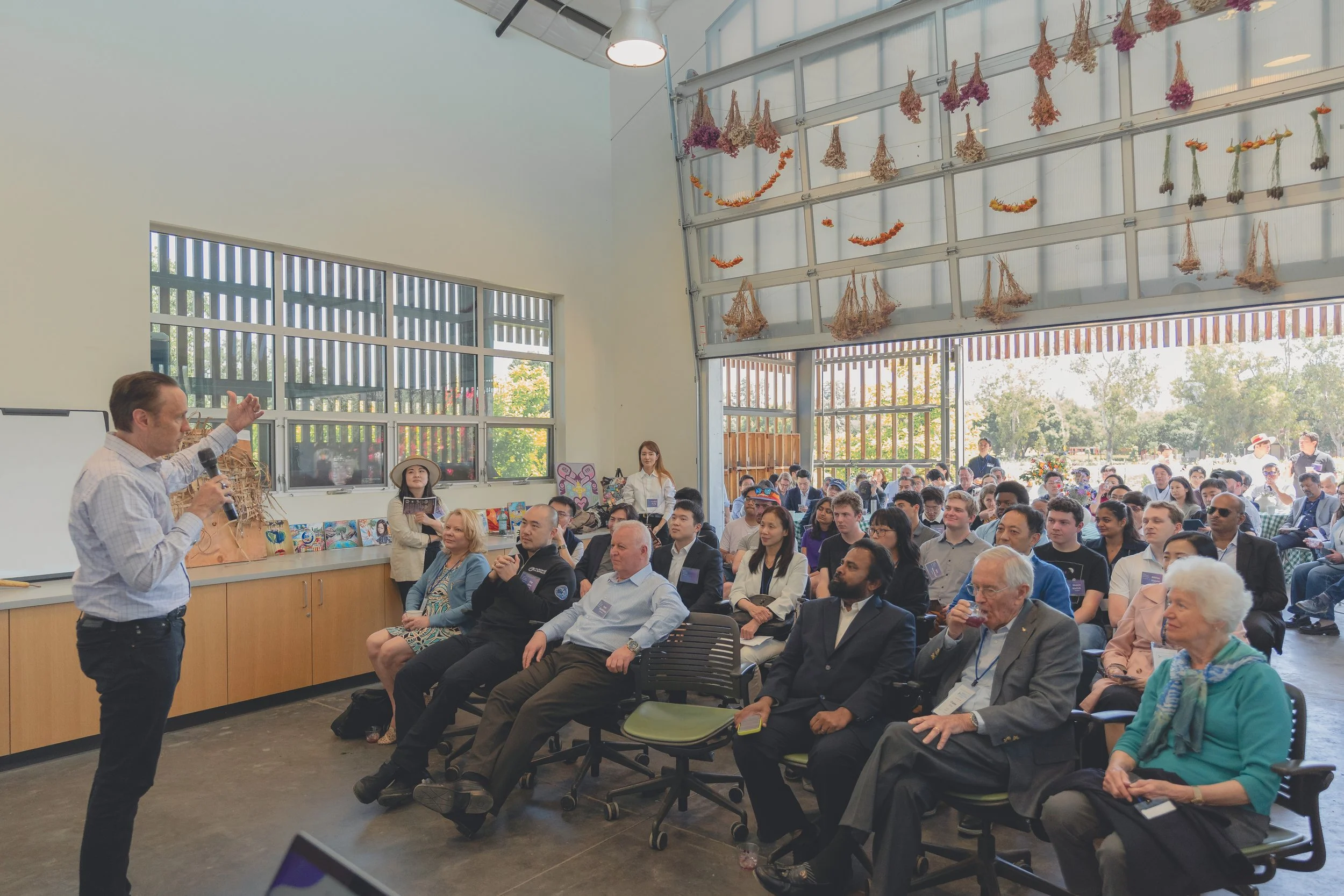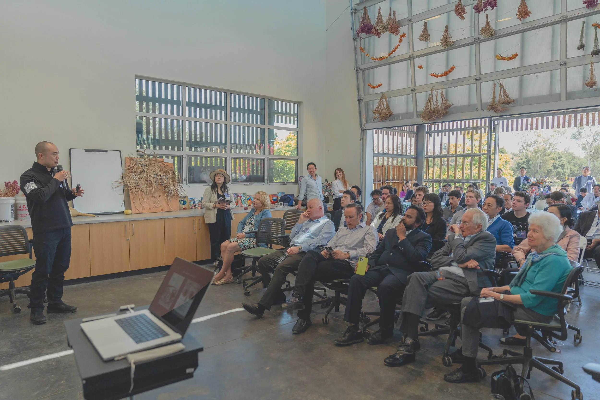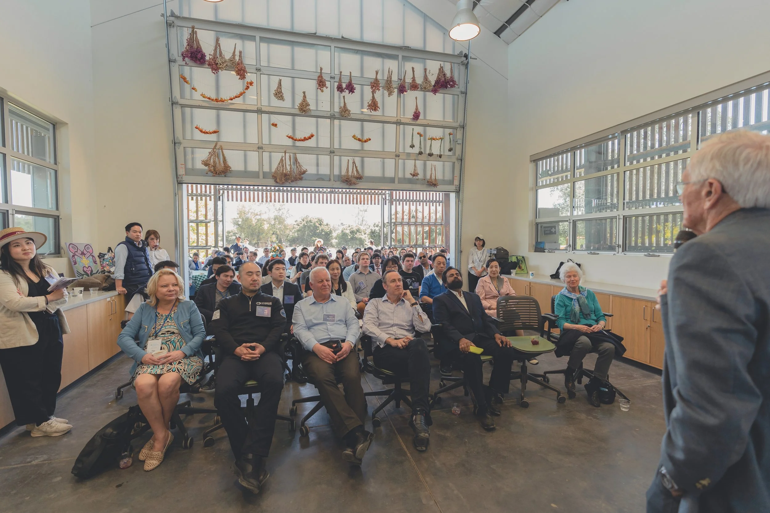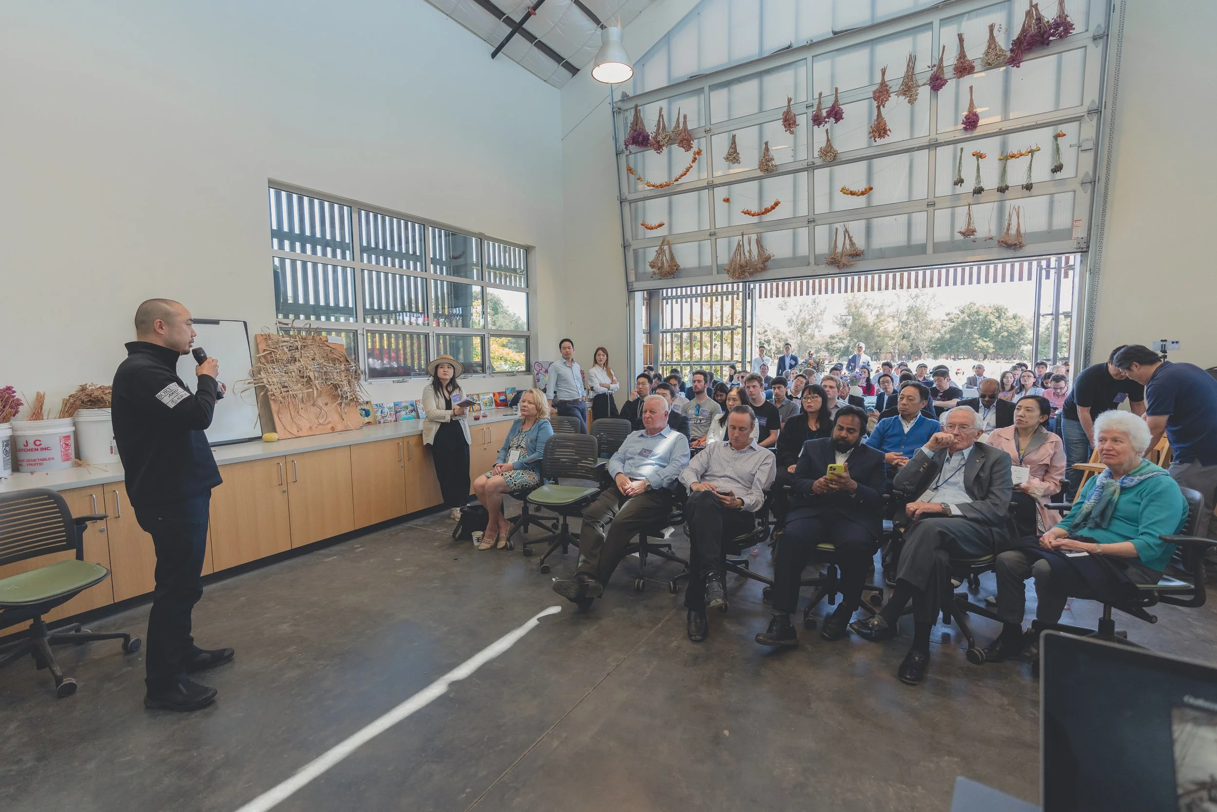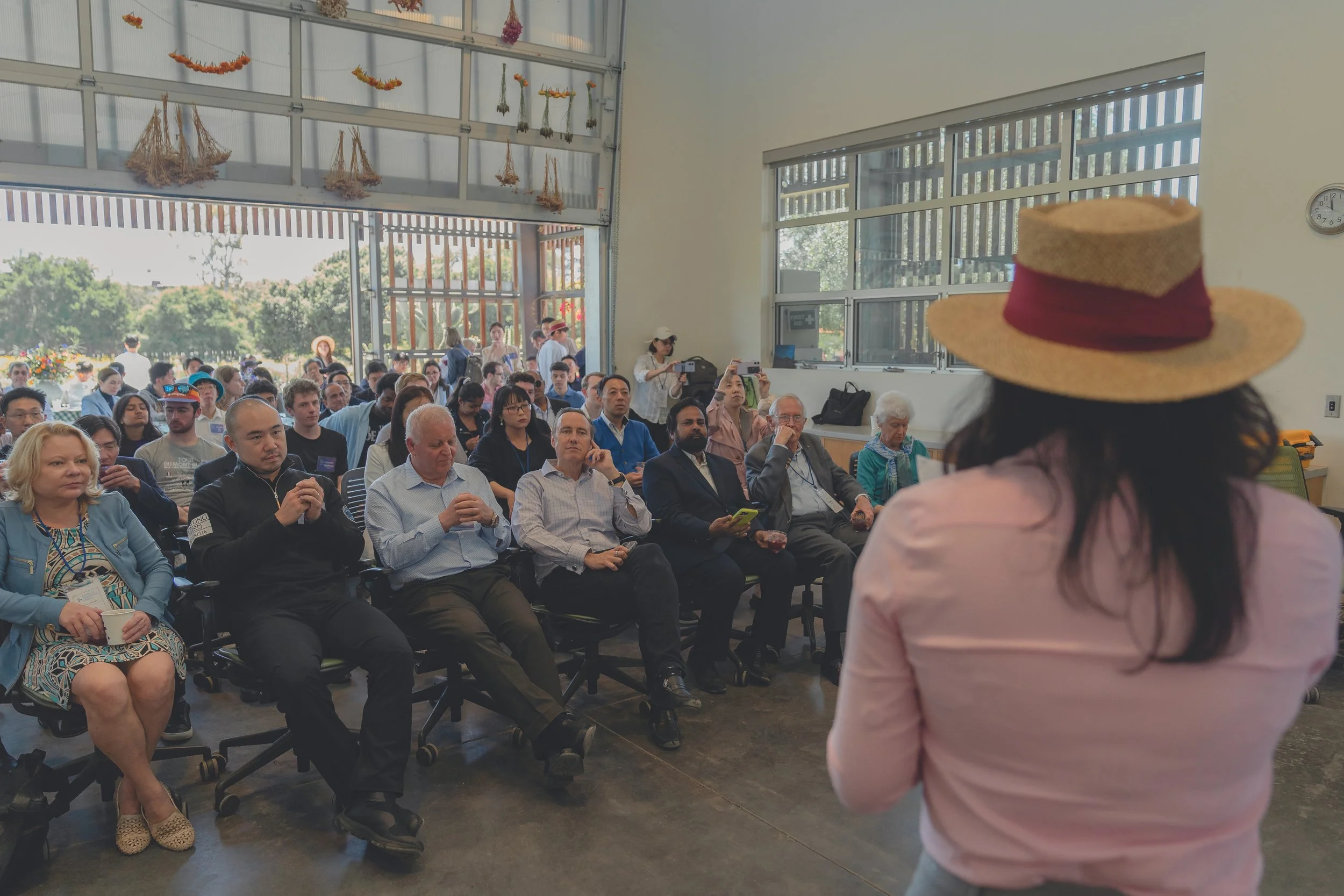 A diverse audience sitting indoors, attentively attending a presentation or event, with some clapping. The room has large windows and decorative items hanging from the ceiling. Various artworks are displayed along the walls.