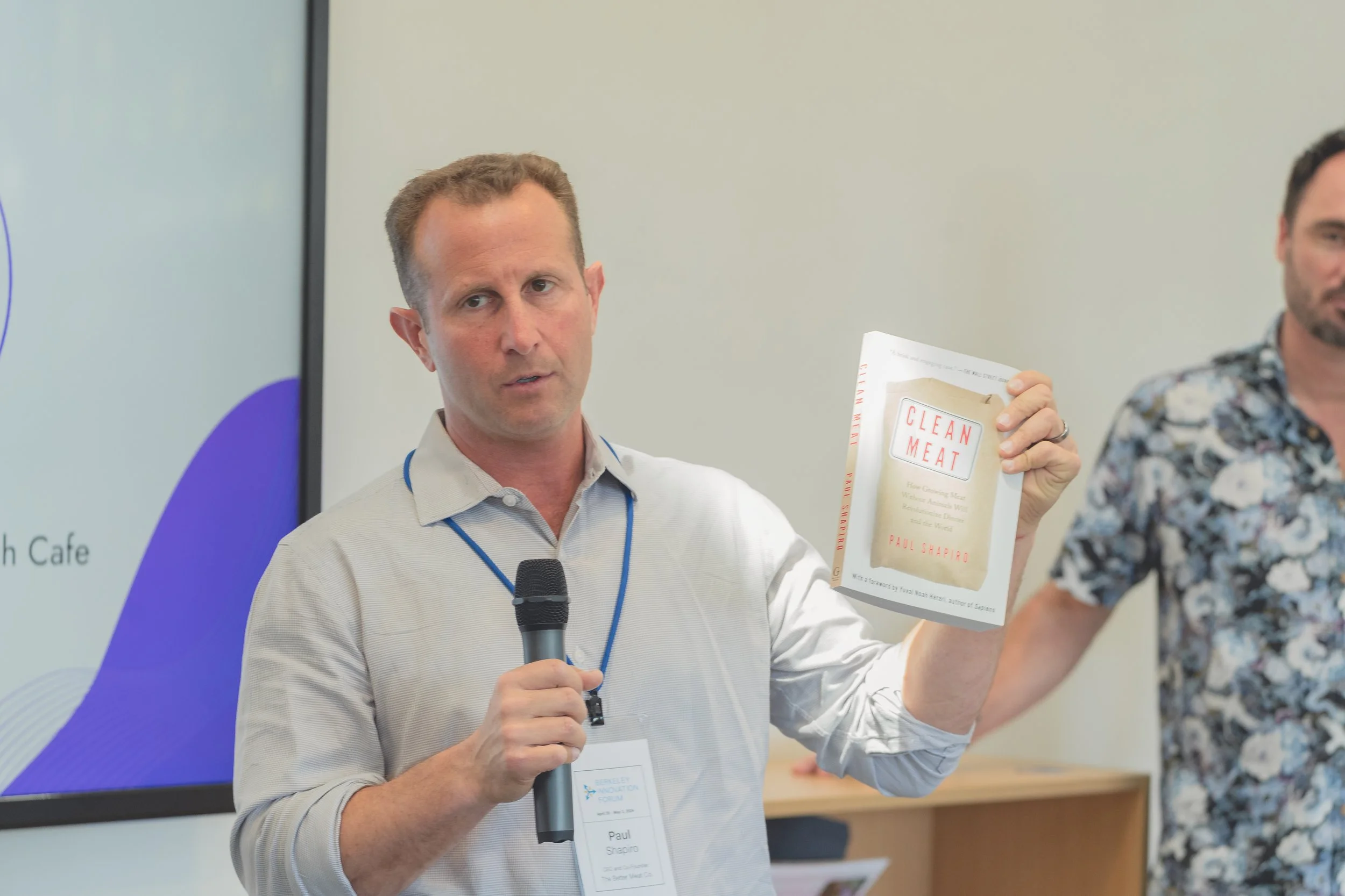 Man holding a microphone and a book titled 'Clean Meat', standing next to another person in a floral shirt.