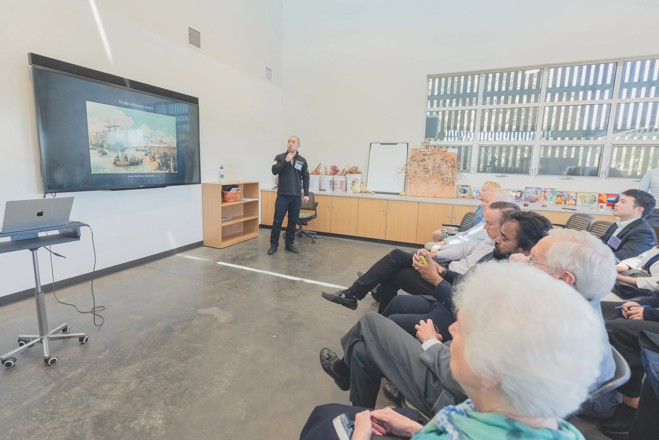 A presenter speaking in front of a group with a large screen displaying a historical image. The audience is seated in rows in a room with large windows, a laptop on a stand, and shelves with various items.