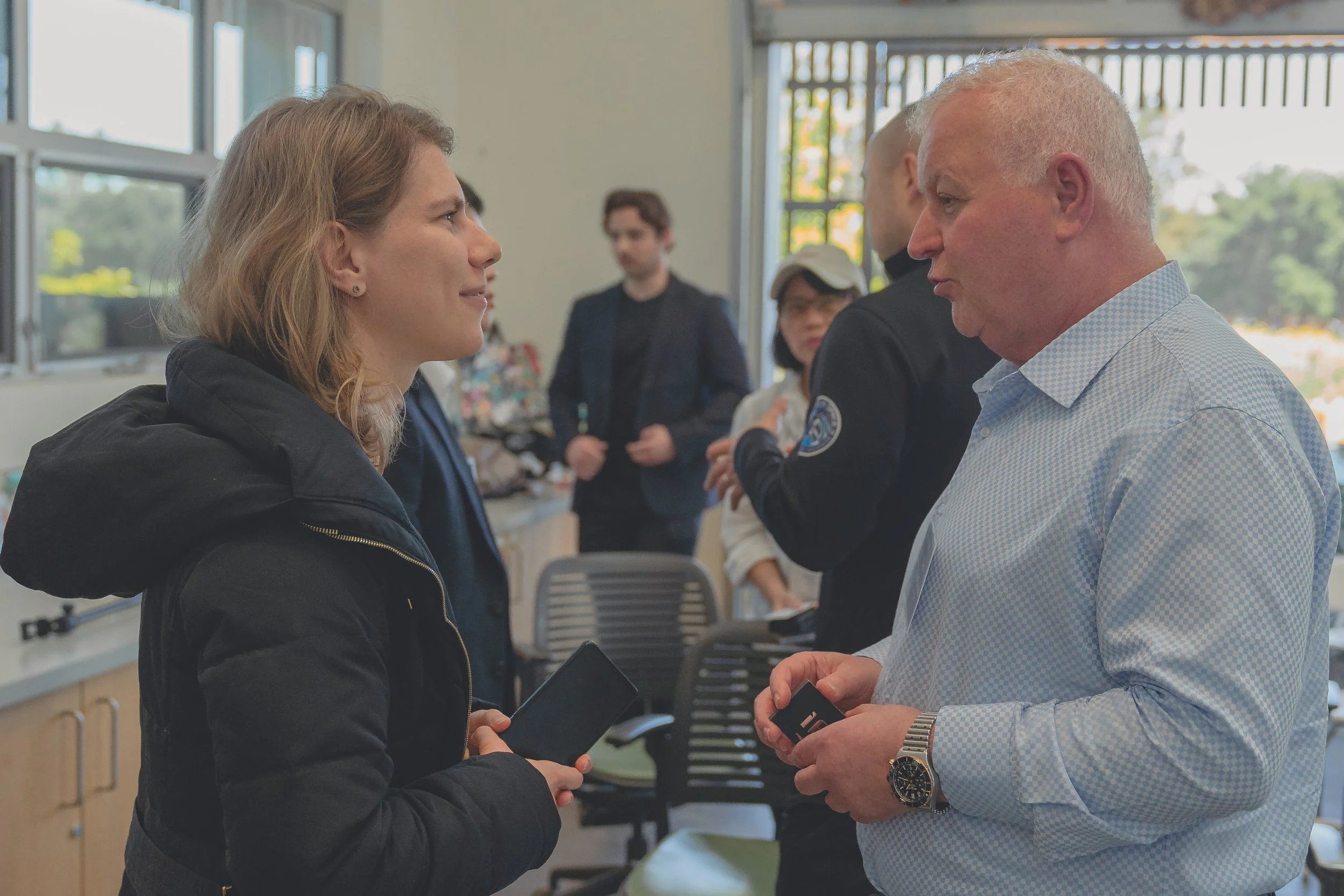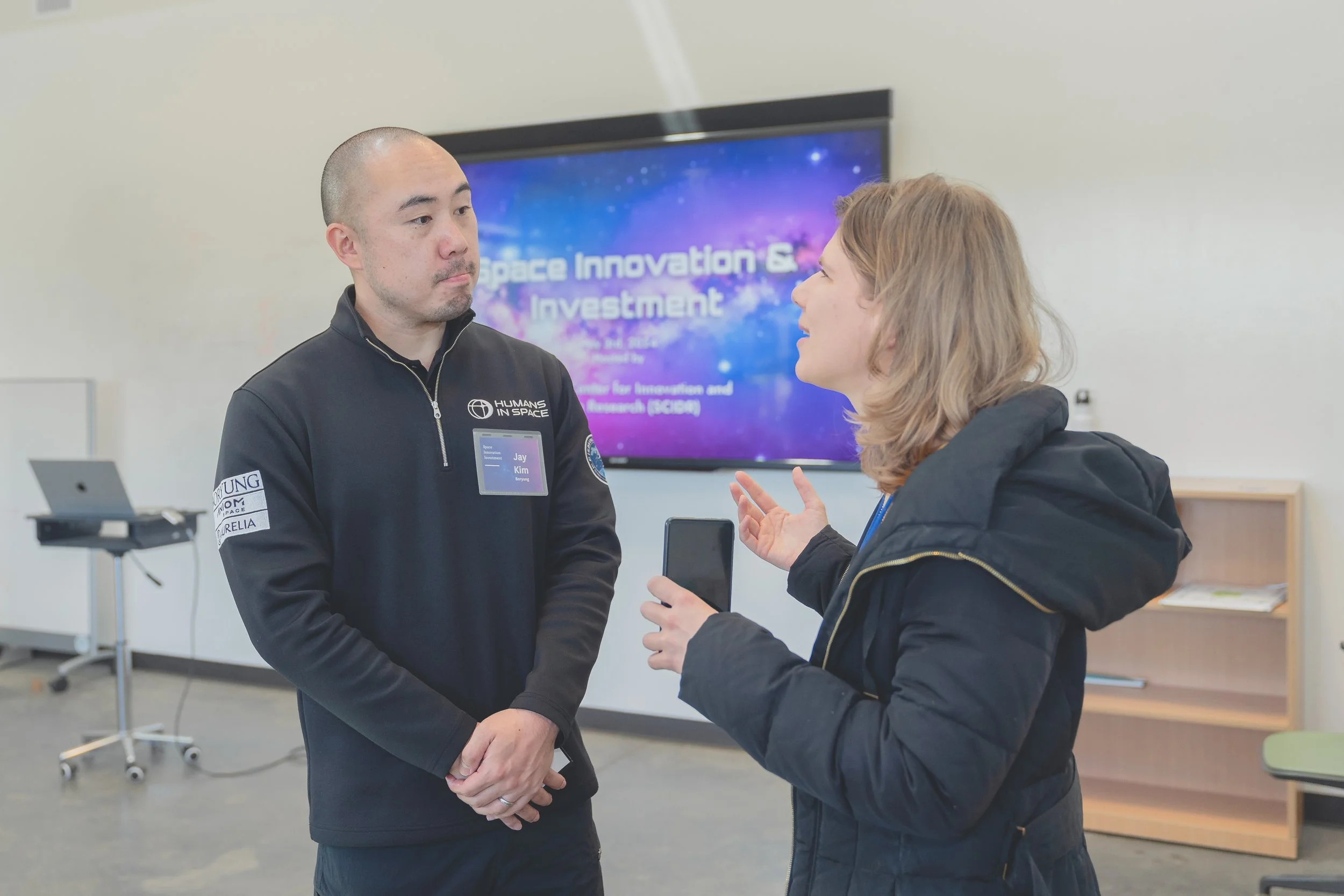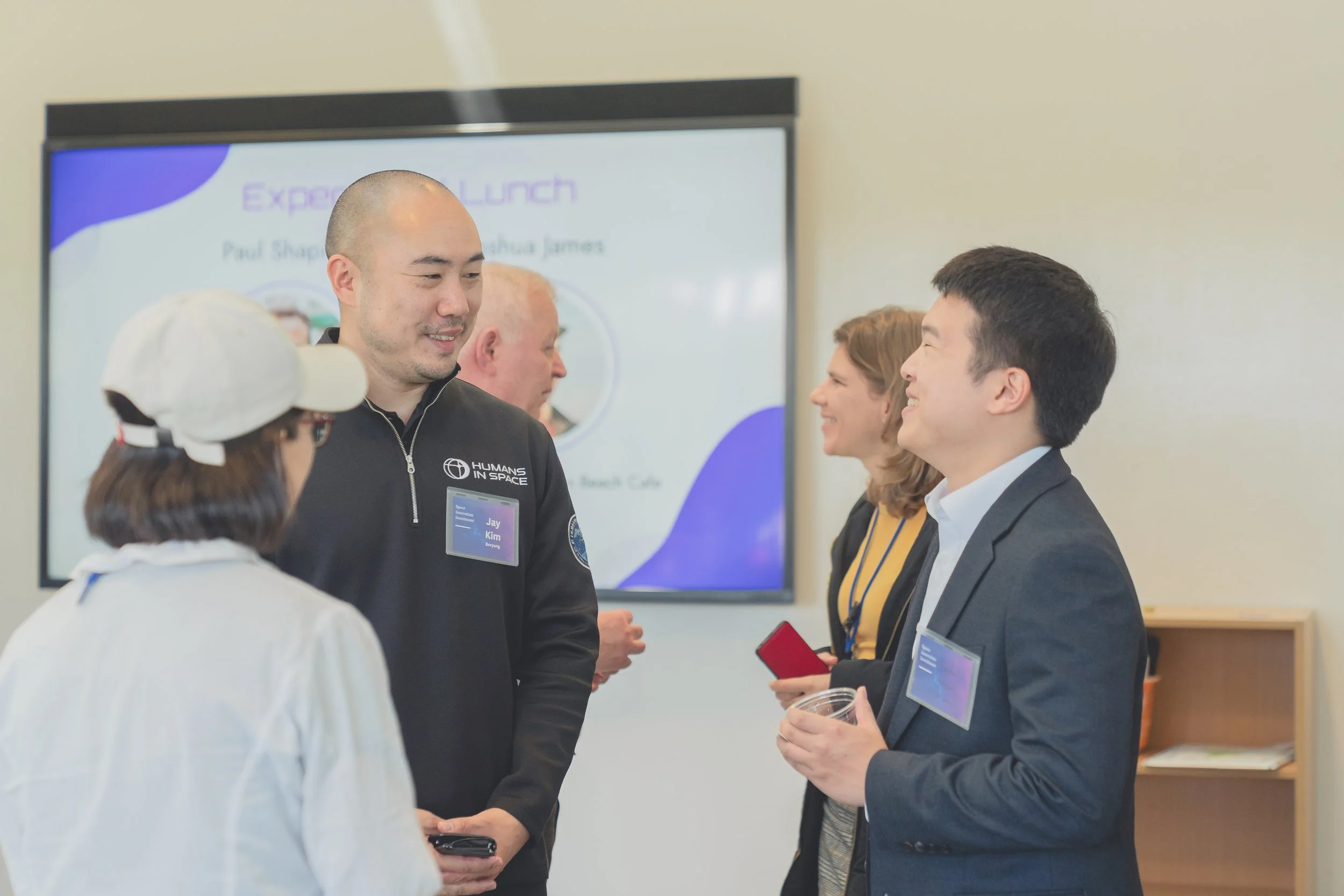 People having a conversation indoors, with one man wearing a 'Humans in Space' jacket and another person facing away wearing a cap. A woman in a black coat is in the background in front of a presentation screen.