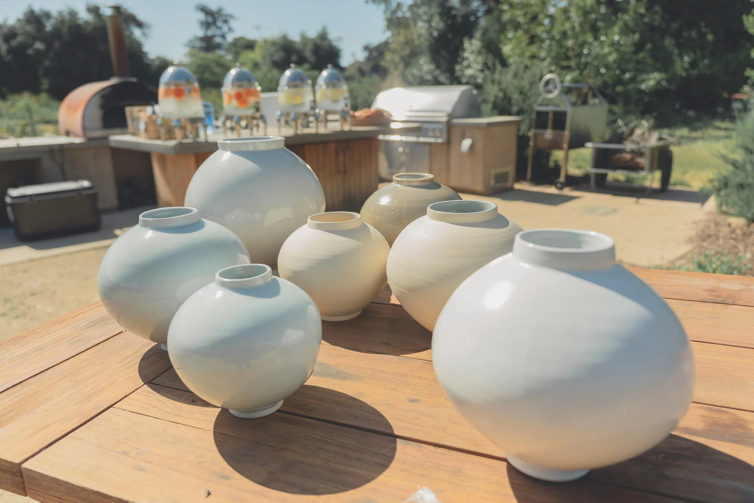Ceramic vases on a wooden table outdoors, with a barbecue and beverage dispensers in the background.