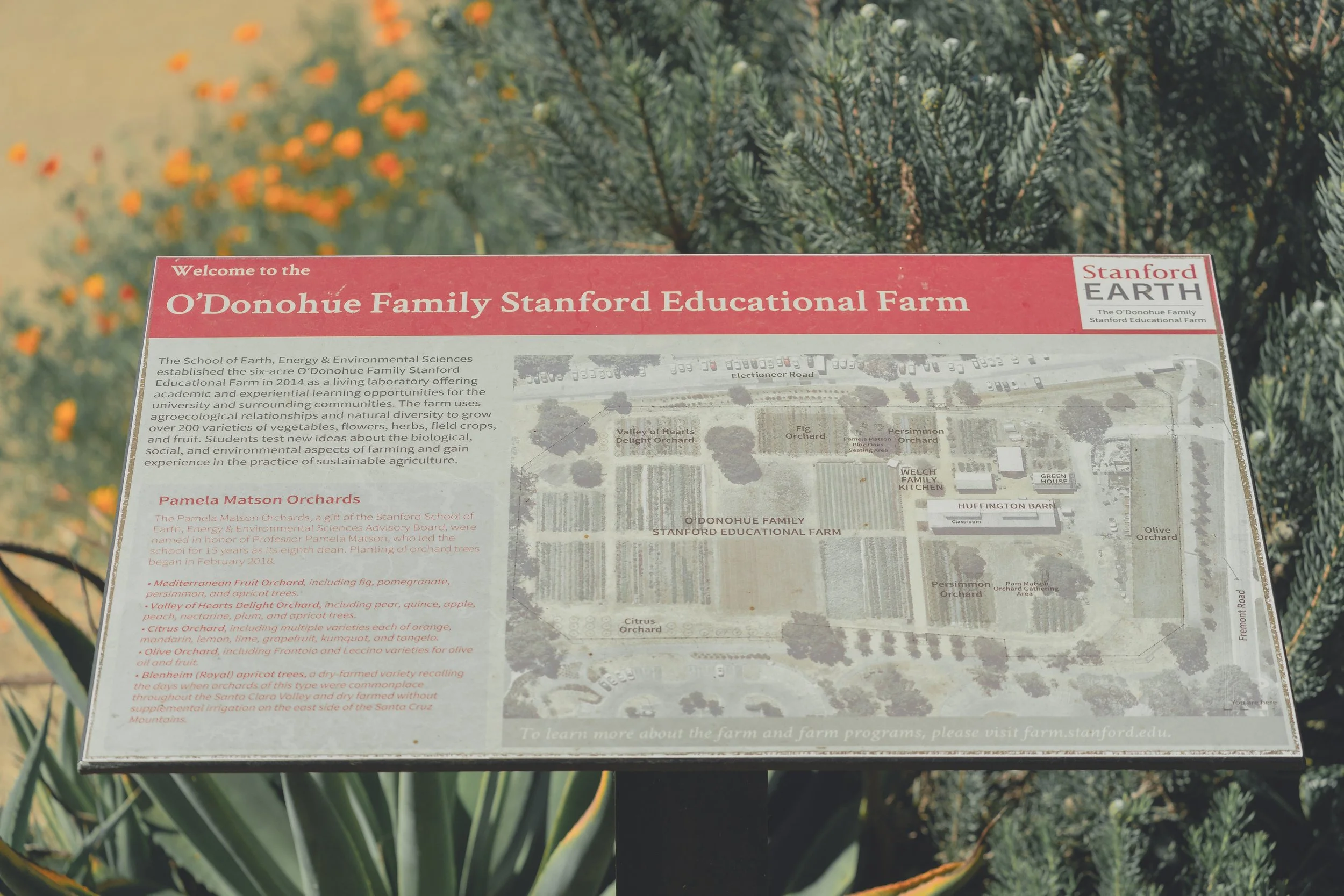 Sign at O'Donohue Family Stanford Educational Farm with map and description of the farm's educational offerings and layout.