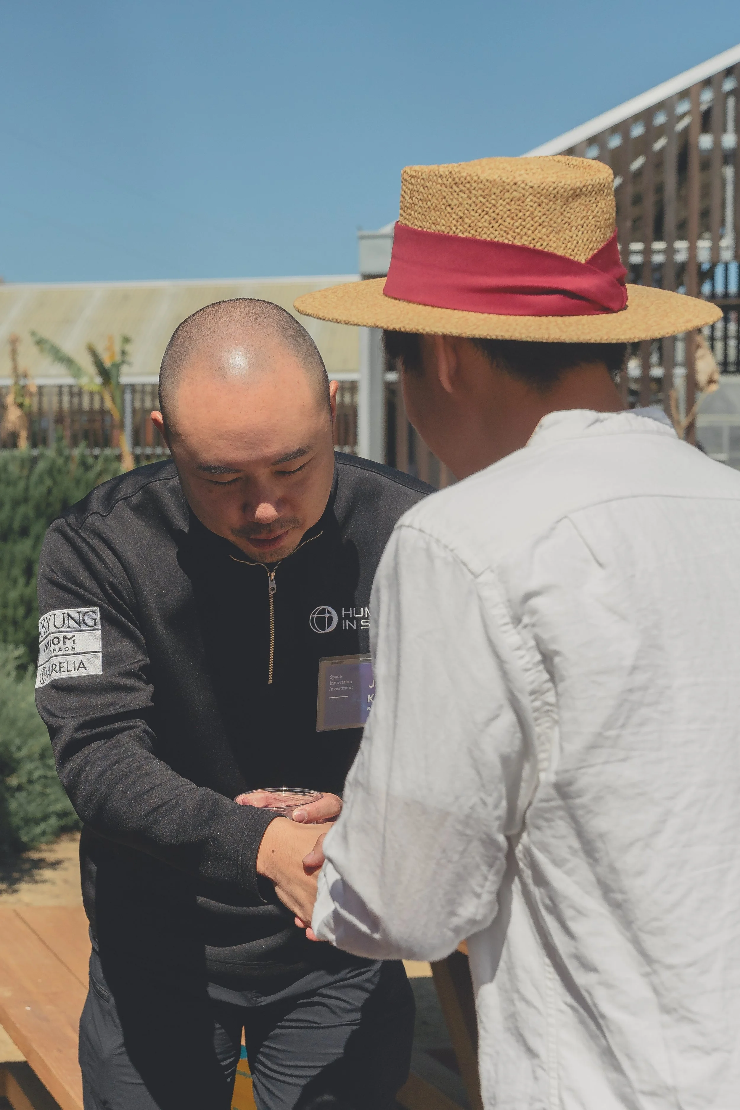 Two men interacting outdoors, one wearing a straw hat and white shirt, the other in a black jacket with a name tag, engaged in a handshake or exchange.