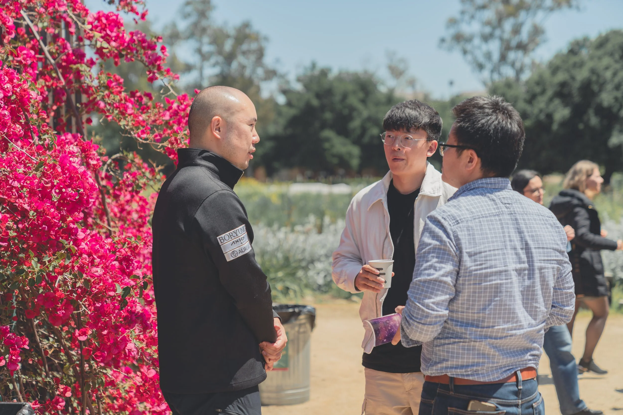 Three people standing outdoors having a conversation, with one wearing a 'Humans In Space' jacket. A person in the background is holding a plate, and there are pink flowers in the foreground.