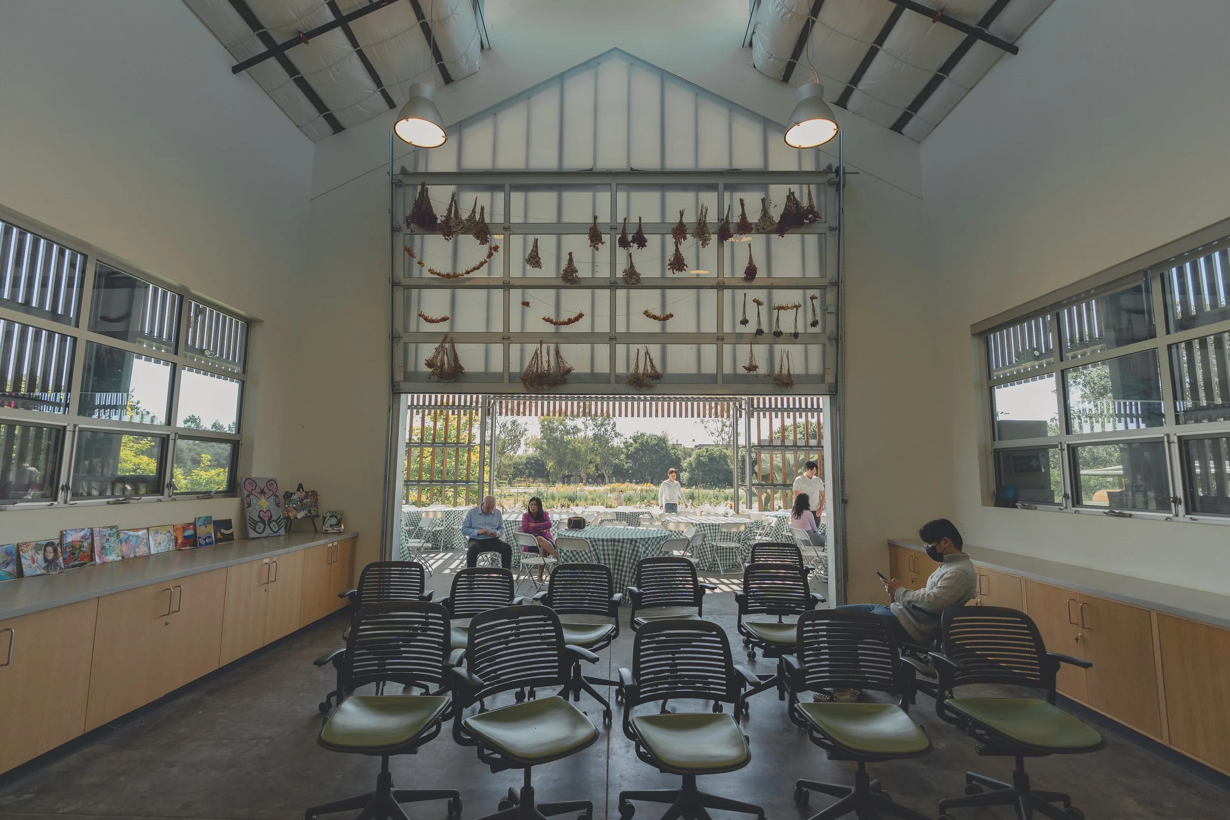 Interior of a modern room with rows of chairs facing a large open door. Artwork and decorations, including hanging arrangements, are visible on the walls. Several people are seated or standing near tables outside the open entrance, with sunlight illu