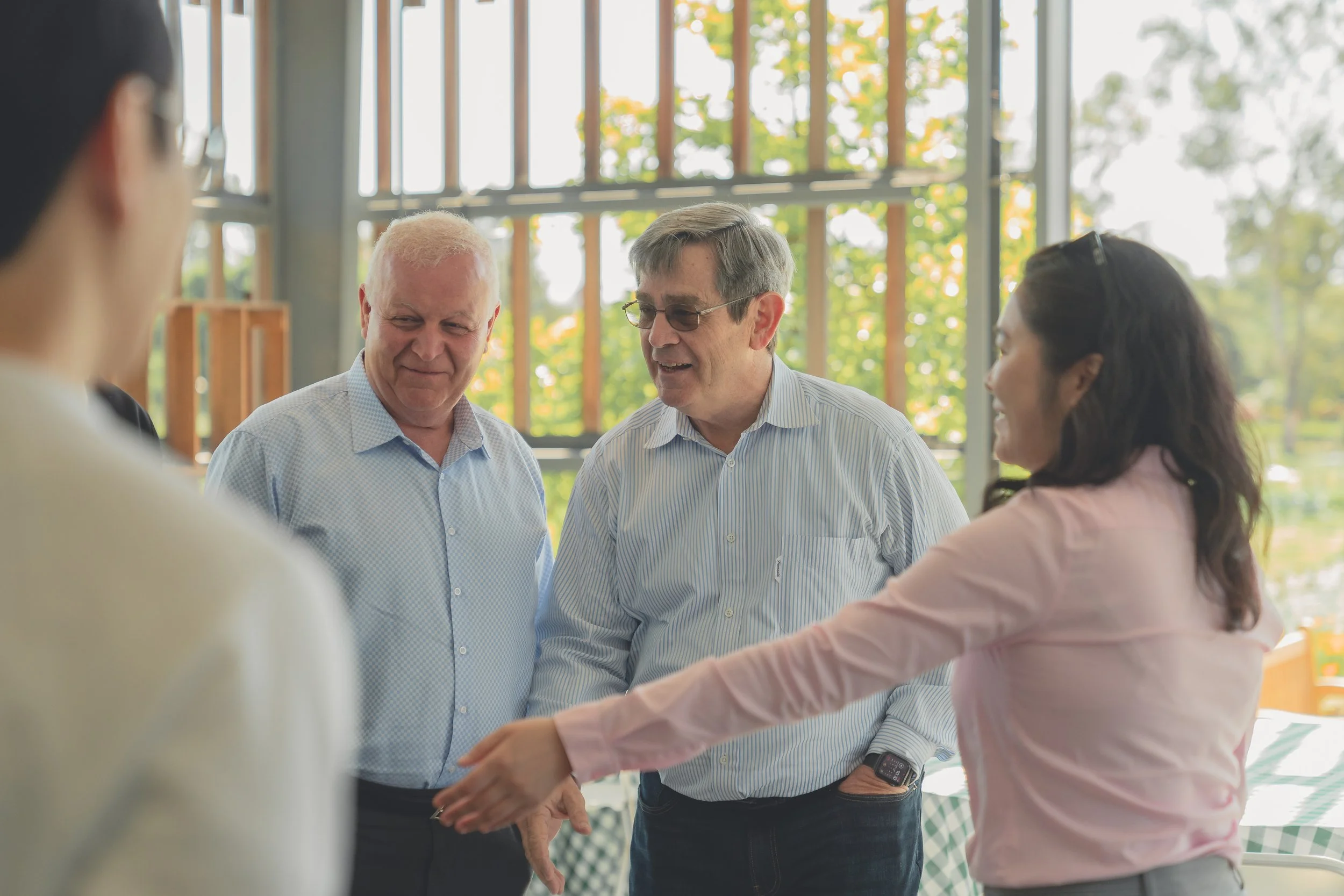 A group of people standing and talking in a well-lit room with large windows. They appear to be engaged in conversation, smiling, and interacting positively. The setting includes a checkered table in the background and greenery visible through the wi
