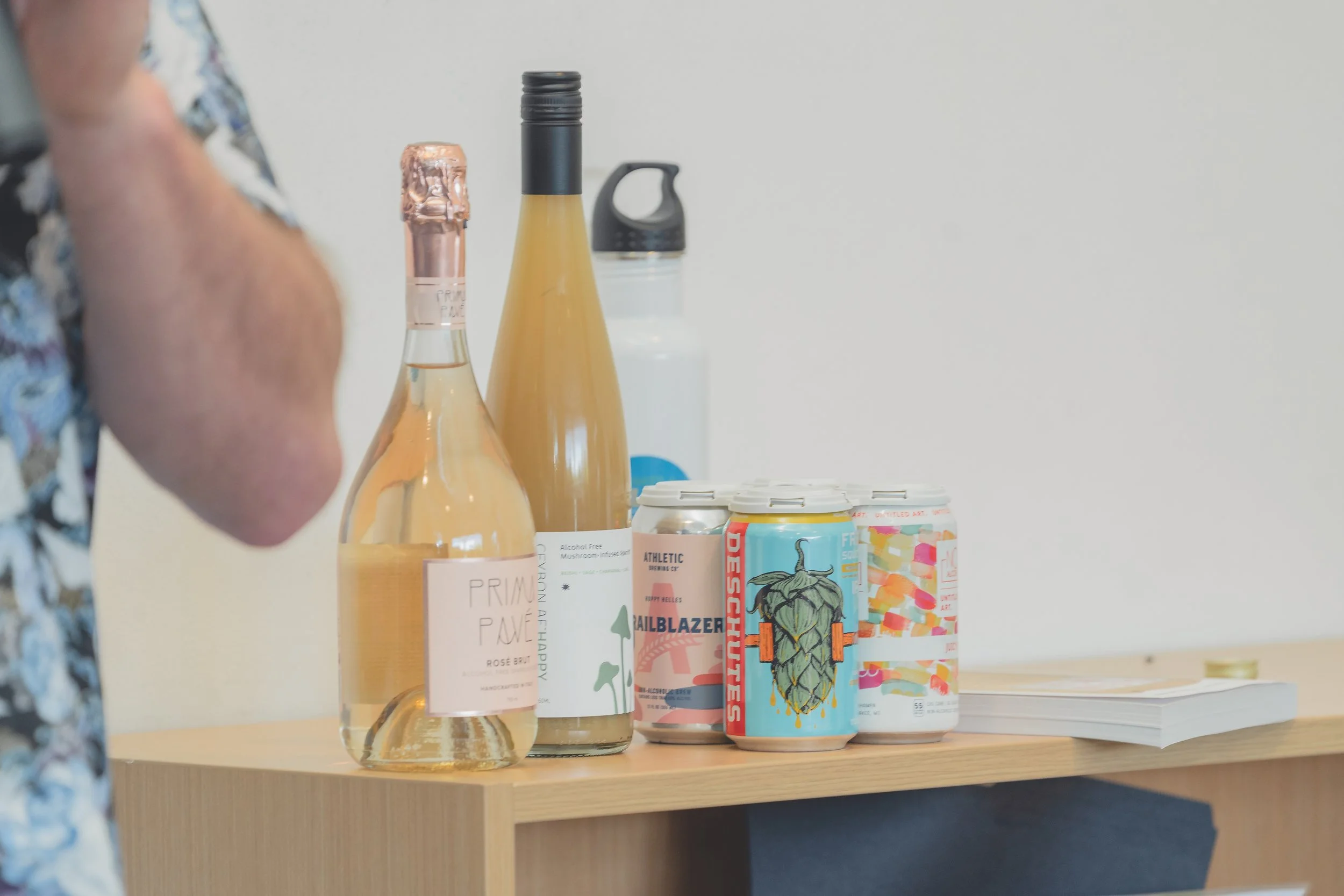 Variety of alcoholic and non-alcoholic beverage bottles and cans on a wooden shelf, including rosé wine, a tall bottle with a black cap, several colorful beer cans, and a water bottle.