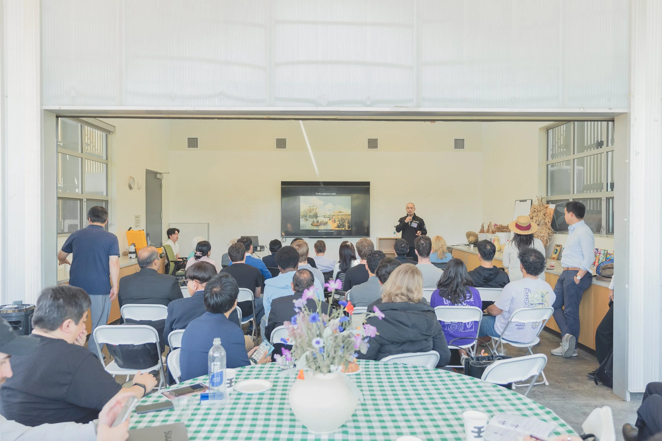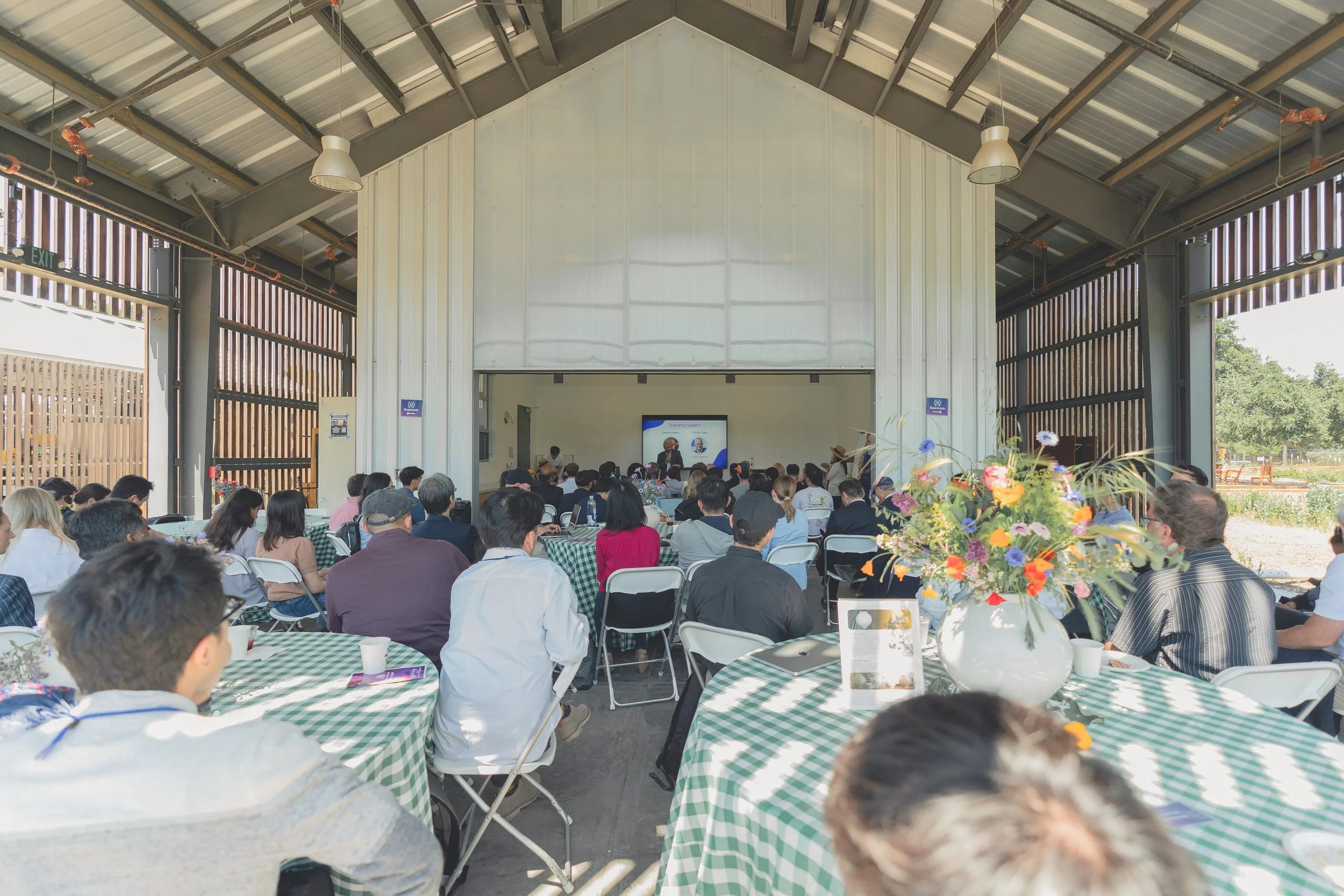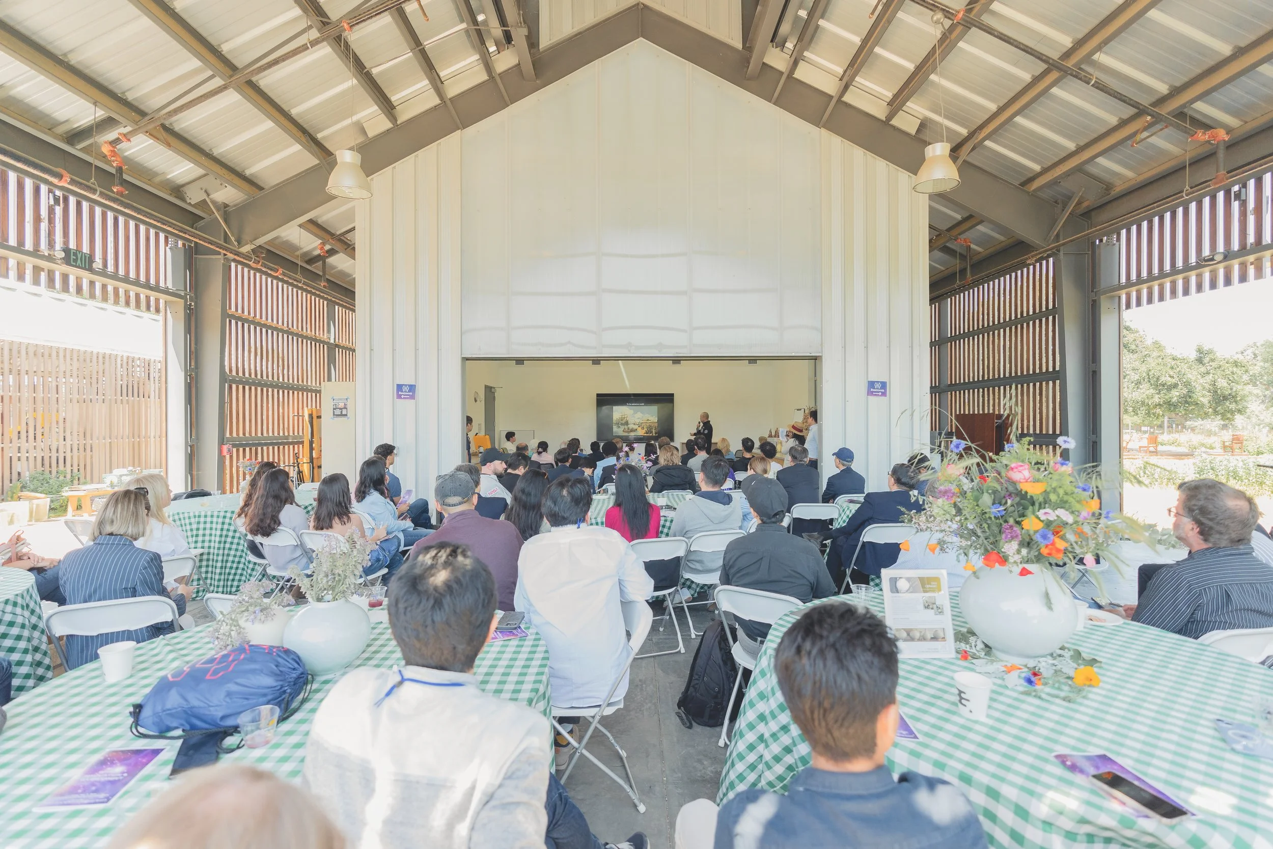 A group of people attending a presentation in a barn-style venue with a high ceiling, seated on white chairs around tables with green checkered tablecloths. A speaker stands in front of a projected screen, and there's a large vase of colorful flowers