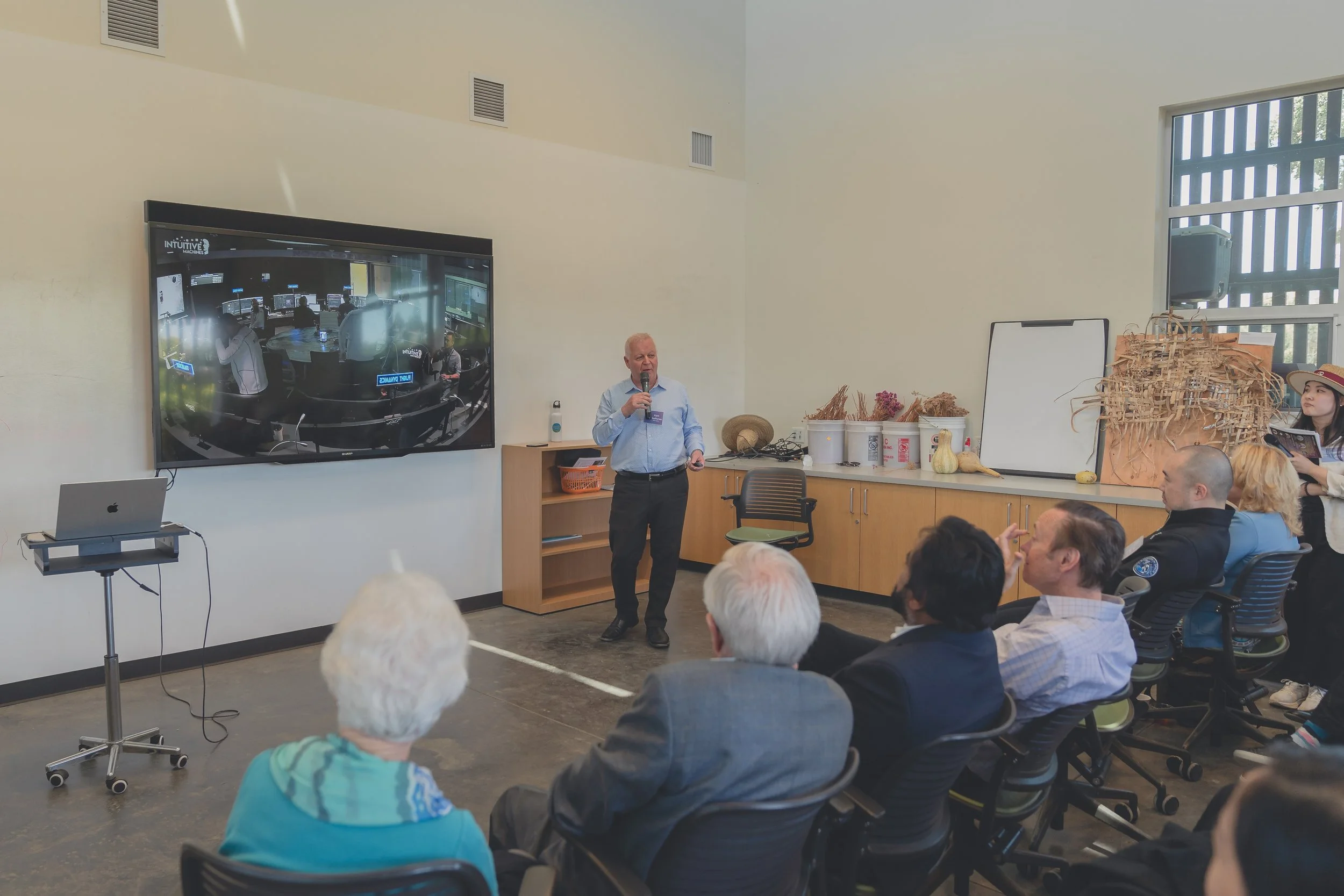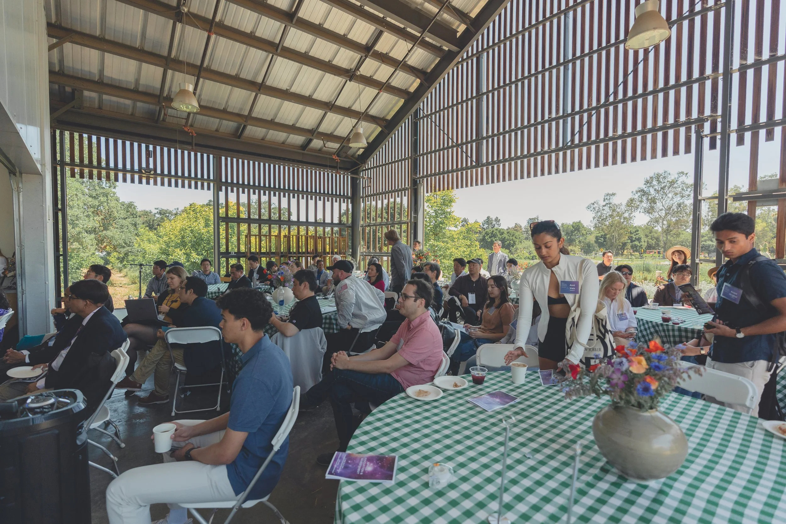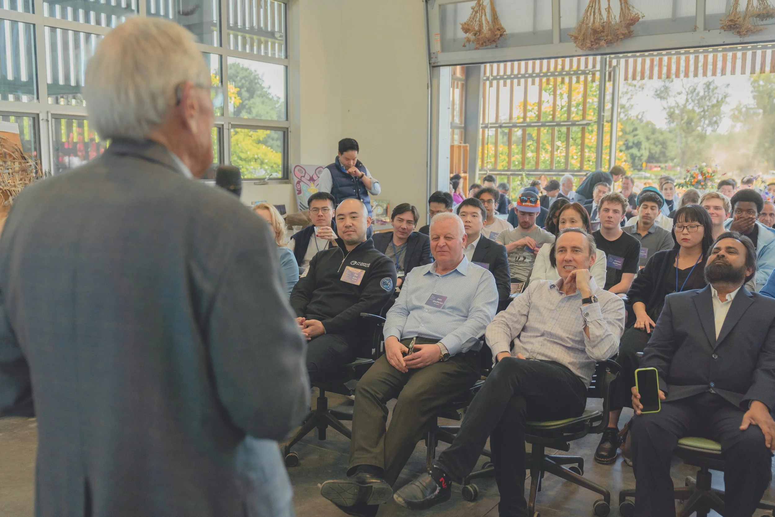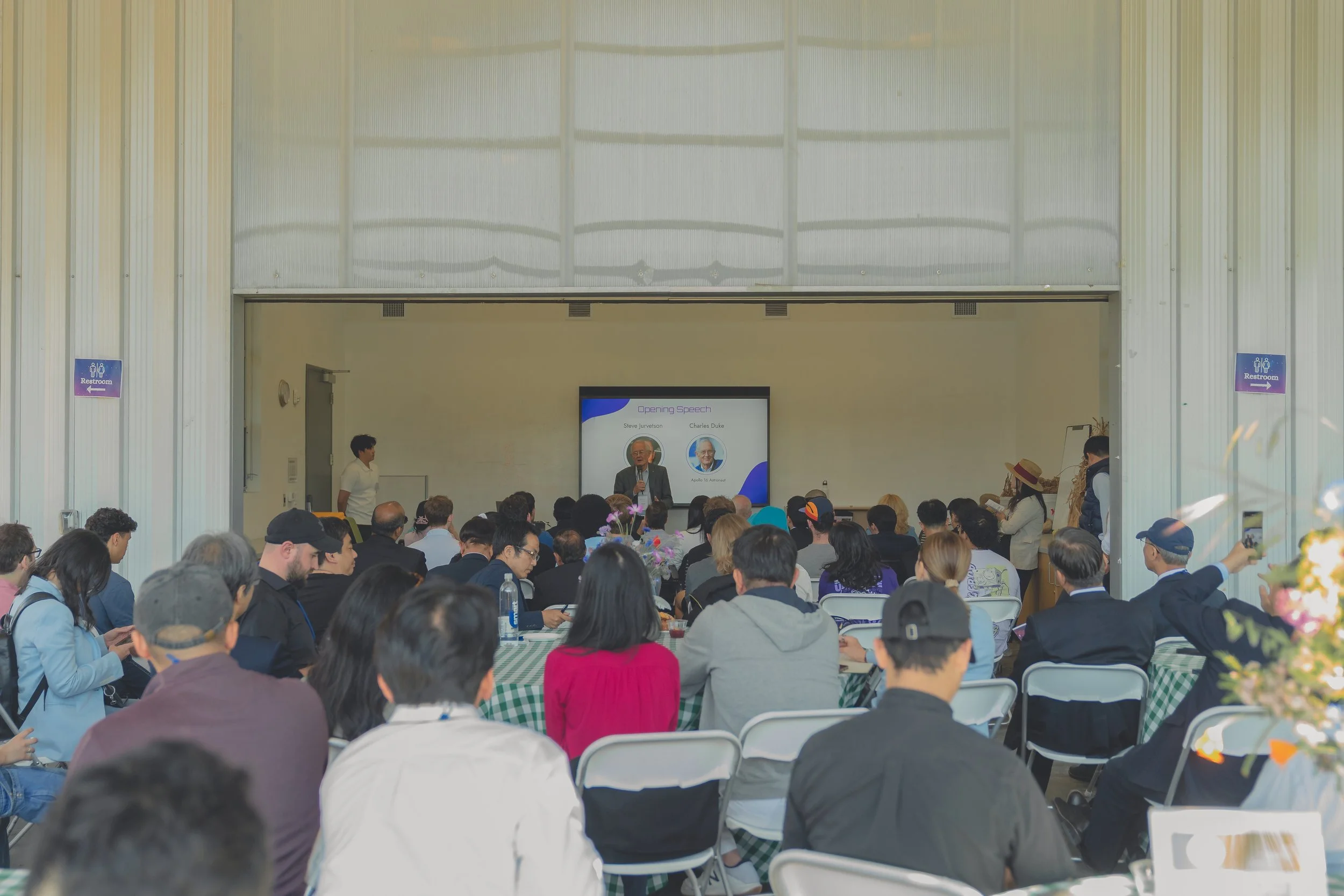 A group of people attending a presentation in a barn-style venue with a high ceiling, seated on white chairs around tables with green checkered tablecloths. A speaker stands in front of a projected screen, and there's a large vase of colorful flowers