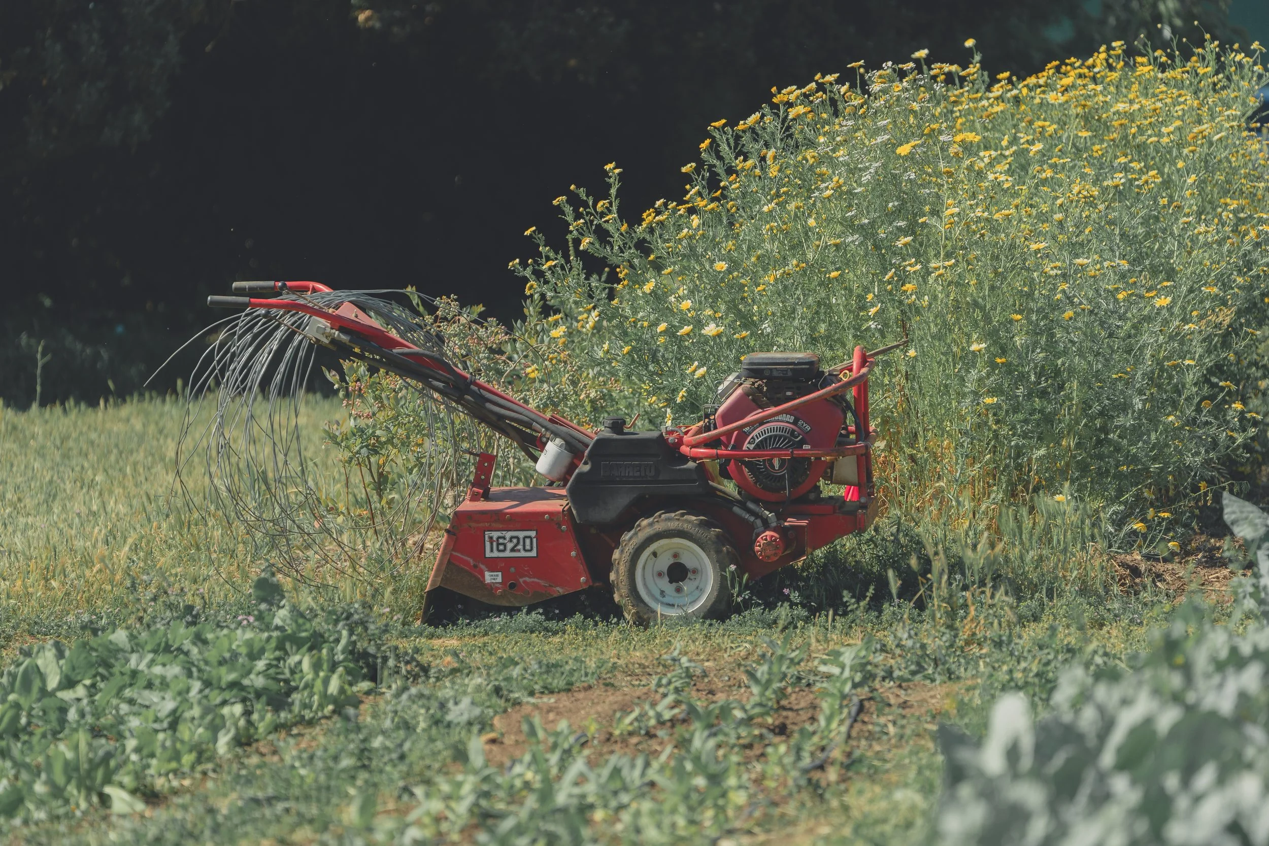 Red rotary tiller in a grassy field with yellow wildflowers in the background.