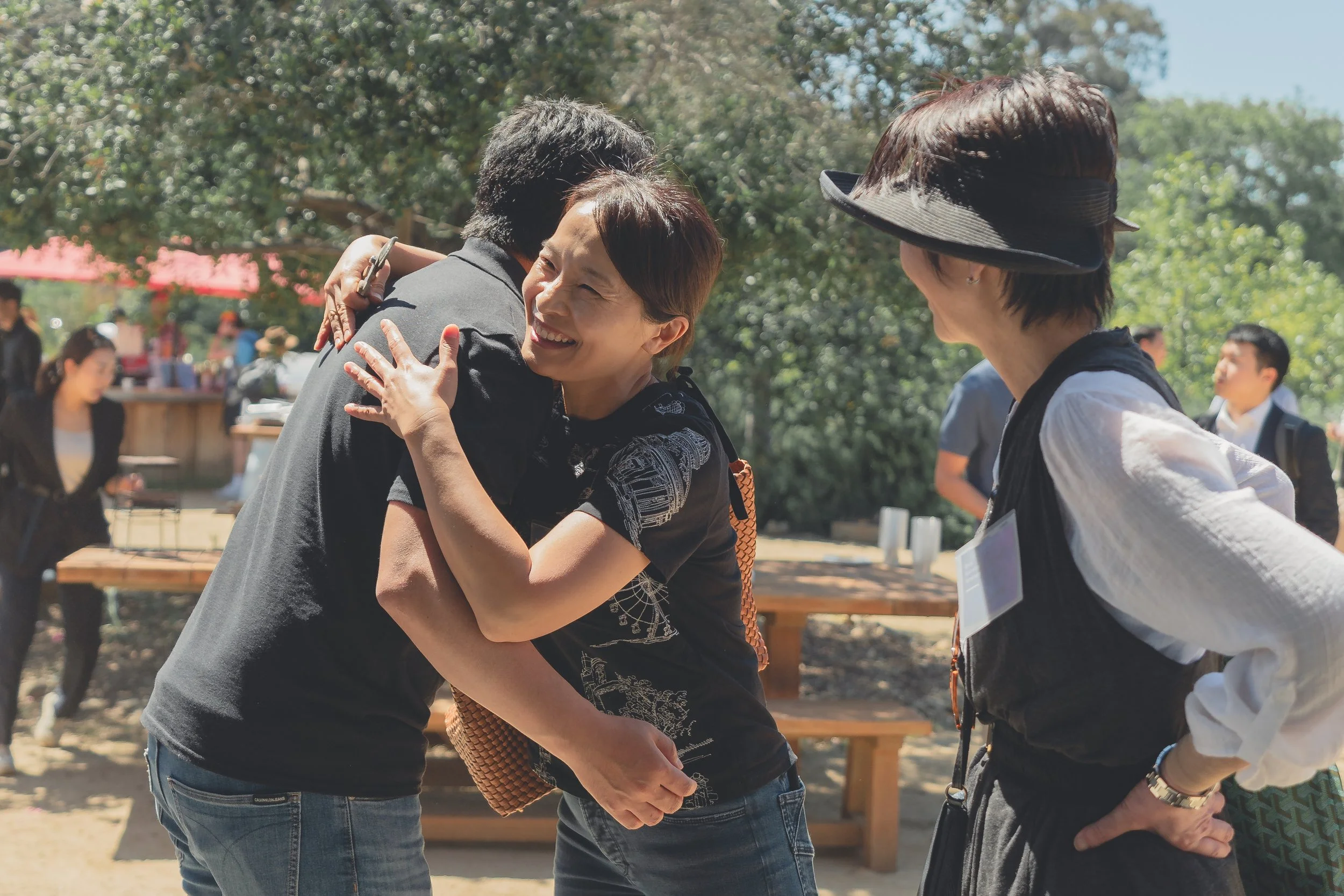 Three people gathering outdoors, with one woman smiling and hugging a man, while another woman observes, all under sunny, tree-shaded surroundings.