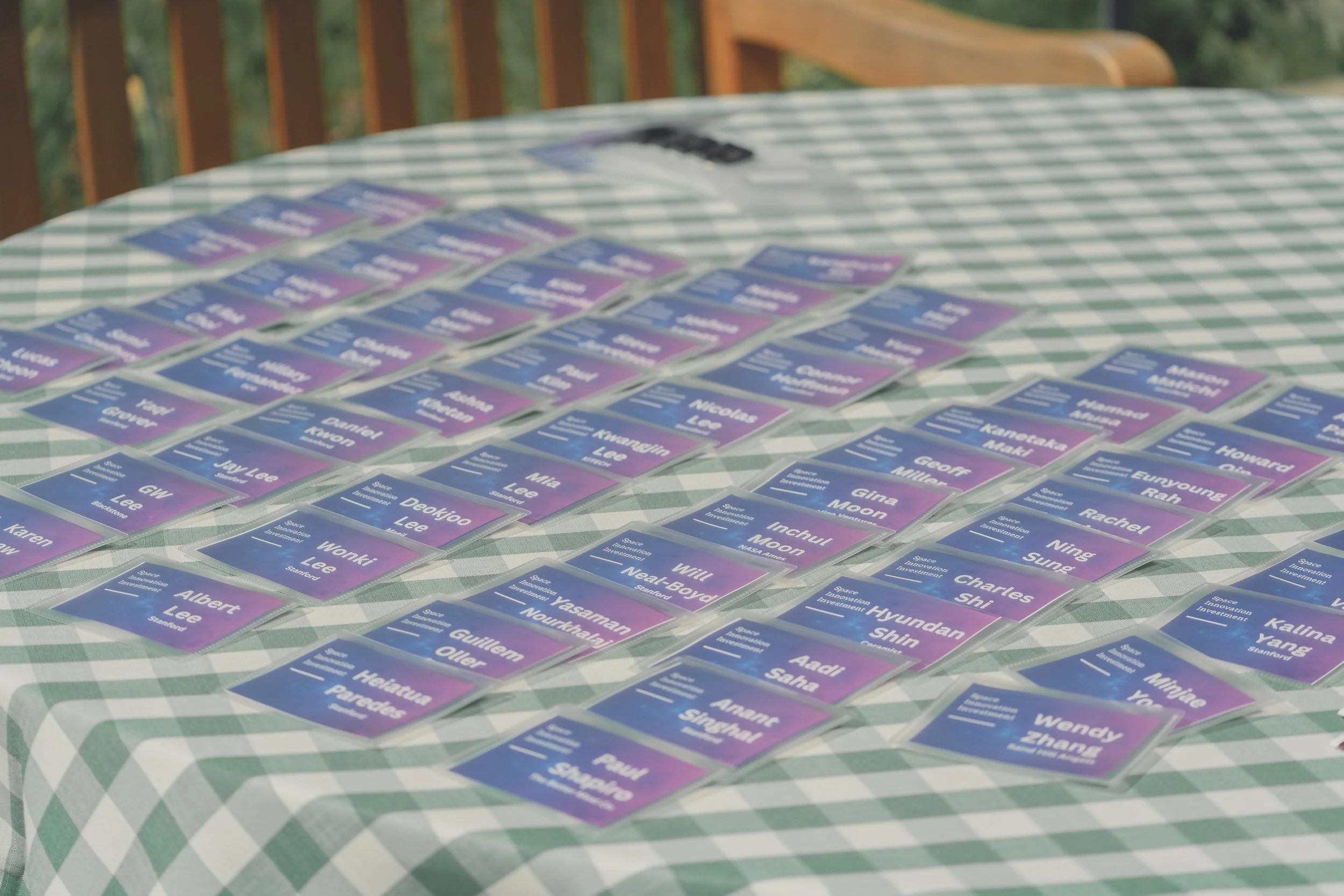 A book titled "Moonwalker" with an astronaut on the cover rests on a checkered tablecloth. Nearby are name tags and printed materials.