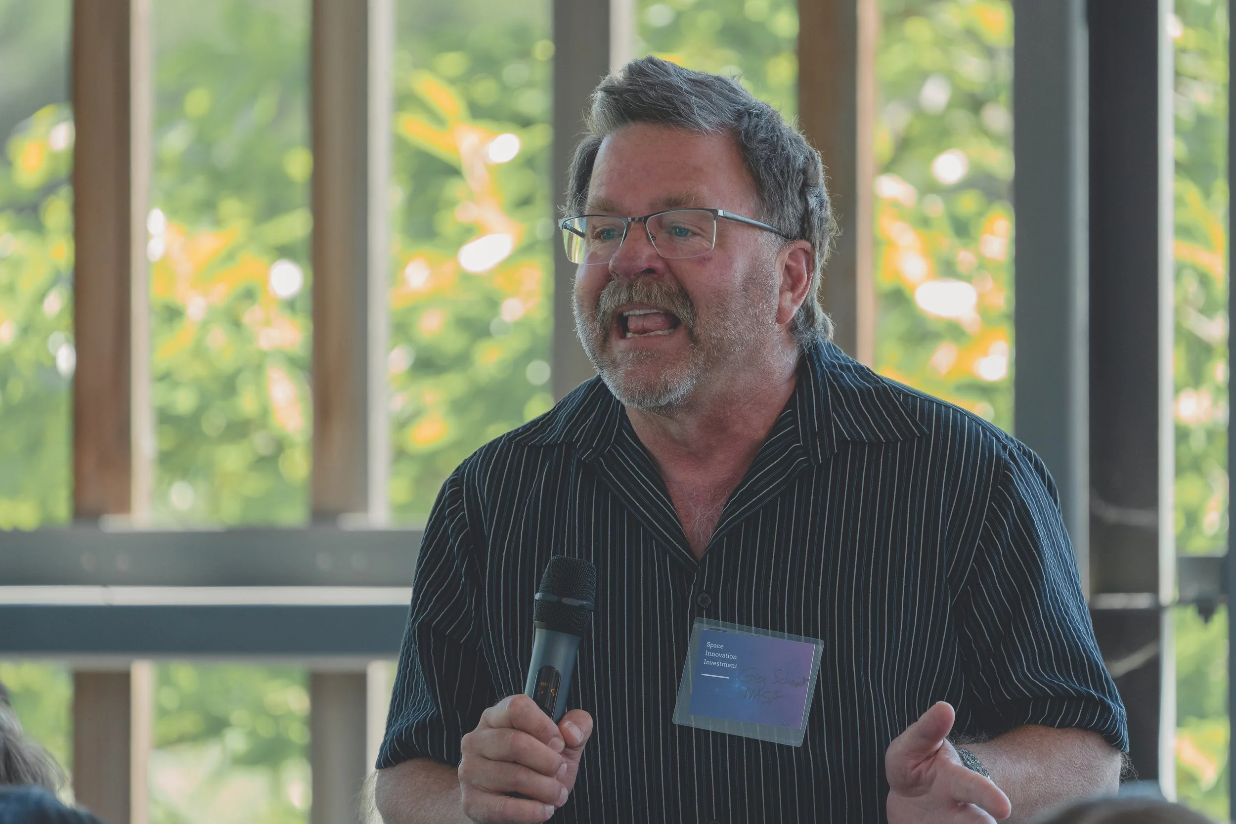 A man holding a microphone, wearing a 'Humans in Space' jacket and a name tag, looking upwards.