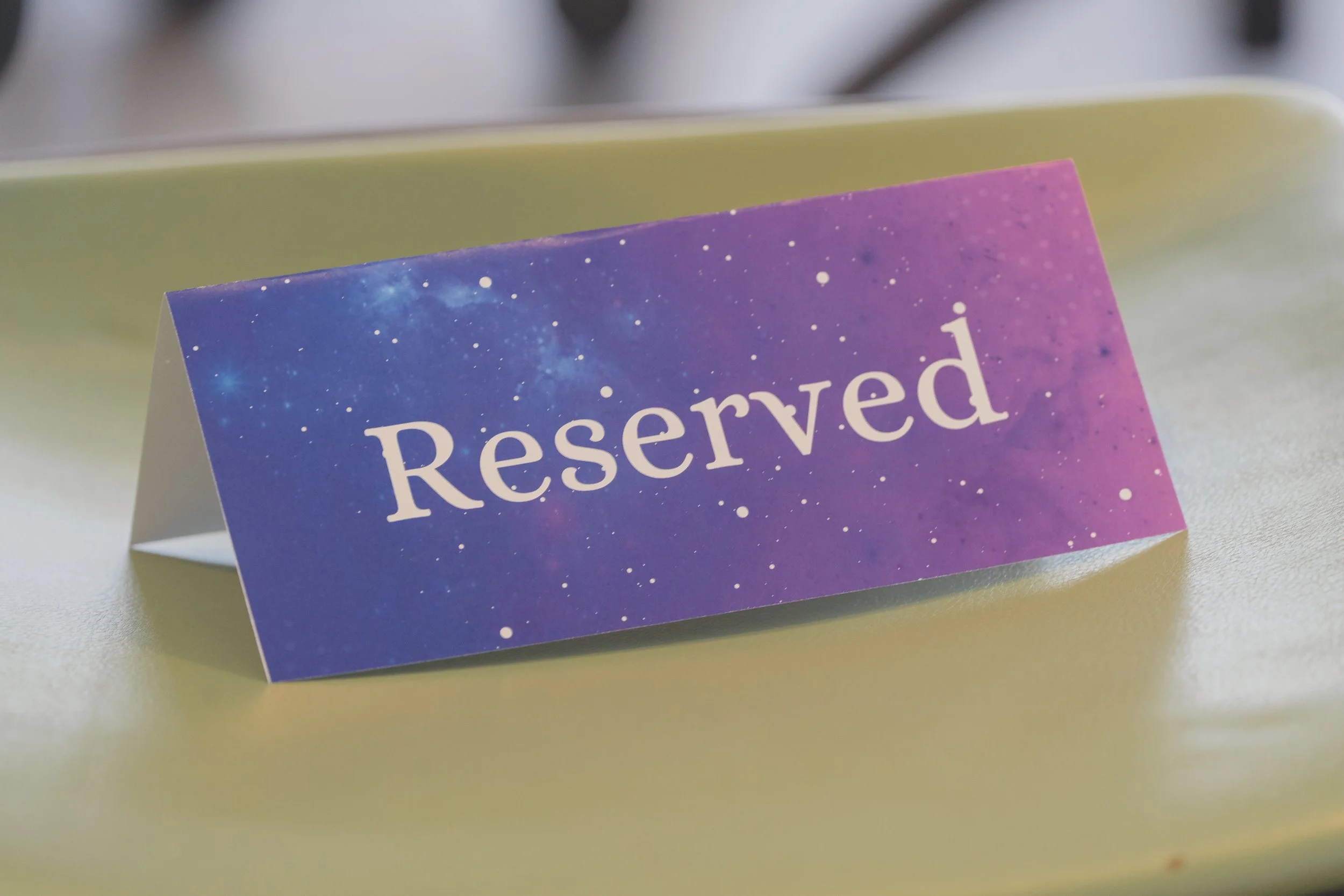 A purple and blue "Reserved" sign with a galaxy design resting on a green surface.