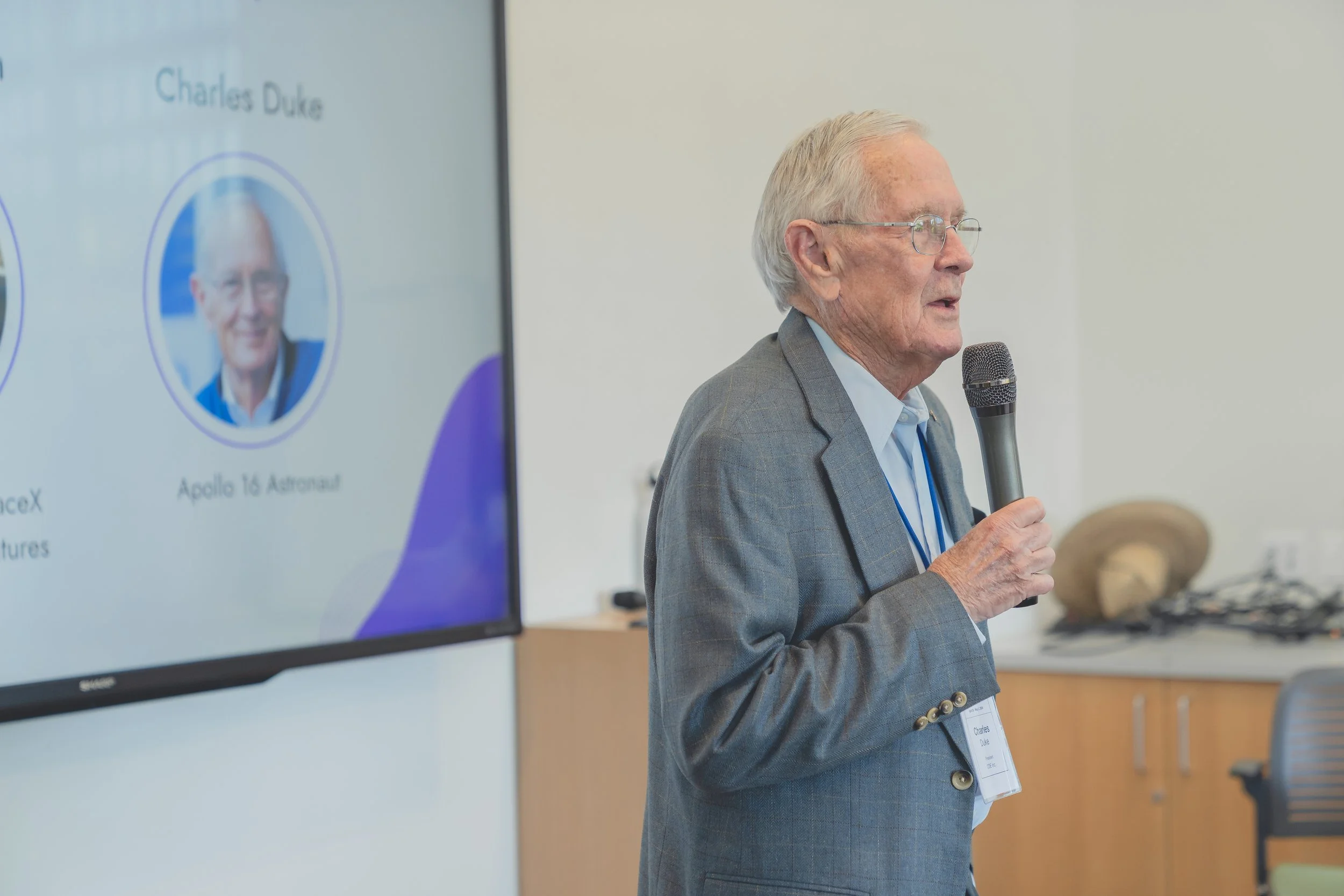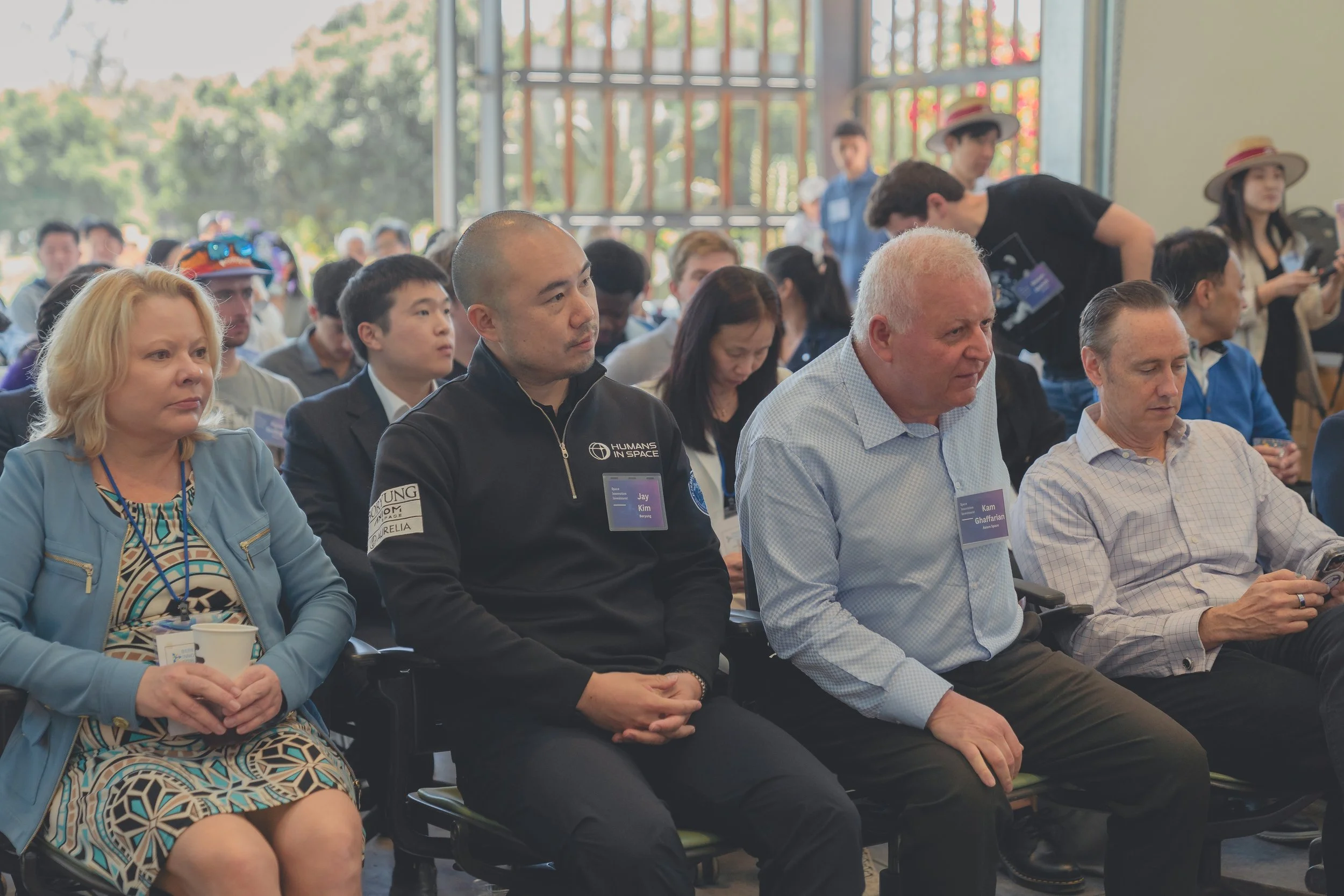 A person speaking into a microphone at a conference, wearing a black "Humans in Space" jacket, with an audience in the foreground.