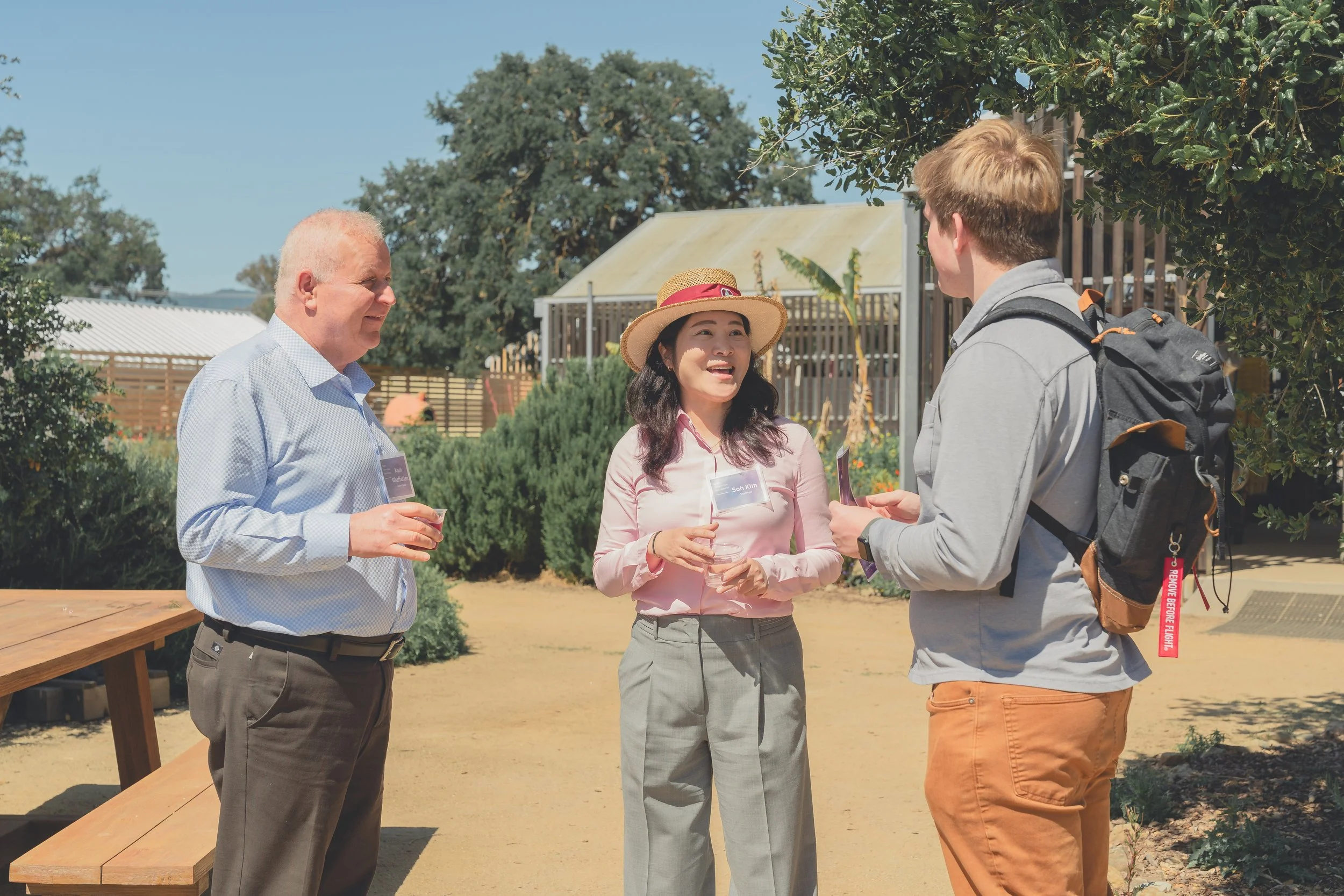 Three people having a conversation outdoors, with trees and a building in the background. One person is wearing a straw hat, and another has a backpack.