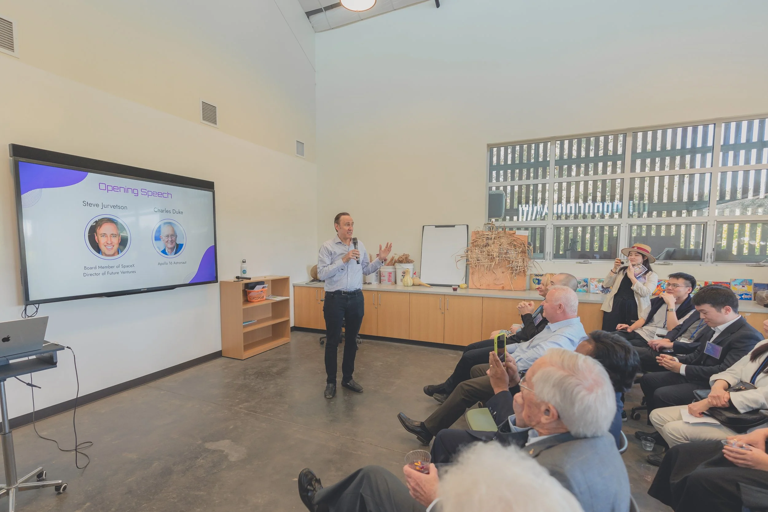 A man speaking into a microphone wearing a 'Humans in Space' jacket.