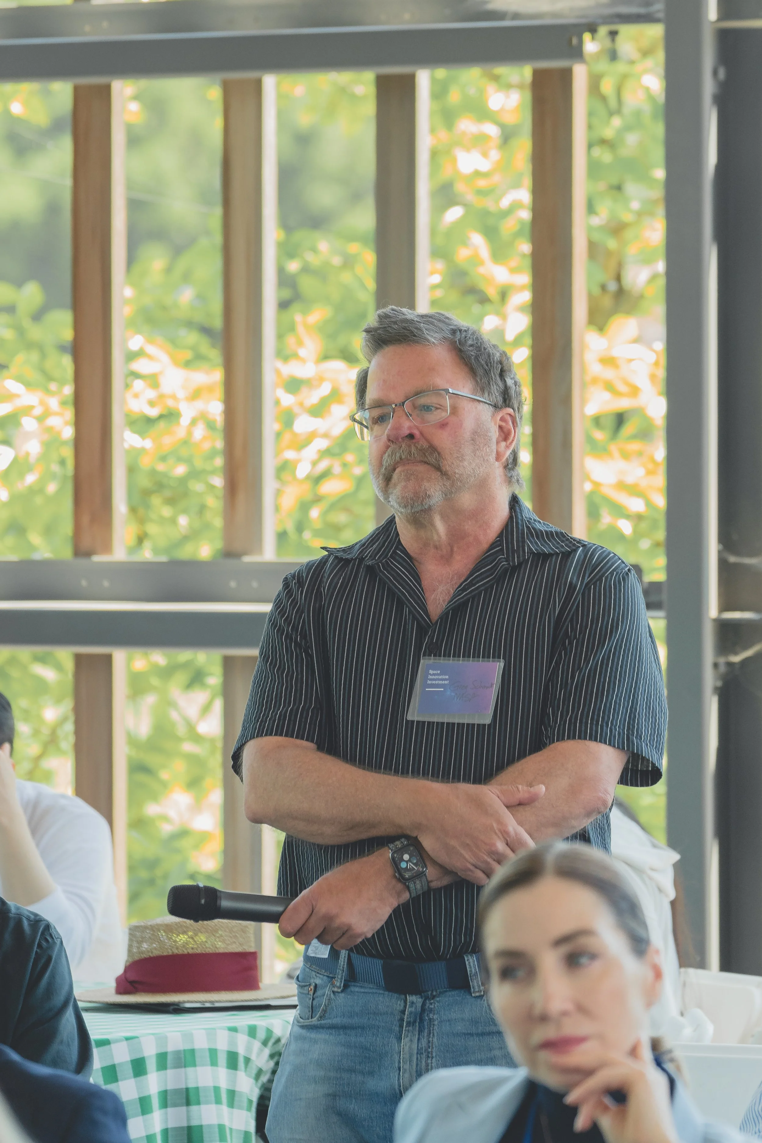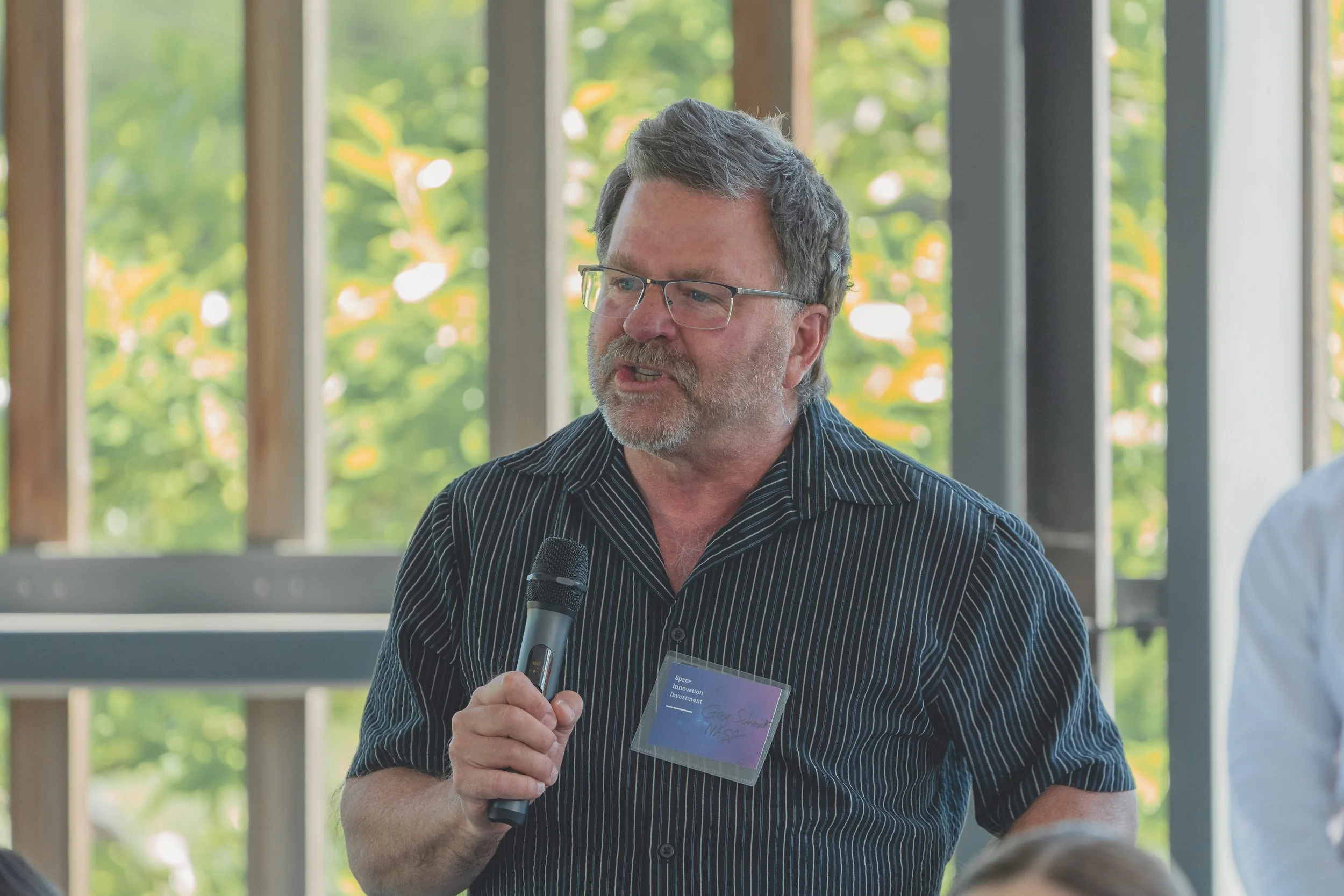 Man speaking into microphone wearing a blue checkered shirt with a name badge