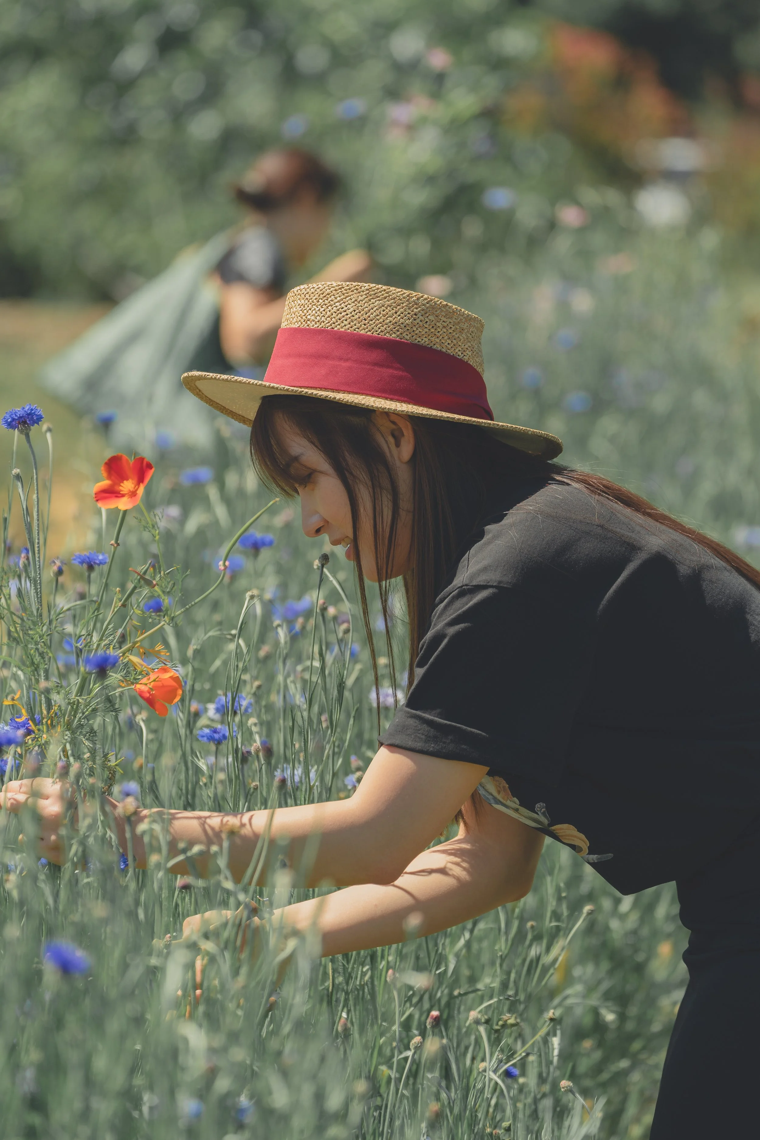 Person gardening in a lush field with blooming flowers, wearing a straw hat and casual attire.