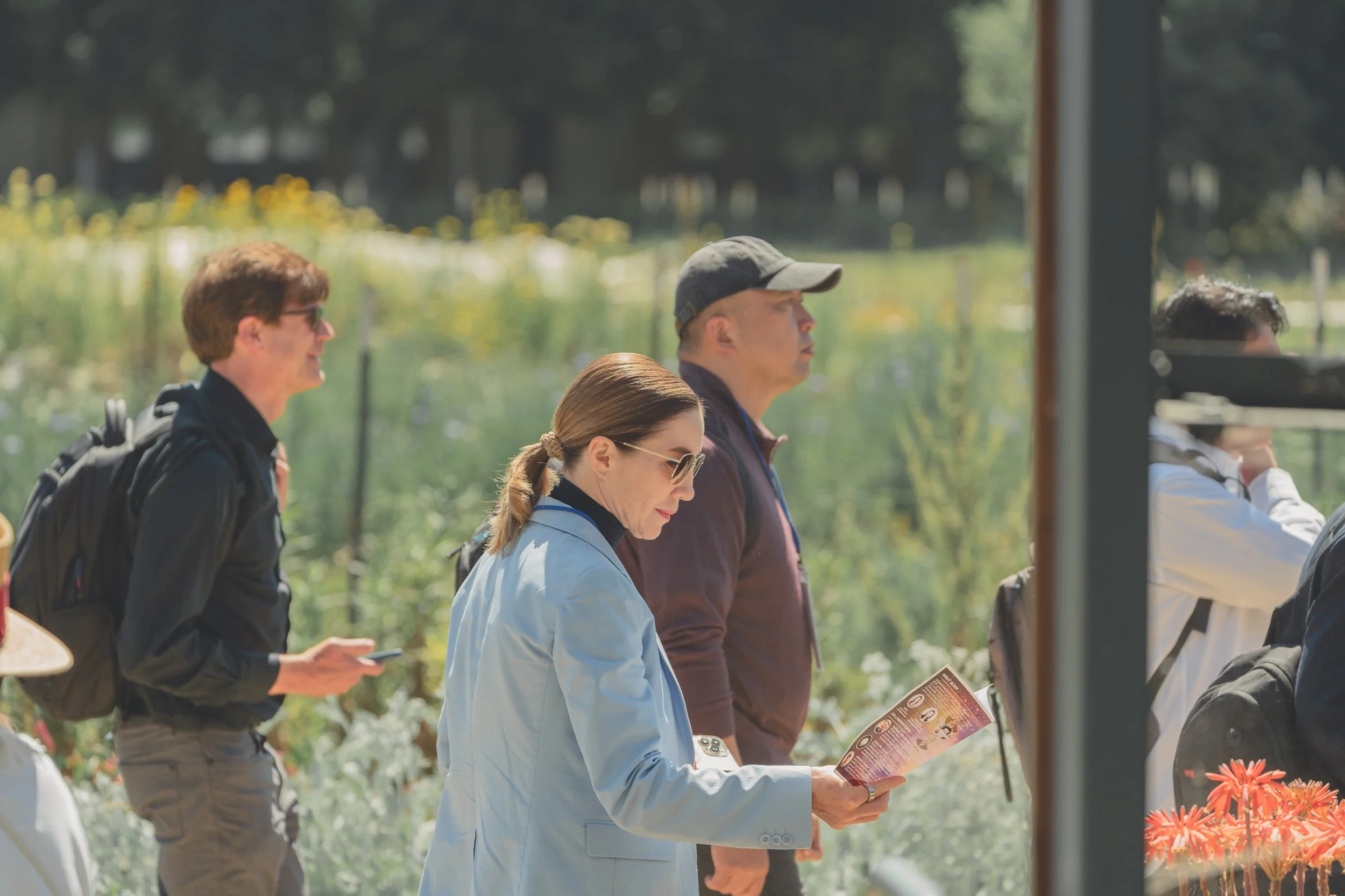 Three people having a conversation outdoors next to vibrant red flowers, with others in the background.
