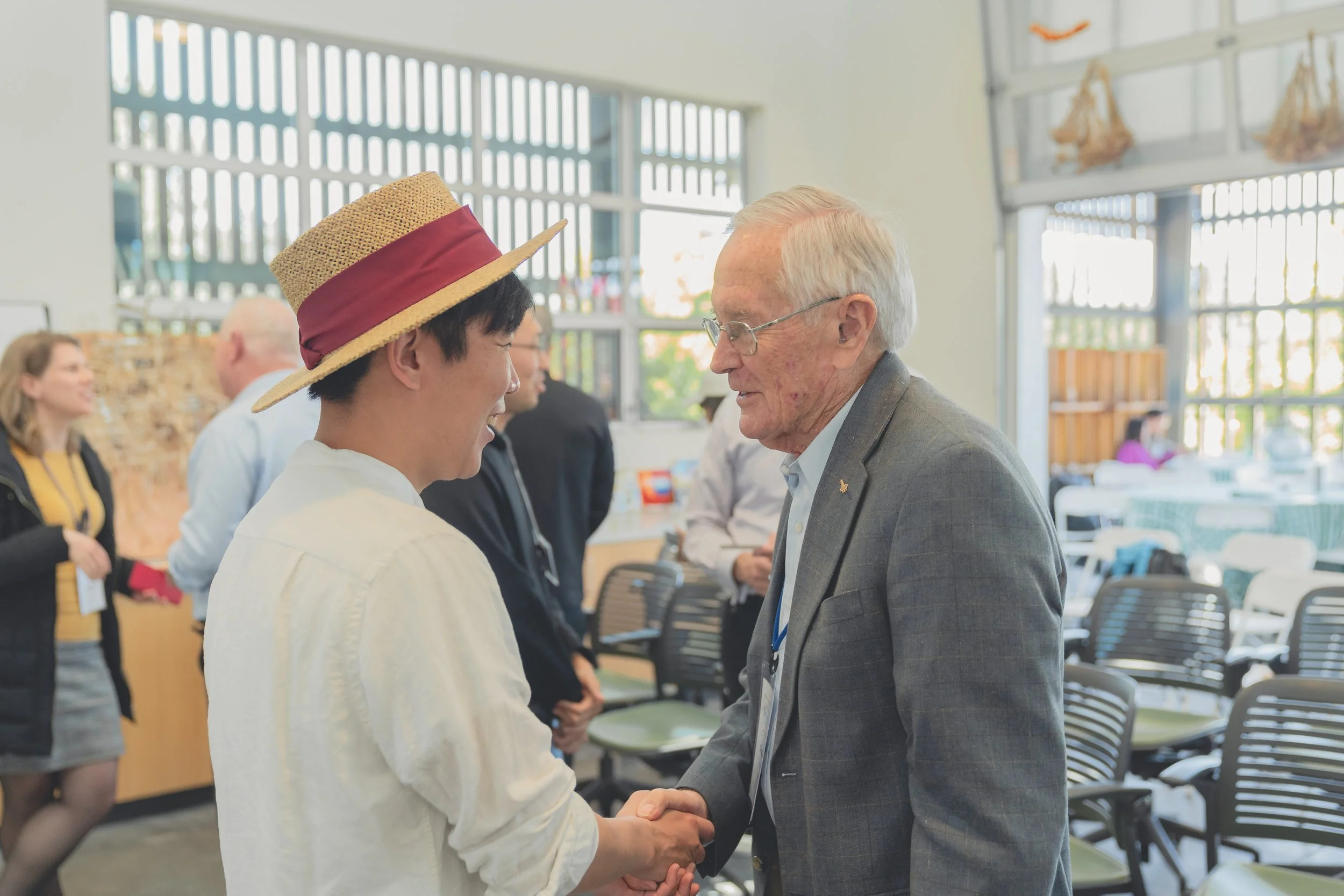 Two men shaking hands in a conference room, one in a straw hat and the other in a suit, with other people conversing in the background.