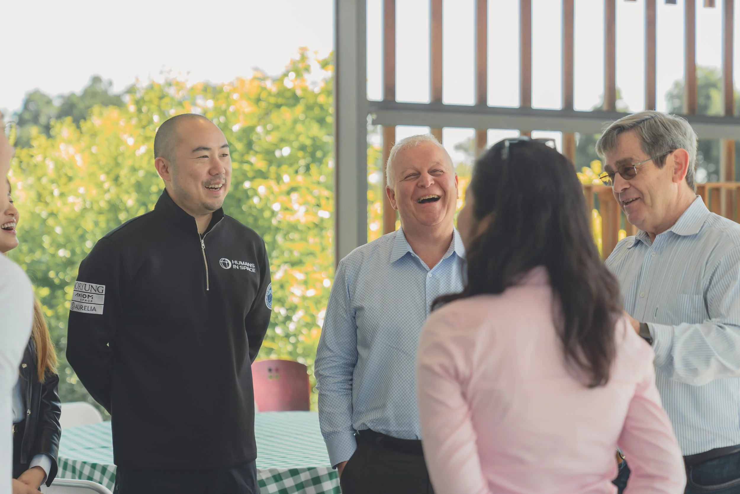 A group of four people standing and laughing, including a man in a 'Humans in Space' jacket, engaging in casual conversation outdoors with trees in the background.