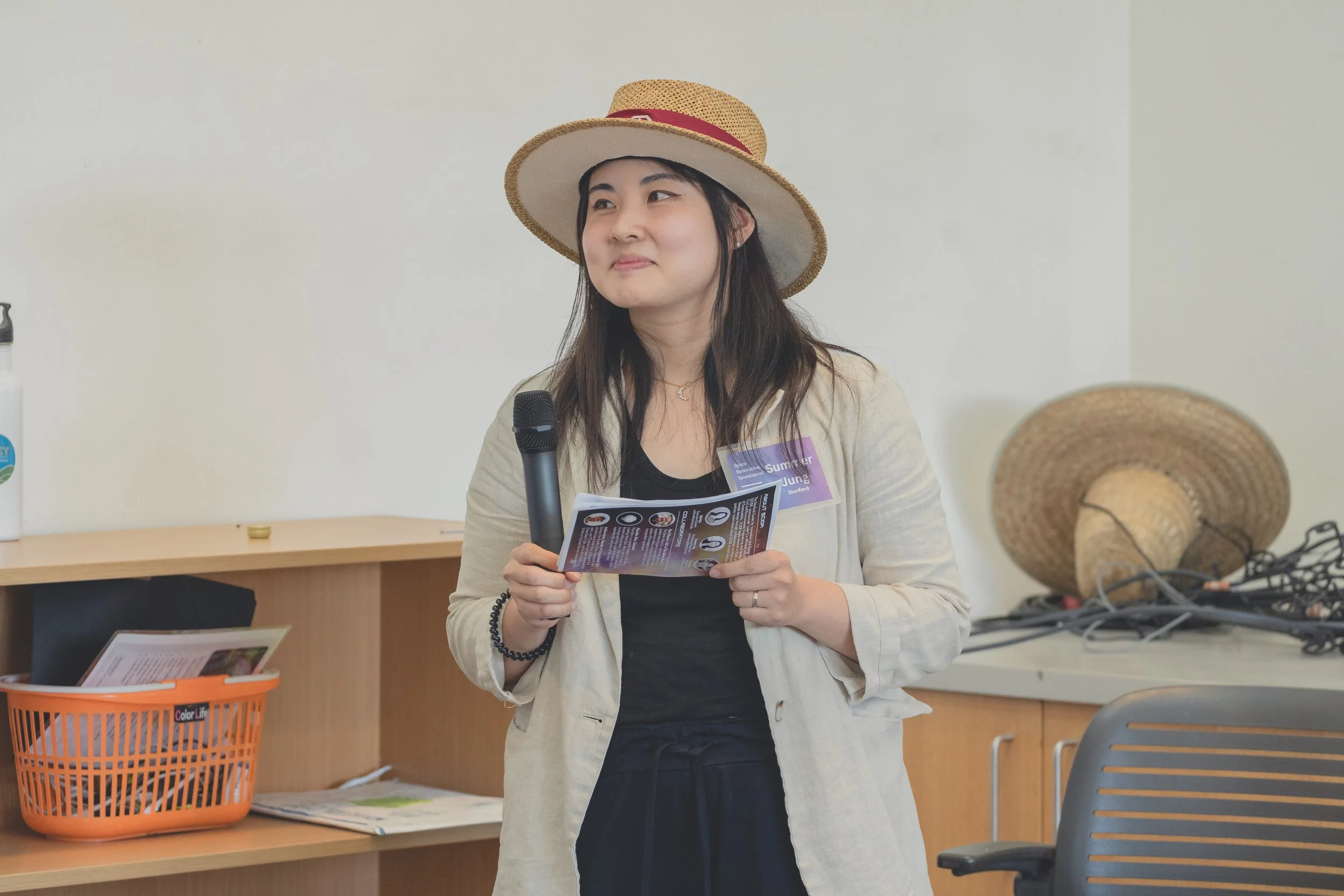 A person wearing a Humans in Space jacket speaks into a microphone, holding a pen. They have a name tag and there is a water bottle in the background.