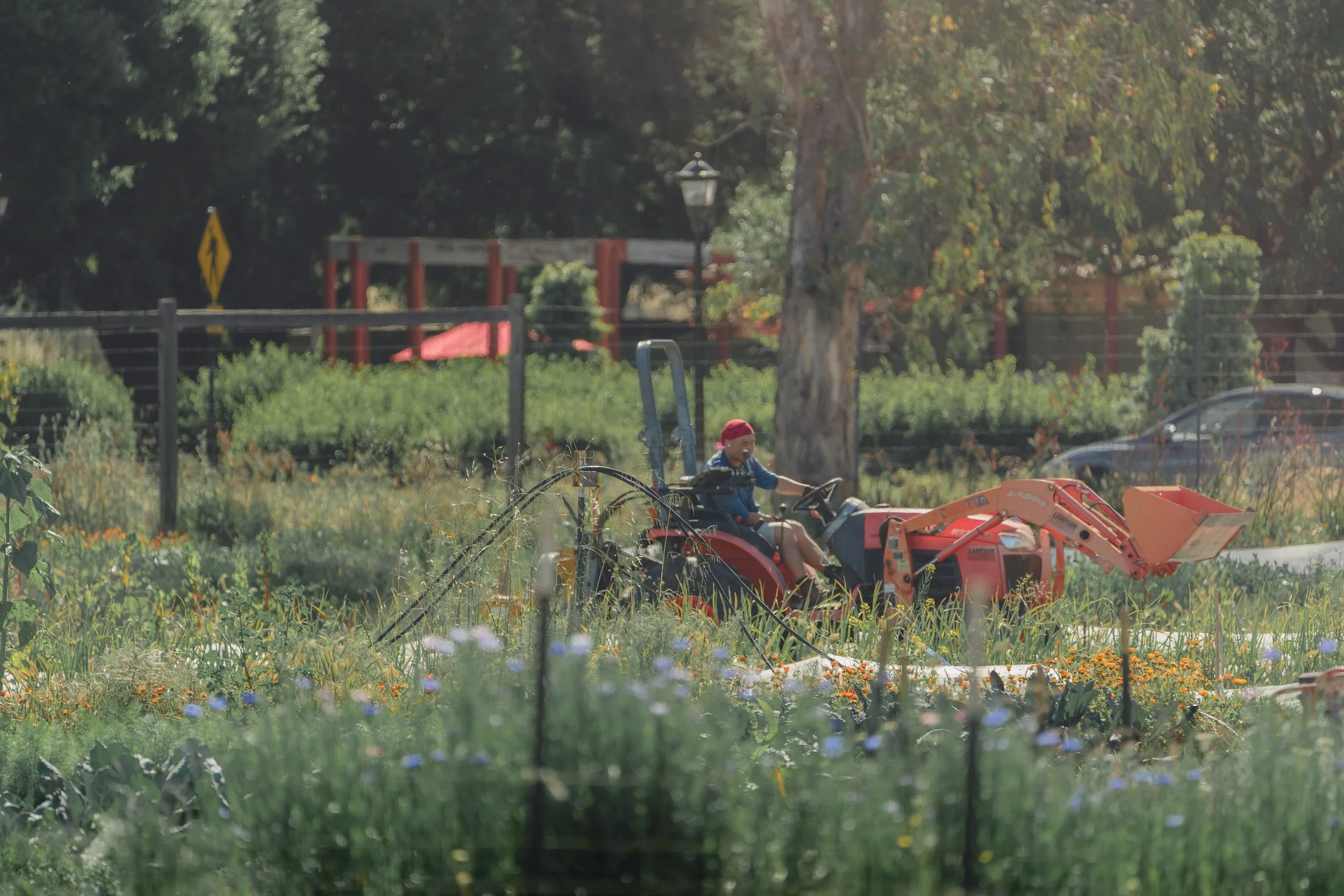 Person driving a red tractor through a lush garden area, surrounded by greenery and flowers.