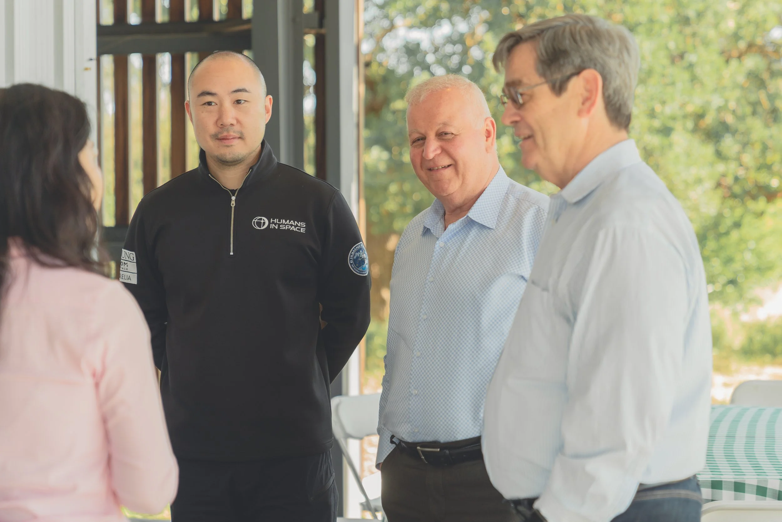 Four people talking outdoors, three men and a woman, two of the men wearing button-up shirts and one in a 'Humans in Space' jacket, with trees in the background.