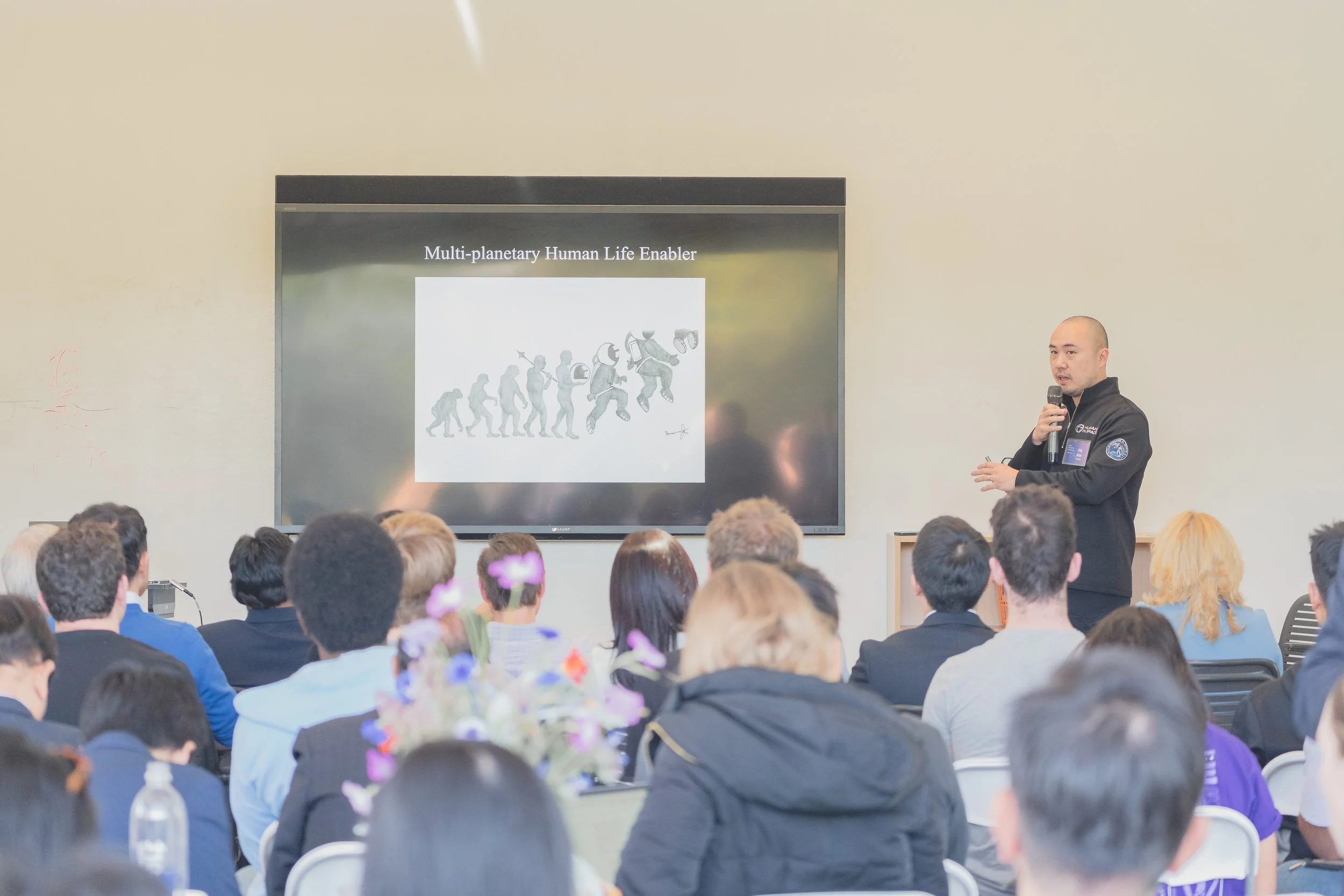 A person presenting to an audience with a slide titled 'Multi-planetary Human Life Enabler' depicting evolution stages.