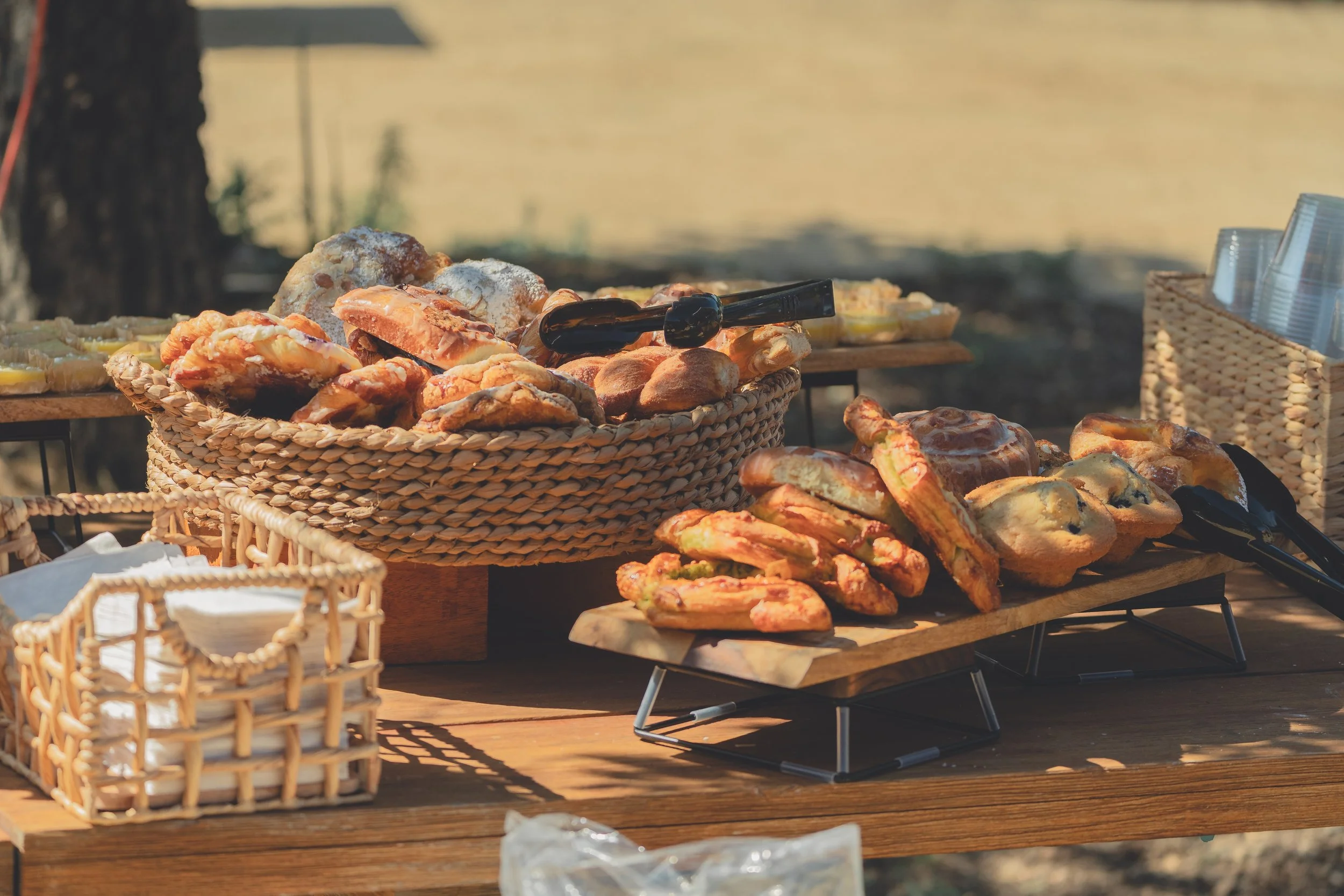 Assortment of pastries and baked goods on a wooden table with wicker baskets