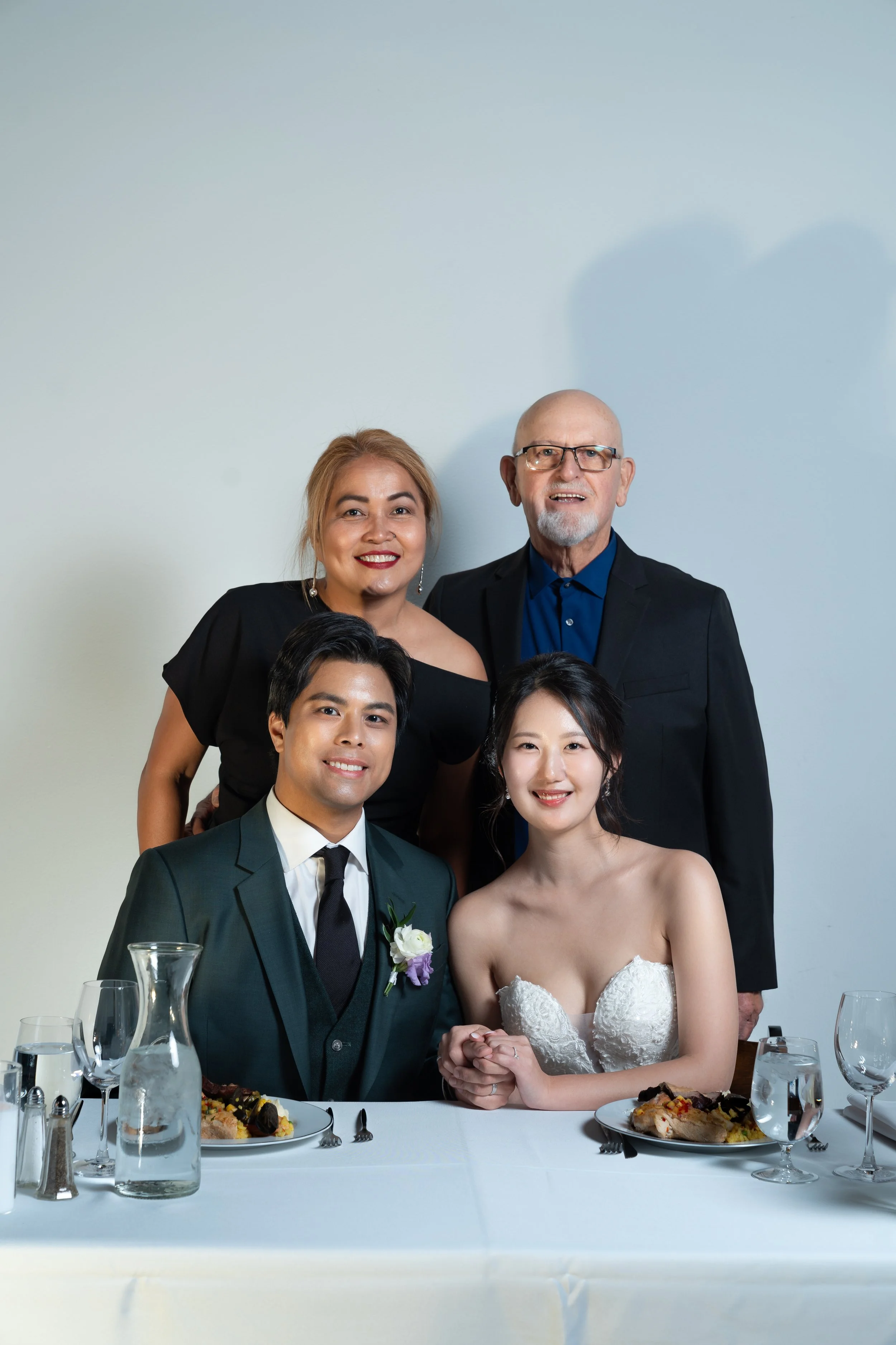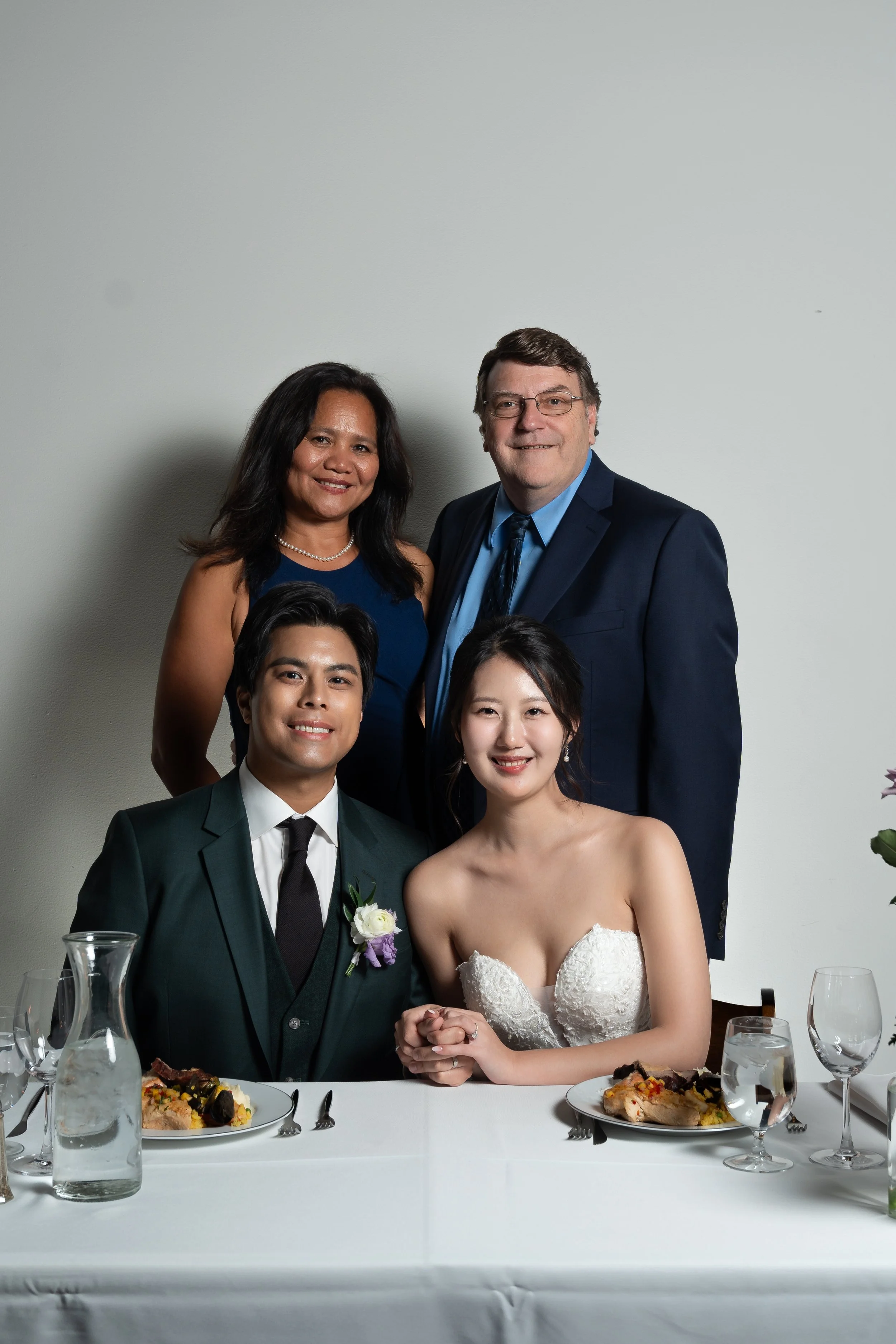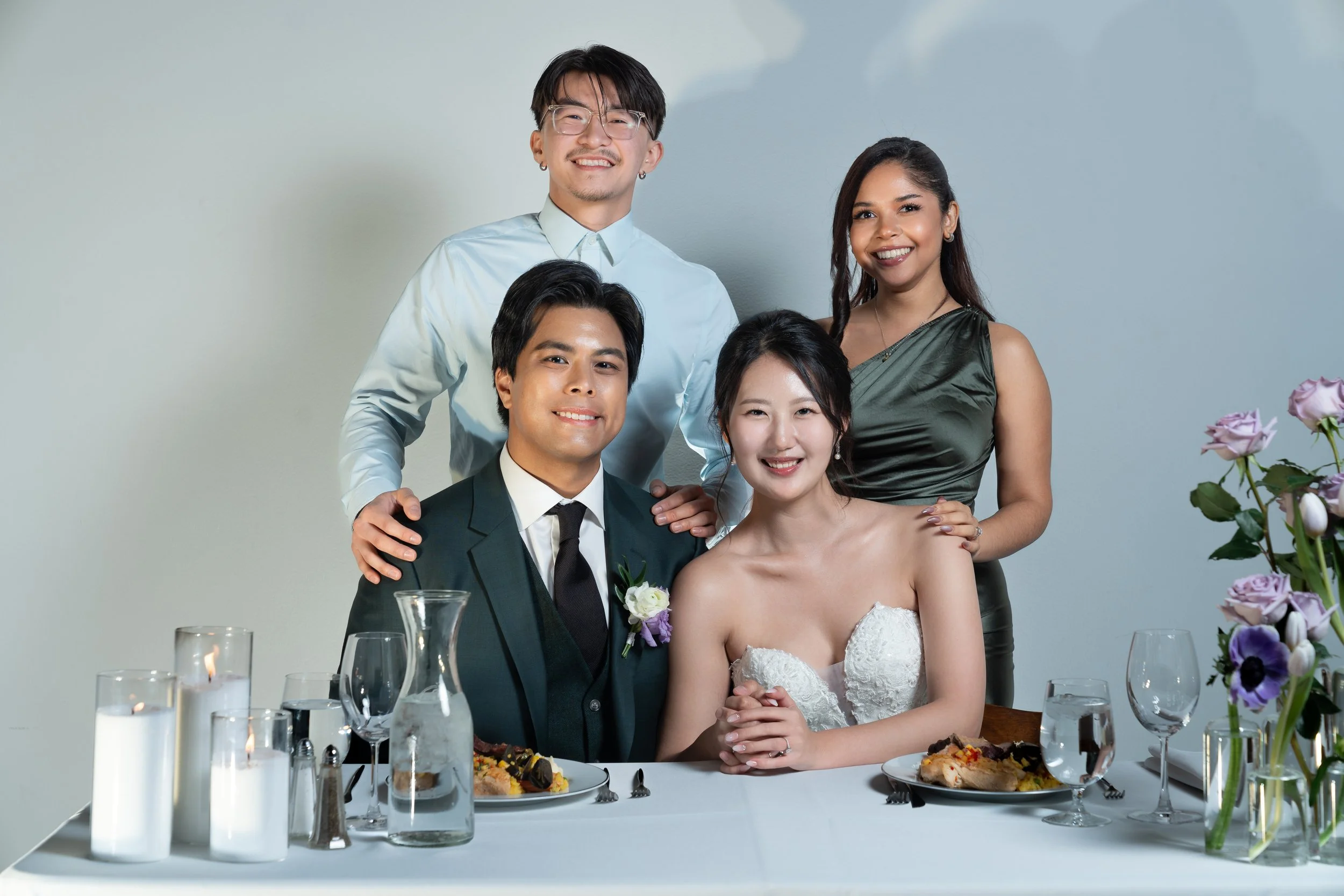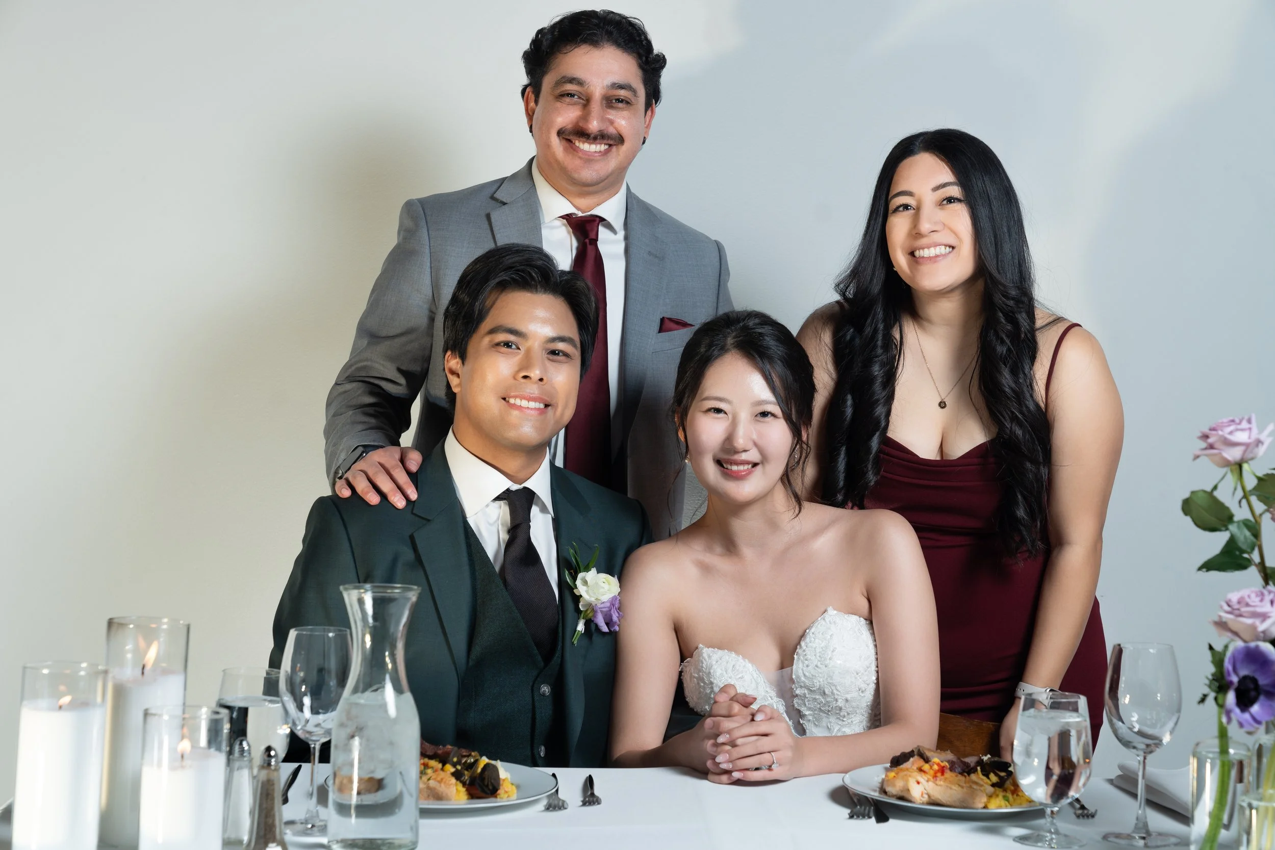 A group photo of four people, two men standing behind, and a bride and groom sitting at a table with plates of food and water glasses. The bride is wearing a white strapless gown and the groom is in a suit with a boutonniere. The background is a plai