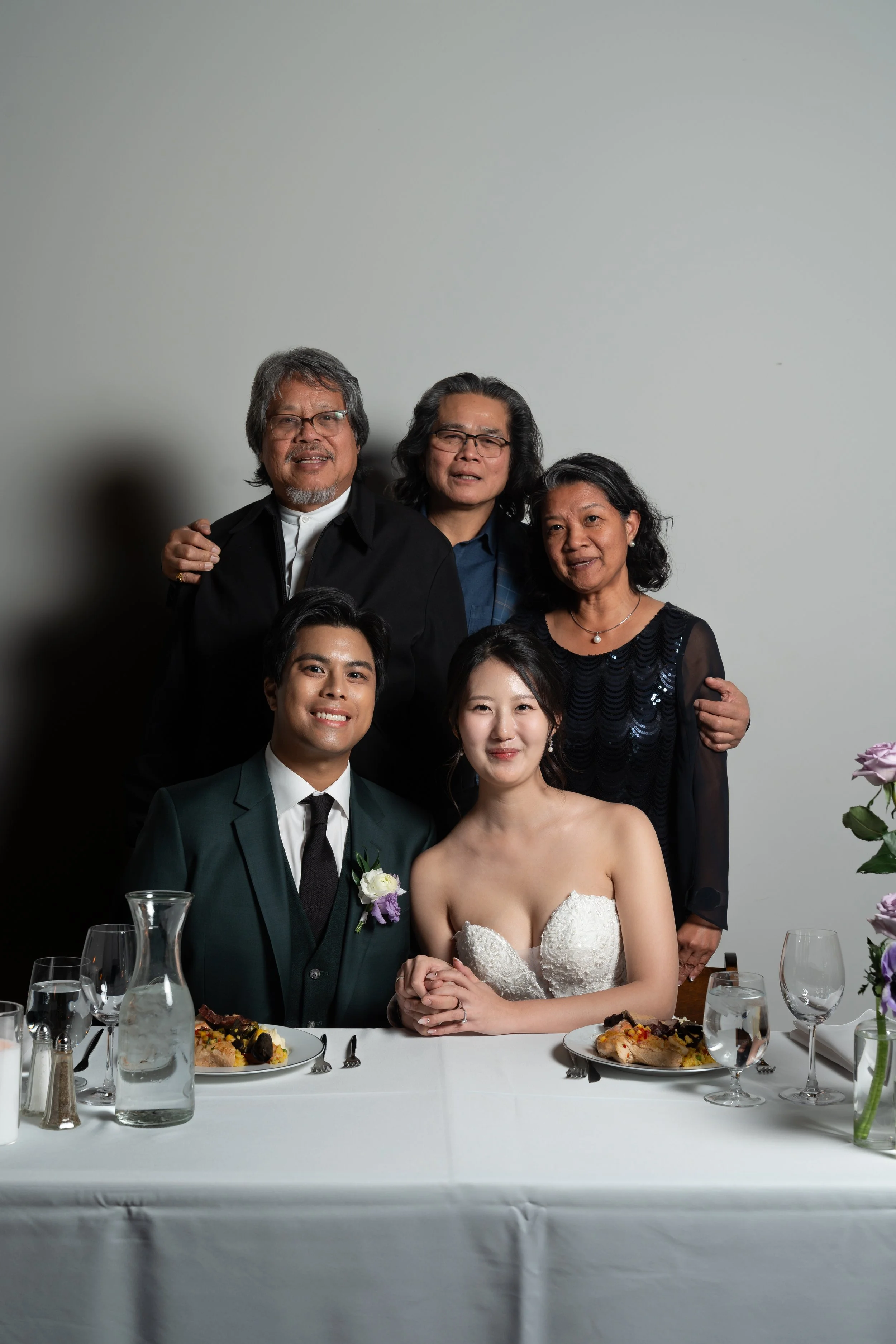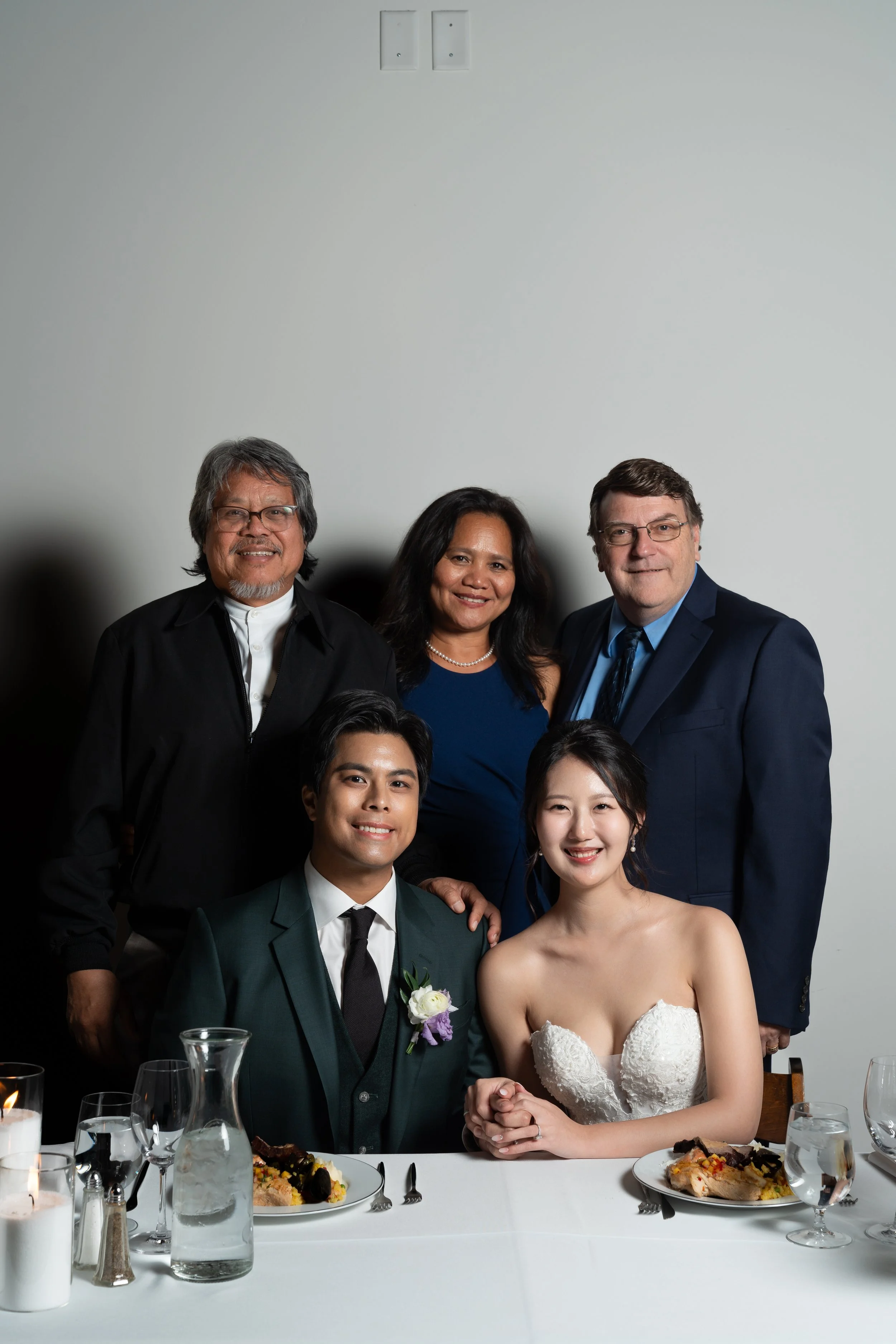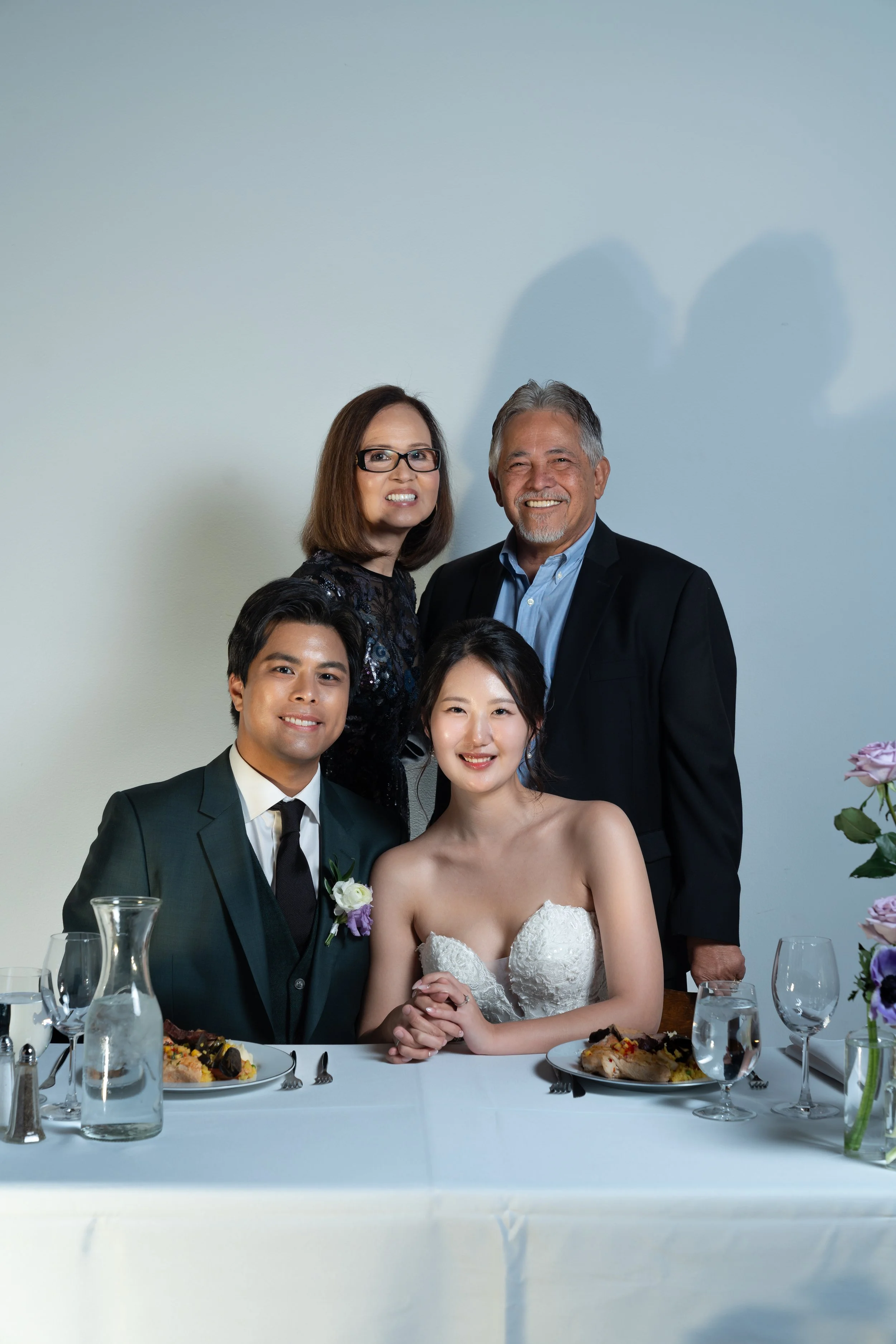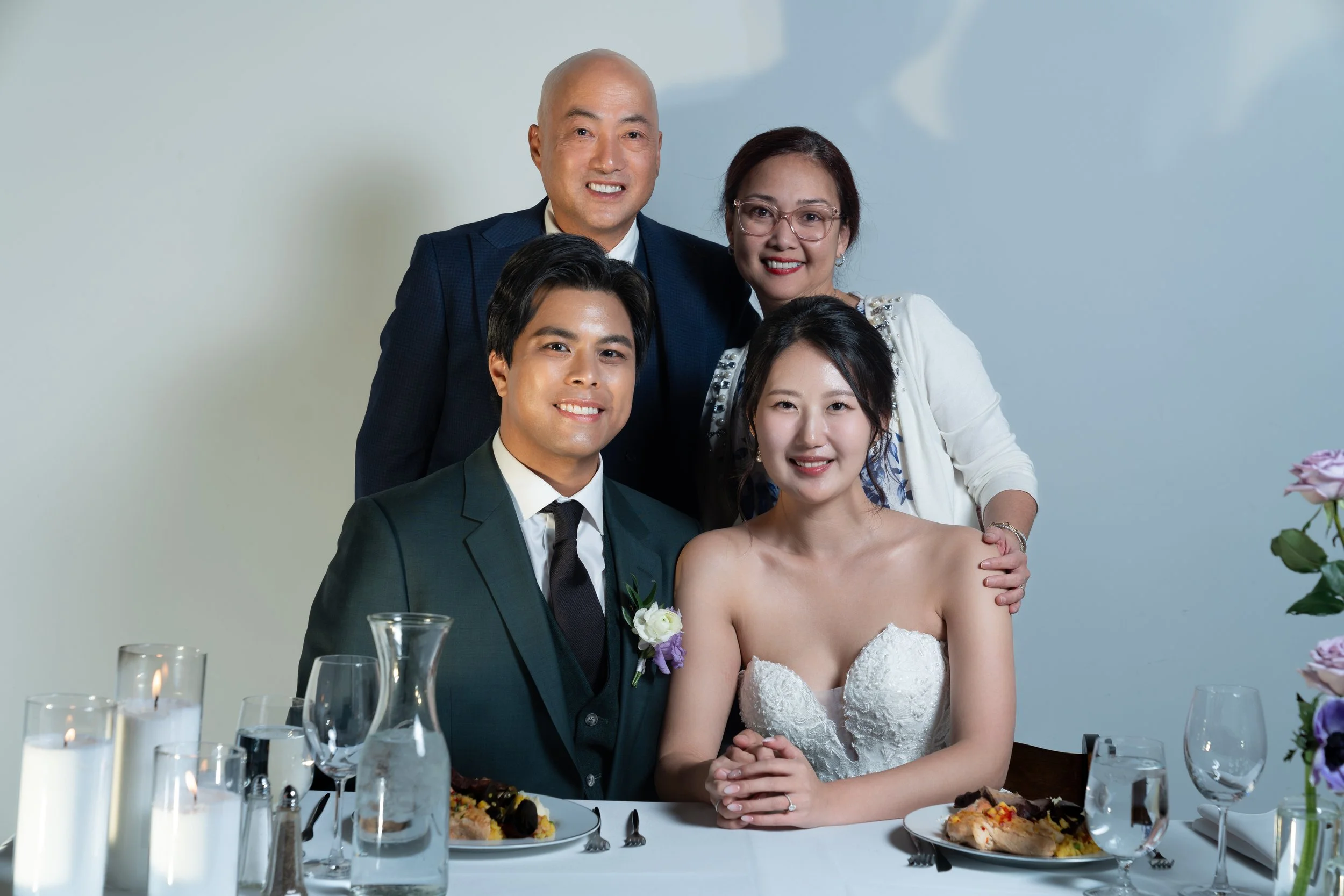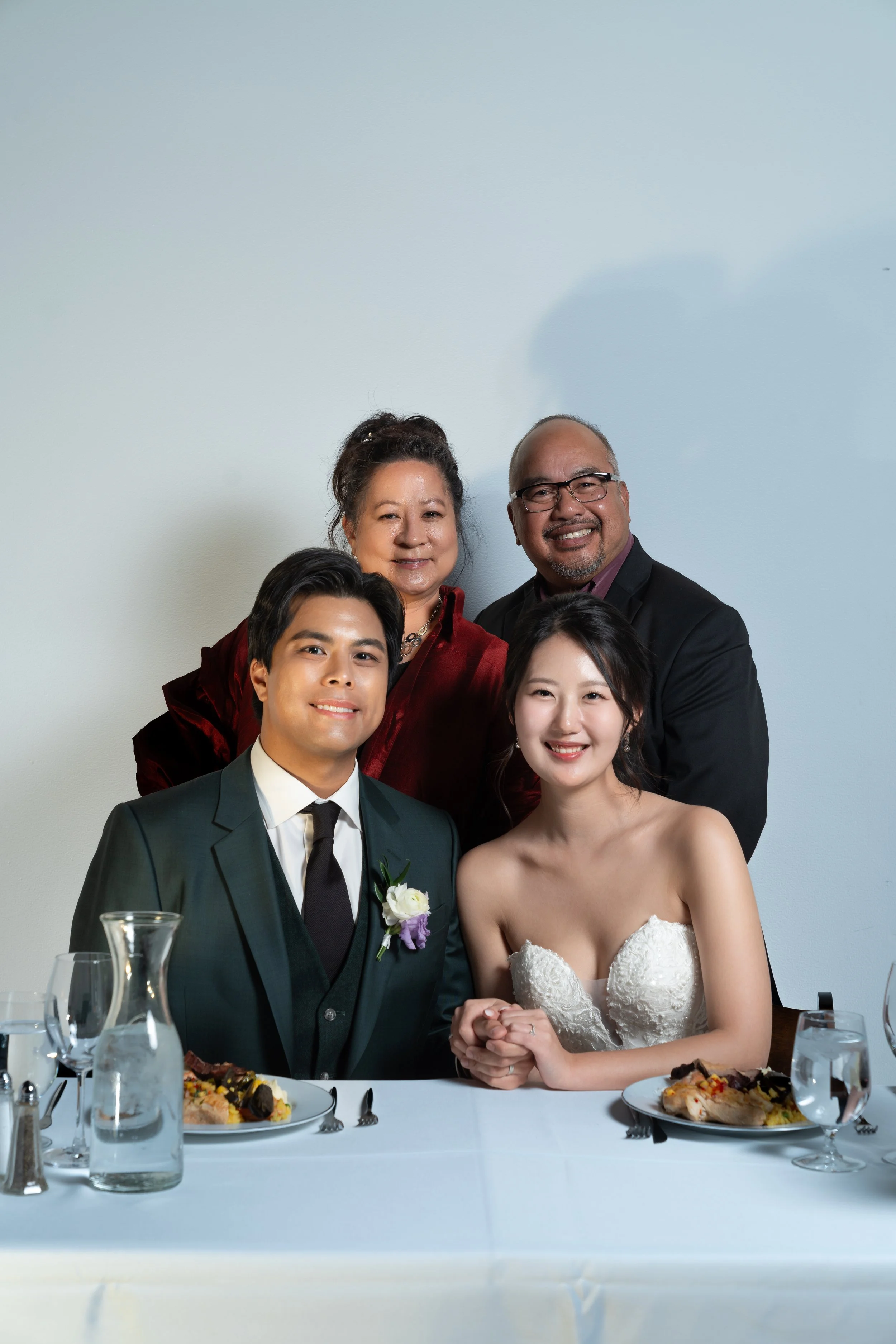 A group photo of four people, two men standing behind, and a bride and groom sitting at a table with plates of food and water glasses. The bride is wearing a white strapless gown and the groom is in a suit with a boutonniere. The background is a plai